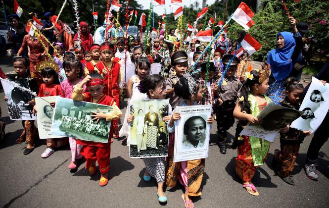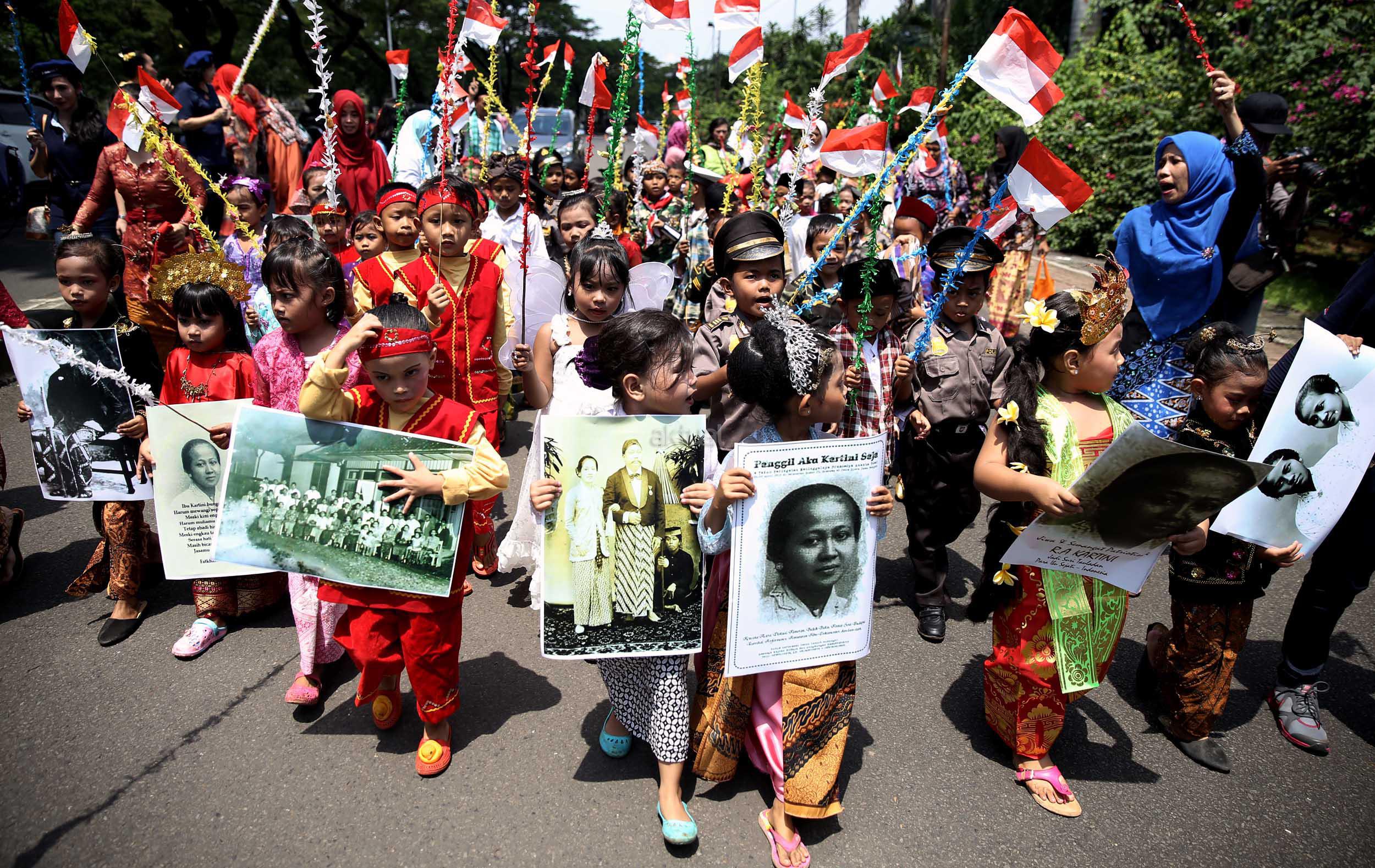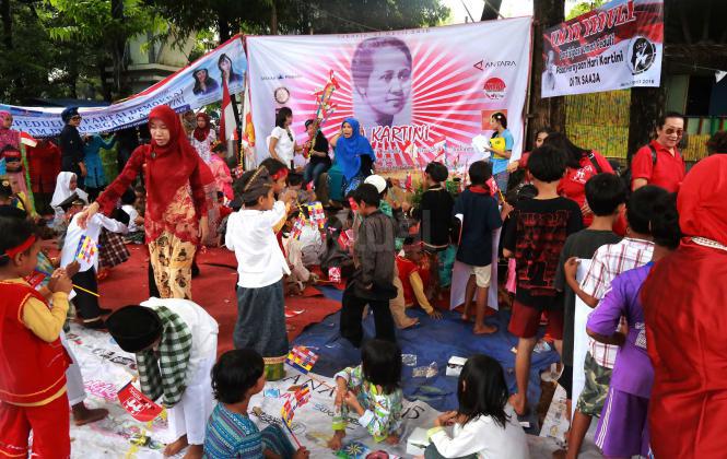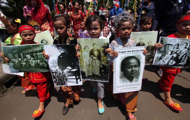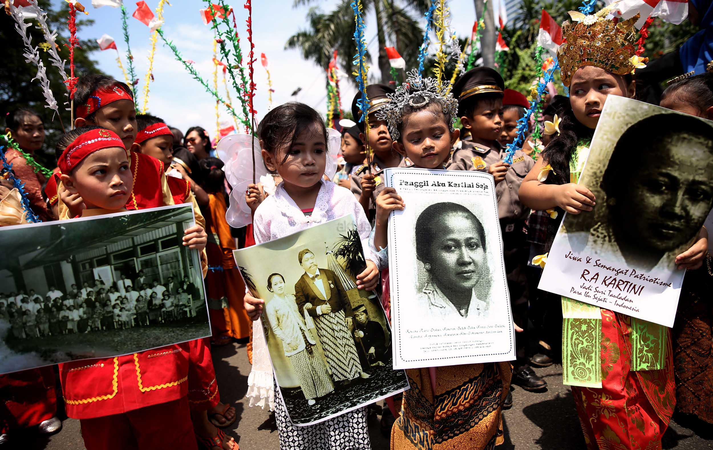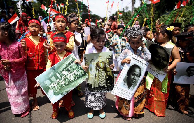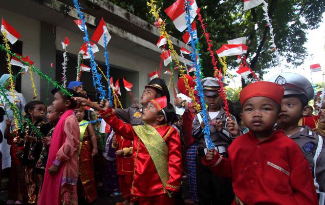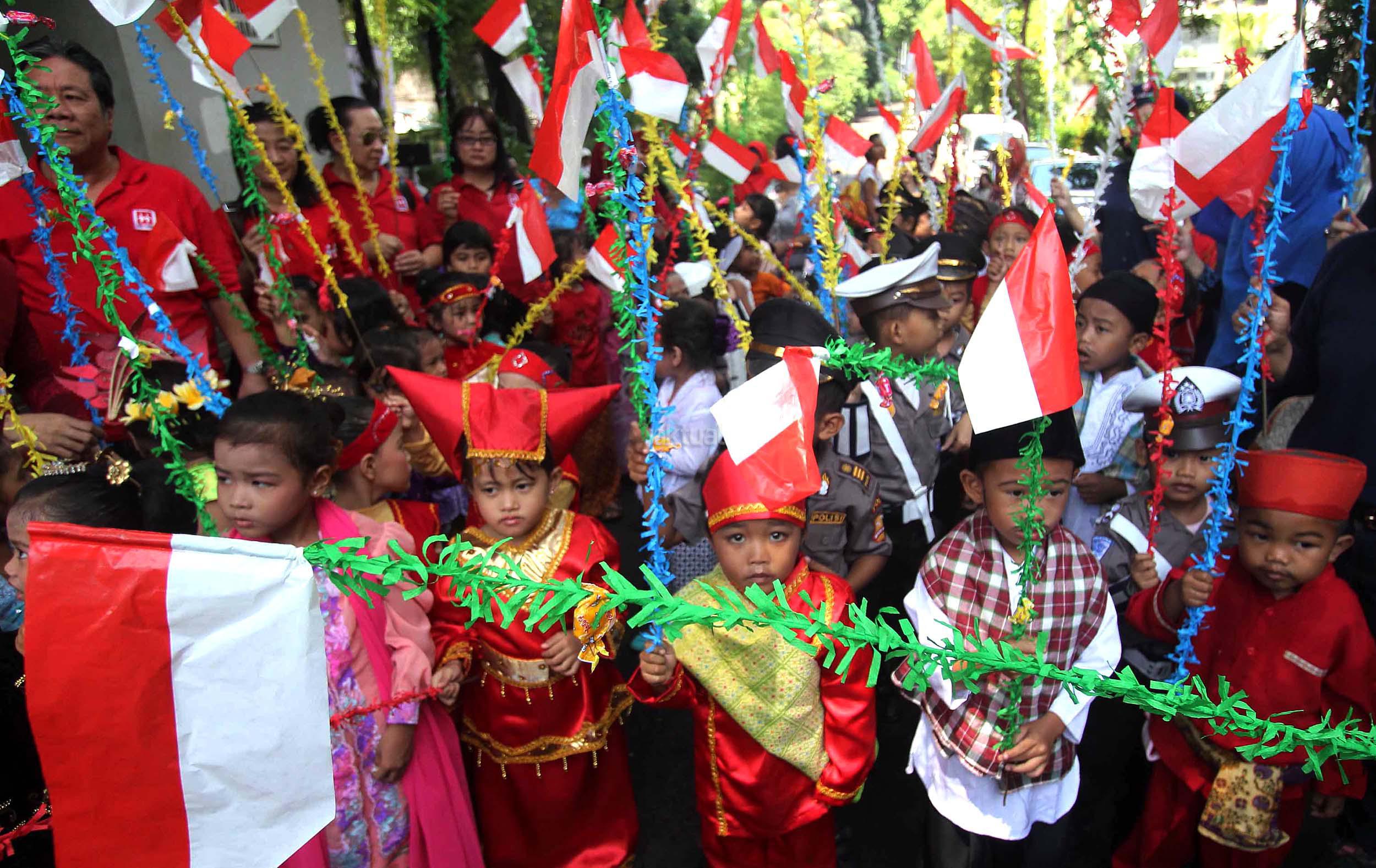 Murid-murid TK Sekolah Alternatif untuk Anak Jalanan (SAAJA) saat pawai sambil mengenakan pakaian adat di kawasan Kuningan, Jakarta, Kamis (21/4/2016). Pawai tersebut dilakukan dalam rangka merayakan Hari Kartini yang jatuh pada 21 April.