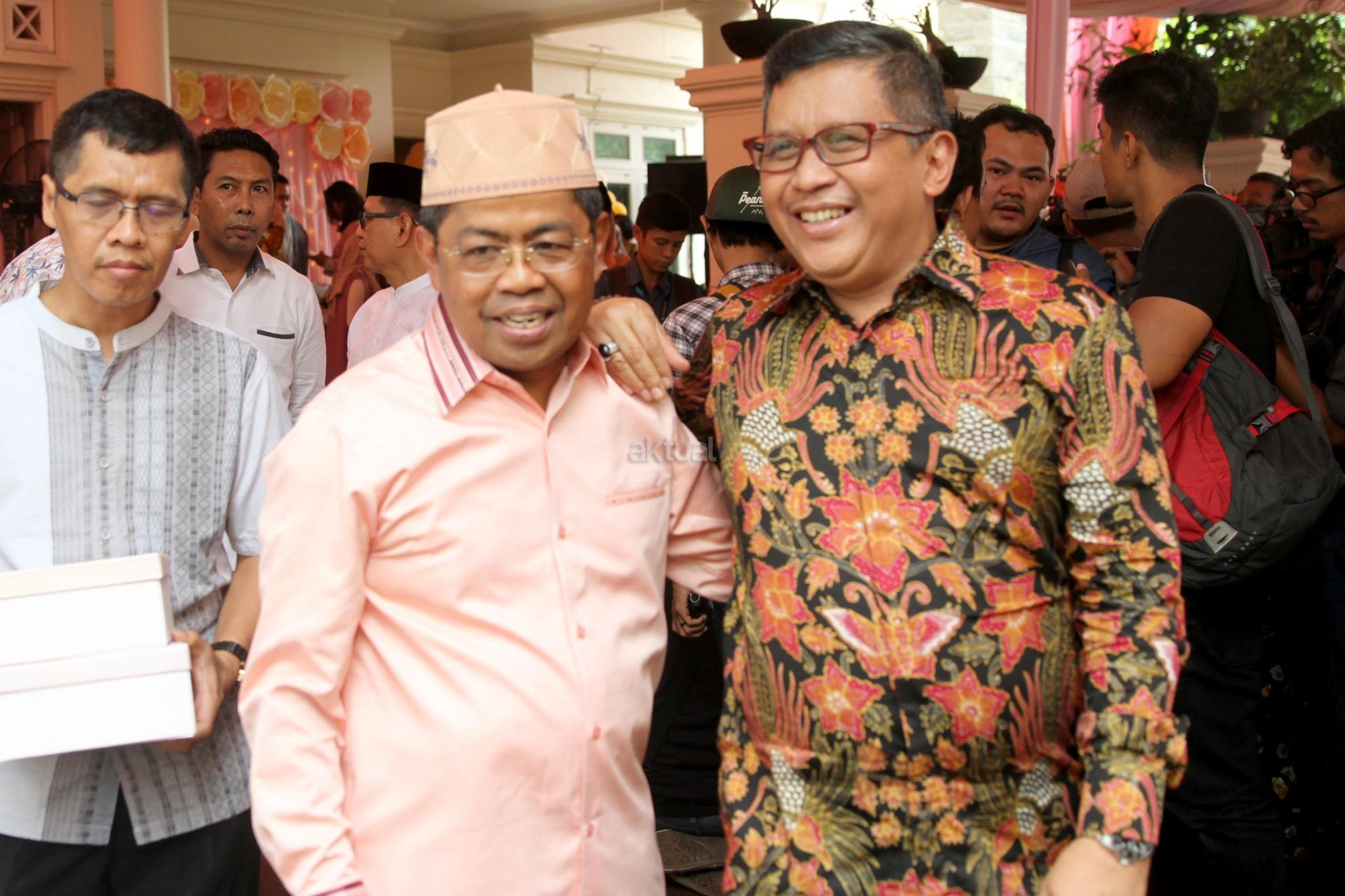 Sekjen Golkar Idrus Marham dan Sekjen PDIP Hasto Kristianto saat acara akikah anak ketiga Idrus Marham di Kediaman Idrus Marham, Cibubur Jakarta, Minggu (6/8). Acara syukuran yang dihadiri tokoh nasional tersebut sekaligus merupakan ajang silaturahmi dan membangun komunikasi politik. AKTUAL/Tino Oktaviano