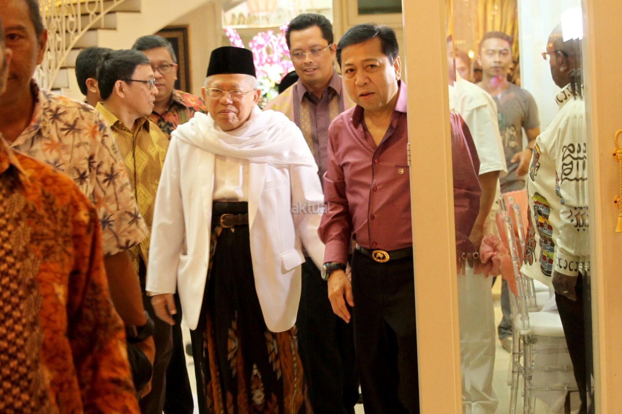 Ketua Umum Majelis Ulama Indonesia Maruf Amin dan Ketua Umum Golkar Setya Novanto berbincang saat menghadiri acara akikah anak ketiga Idrus Marham di Kediaman Idrus Marham, Cibubur Jakarta, Minggu (6/8). Acara syukuran yang dihadiri tokoh nasional tersebut sekaligus merupakan ajang silaturahmi dan membangun komunikasi politik. AKTUAL/Tino Oktaviano