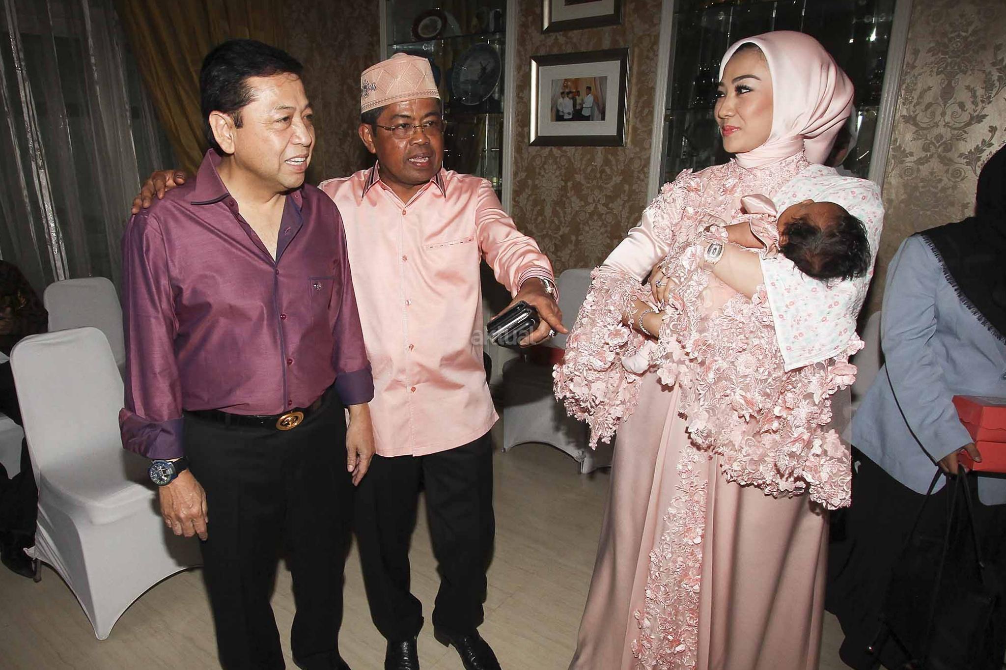 Sekjen Golkar Idrus Marham dan Istri berbincang dengan Ketua Umum Golkar Setya Novanto saat acara akikah anak ketiga Idrus Marham di Kediaman Idrus Marham, Cibubur Jakarta, Minggu (6/8). Acara syukuran yang dihadiri tokoh nasional tersebut sekaligus merupakan ajang silaturahmi dan membangun komunikasi politik. AKTUAL/Tino Oktaviano