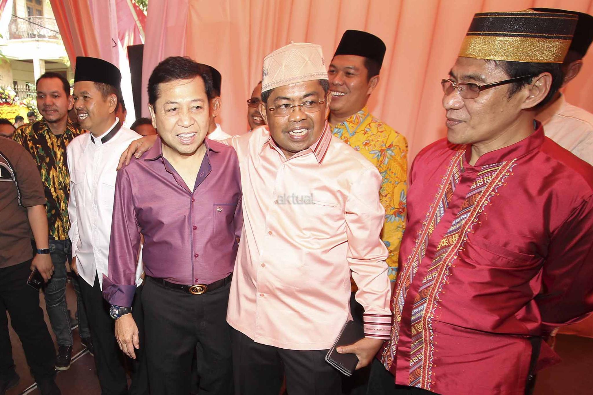 Ketua Umum Golkar Setya Novanto, Sekjen Golkar Idrus Marham dan Bupati Purwakarta Dedi Mulyadi saat menghadiri acara akikah anak ketiga Idrus Marham di Kediaman Idrus Marham, Cibubur Jakarta, Minggu (6/8). Acara syukuran yang dihadiri tokoh nasional tersebut sekaligus merupakan ajang silaturahmi dan membangun komunikasi politik. AKTUAL/Tino Oktaviano