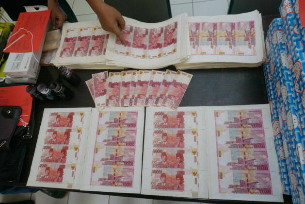 Kepolisian Polres Tangsel menunjukan barang bukti kejahatan pembuatan uang palsu saat ungkap kasus di Polsek Pagedangan, Kabupaten Tangerang, Banten, Kamis (14/7). Kepolisian setempat mengamankan dua pelaku kejahatan pembuatan uang palsu berinisial WS dan HD berikut barang bukti berupa alat pembuatan dan ratusan juta rupiah uang palsu. ANTARA FOTO/Lucky R/kye/16