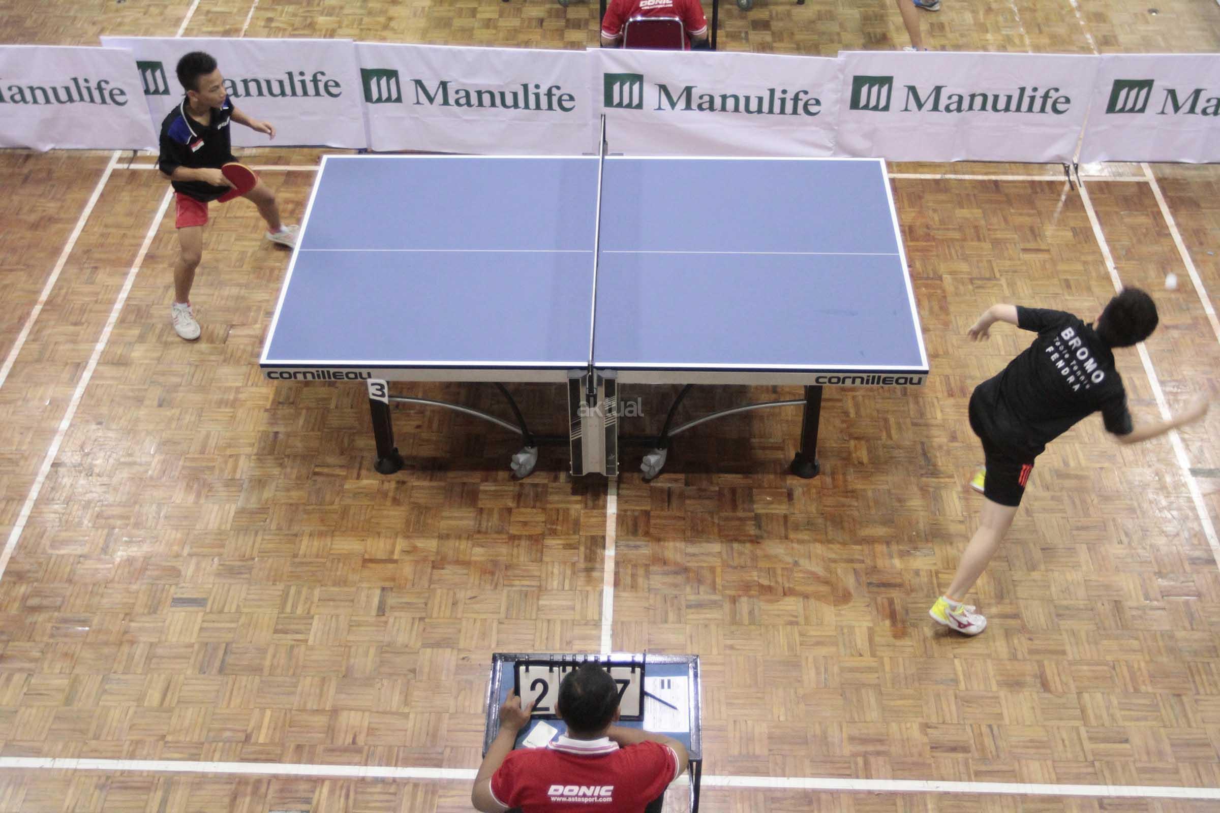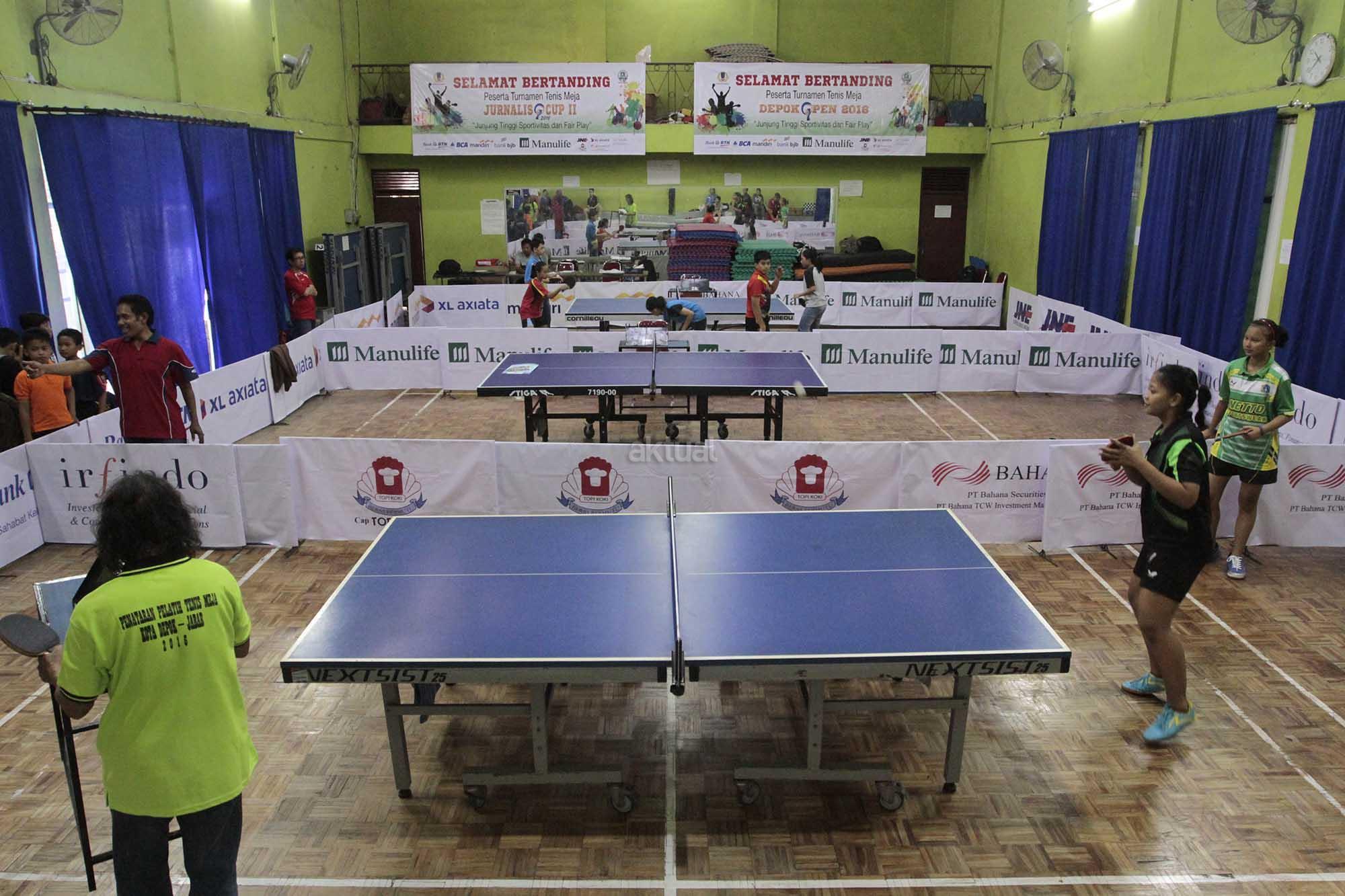 Peserta saat bertanding di Kejuaraan Tenis Meja Jurnalis Cup II di GOR Tenis Meja Koni Kota Depok, Depok, Jawa Barat, Minggu (11/12). Kejuaraan tenis meja yang berlangsung selama tiga hari itu dan dibagi menjadi 4 kategori masing maasig Kategori Pemula, Kadet Putra Putri, Kategori Pelajar Kota Depok (SD,SMP,SMA) serta Media/Jurnalis Beregu tersebut dimaksudkan guna mengaktifkan dan memasyarakatkan olahraga tenis meja,sekaligus ikut berperan meningkatkan prestasi olah raga nasional serta menjaga kesatuan dan persatuan bangsa. AKTUAL/Eko S Hilman
