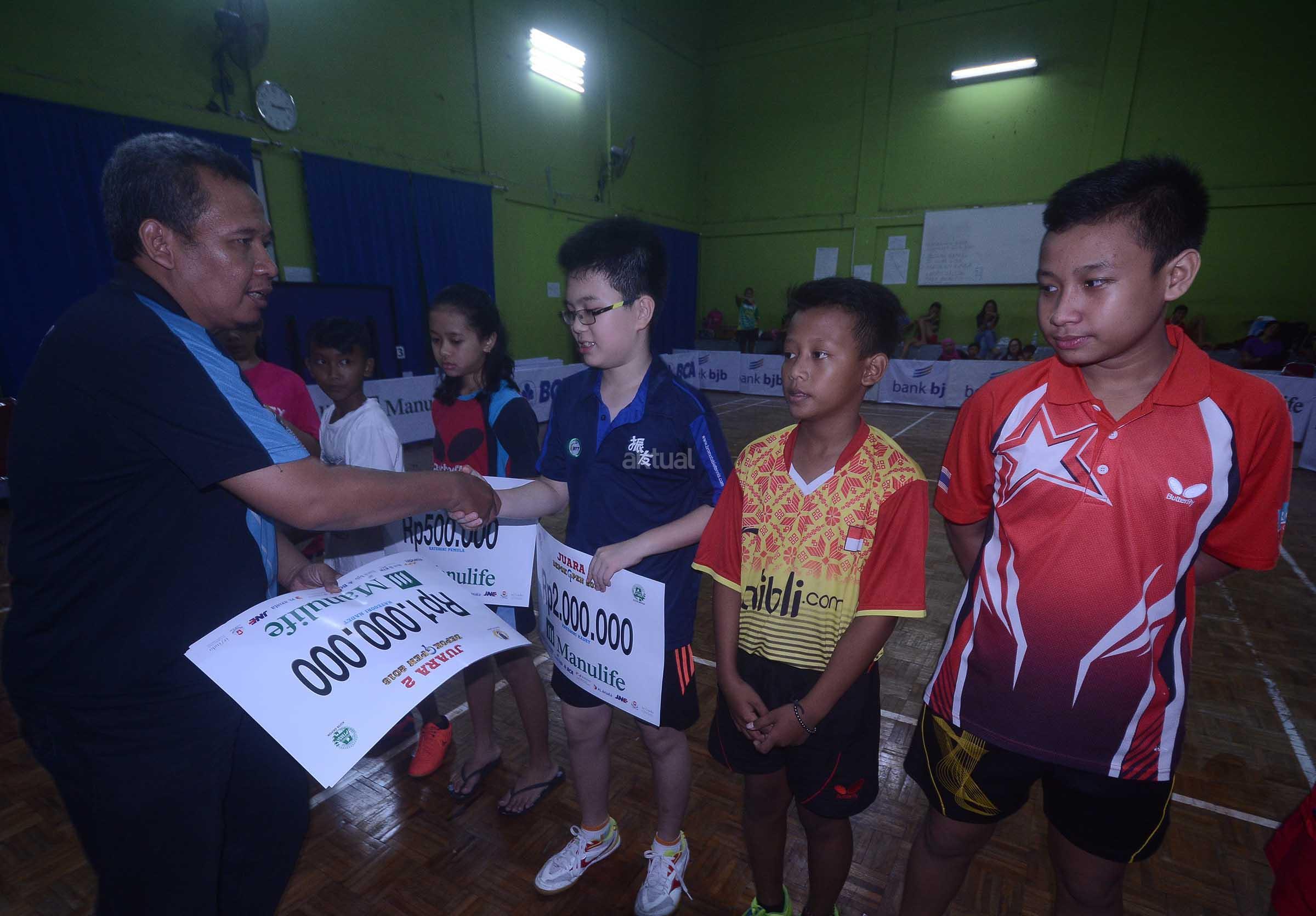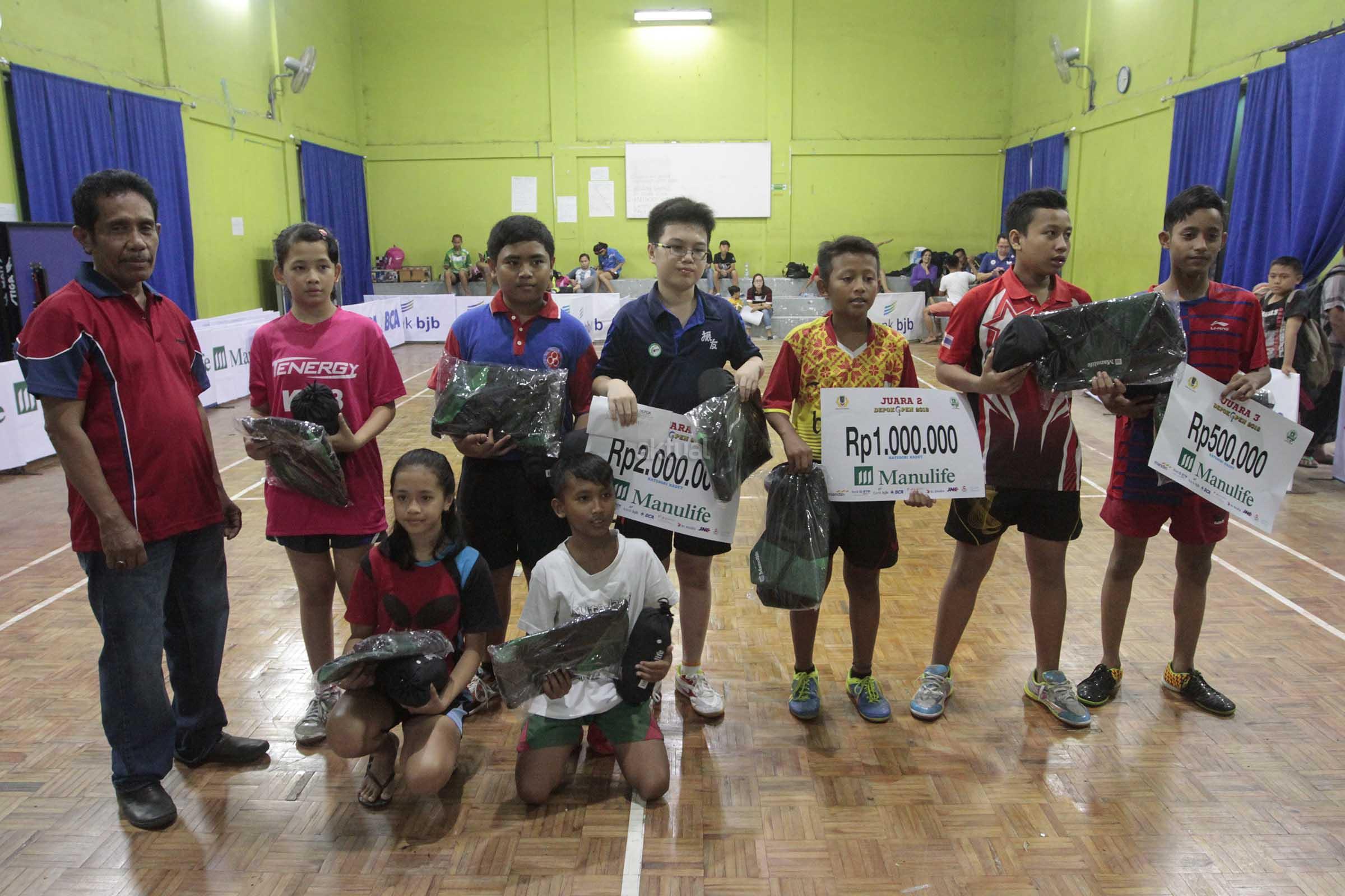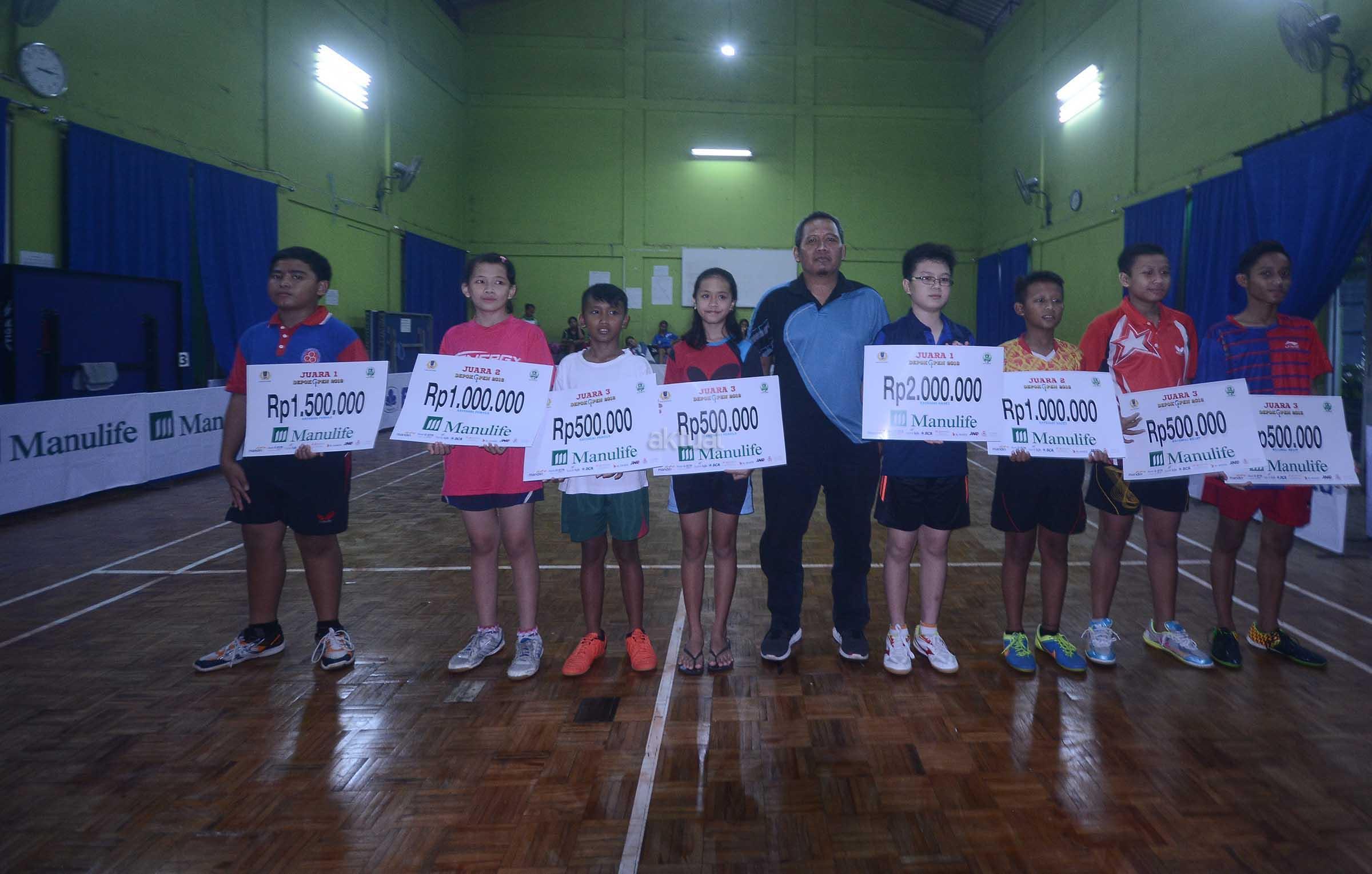 Para pemenang usai menerima hadiah dan uang pembinaan usai bertanding di Kejuaraan Tenis Meja Jurnalis Cup II di GOR Tenis Meja Koni Kota Depok ,Depok, Jawa Barat, Minggu (11/12). Kejuaraan tenis meja yang berlangsung selama tiga hari itu dan dibagi menjadi 4 kategori masing maasig Kategori Pemula, Kadet Putra Putri, Kategori Pelajar Kota Depok (SD,SMP,SMA) serta Media/Jurnalis Beregu tersebut dimaksudkan guna mengaktifkan dan memasyarakatkan olahraga tenis meja,sekaligus ikut berperan meningkatkan prestasi olah raga nasional serta menjaga kesatuan dan persatuan bangsa. AKTUAL/Eko S Hilman