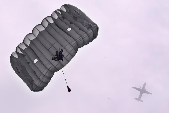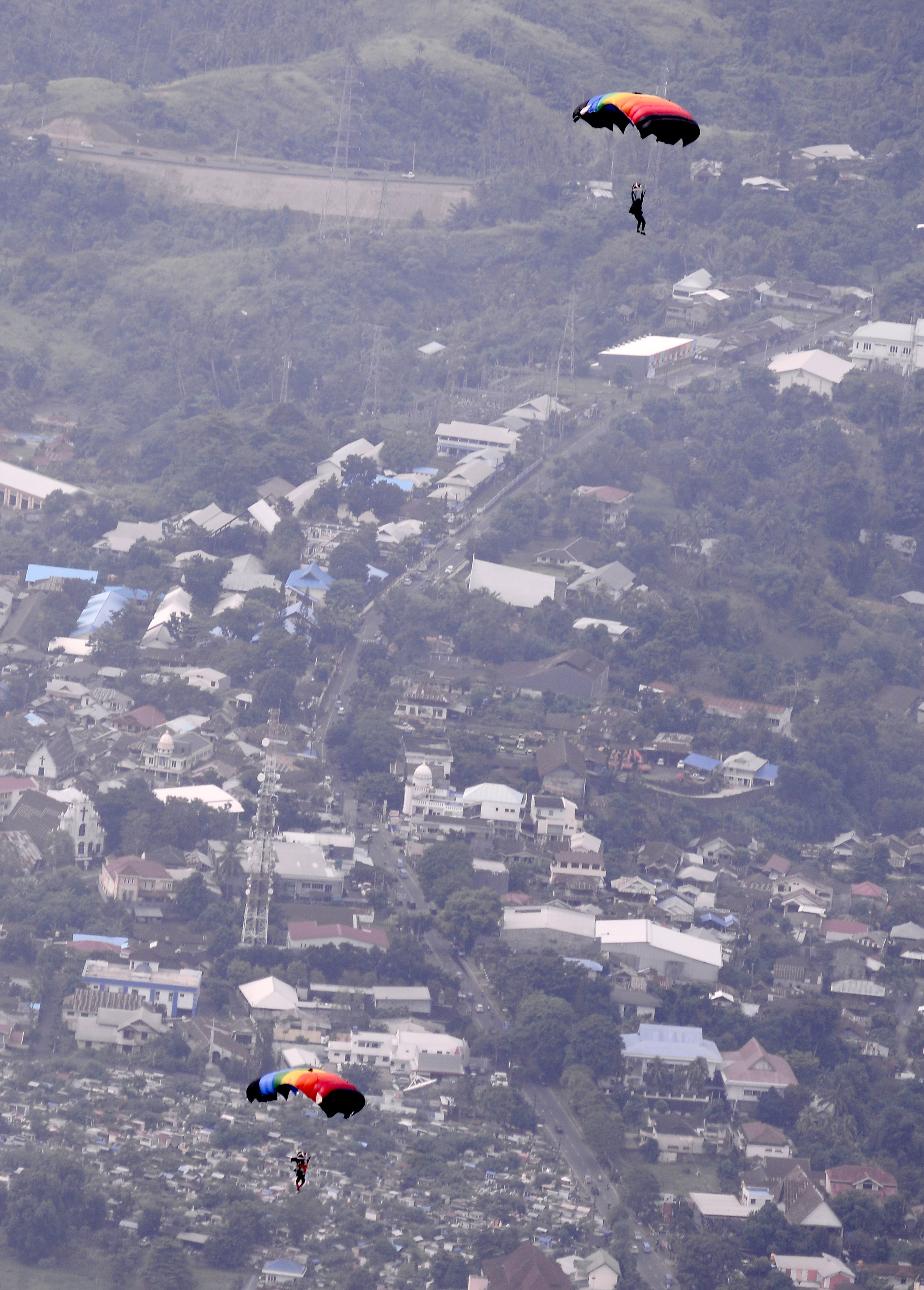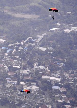 Atlet terjun payung mengendalikan parasutnya pada Kejuaraan Terbuka terjun Payung Internasional Manado 2016 di Manado, Sulawesi Utara, Rabu (18/5). Kejuaraan yang berlangsung 14-23 Mei 2016 tersebut diikuti atlet dari sejumlah negara seperti Irak, Australia, dan Malaysia yang melombakan kategori ketepatan mendarat perorangan dan beregu. ANTARA FOTO/Adwit B Pramono/aww/16.