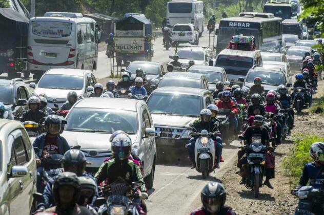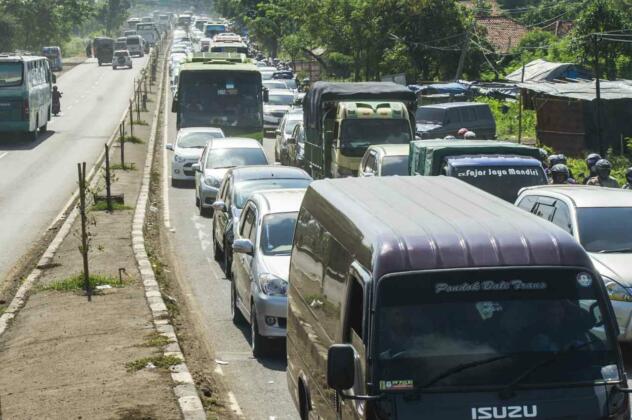 Ribuan kendaraan terjebak kemacetan di Jalan Panturan, Cirebon, Jawa Barat, Senin (4/7). Pada H-2 Lebaran, volume kendaraan pemudik yang melintas di Jalur Pantura menuju daerah di Jawa Tengah meningkat dan mengalami kemacetan parah. ANTARA FOTO/M Agung Rajasa/foc/16.