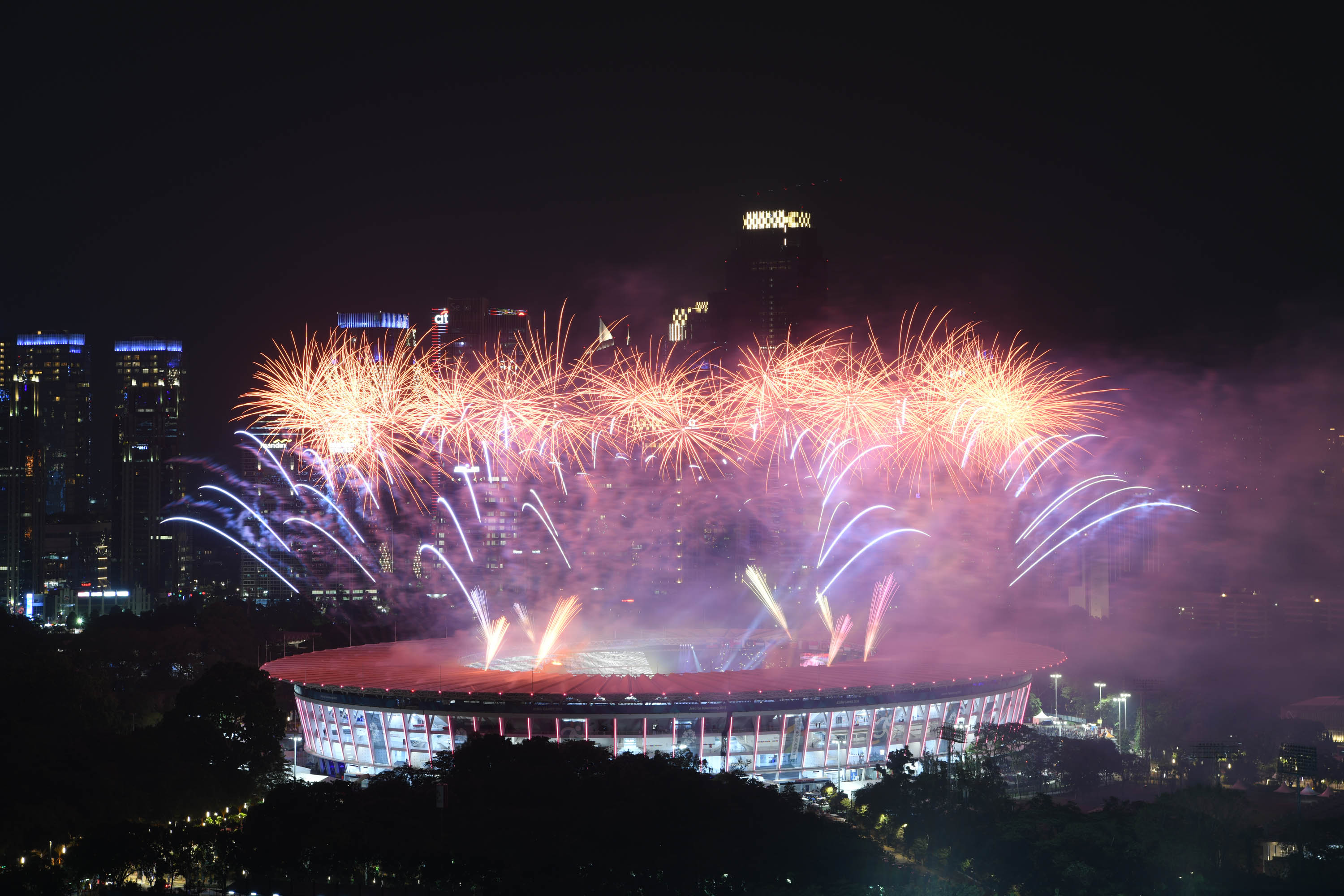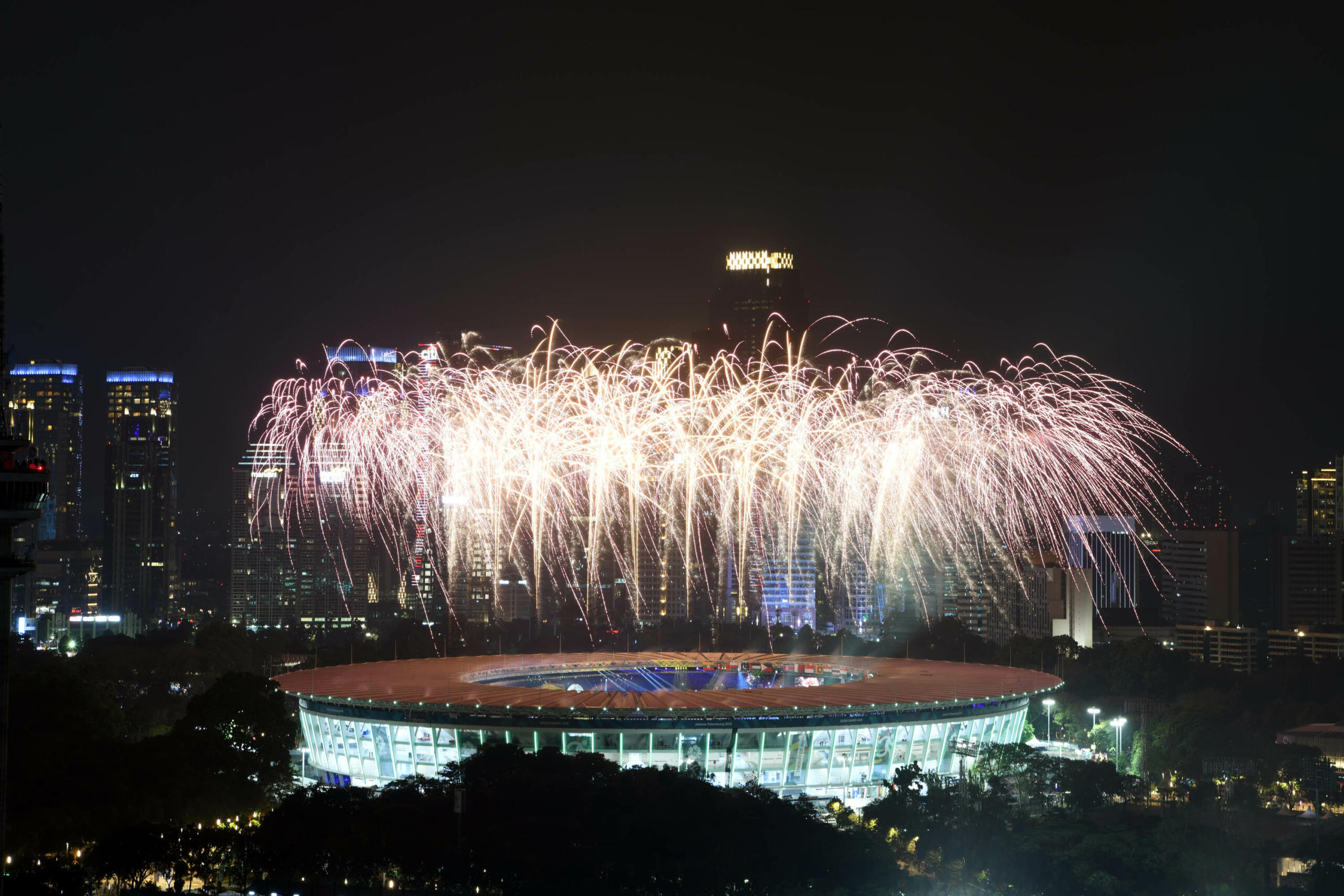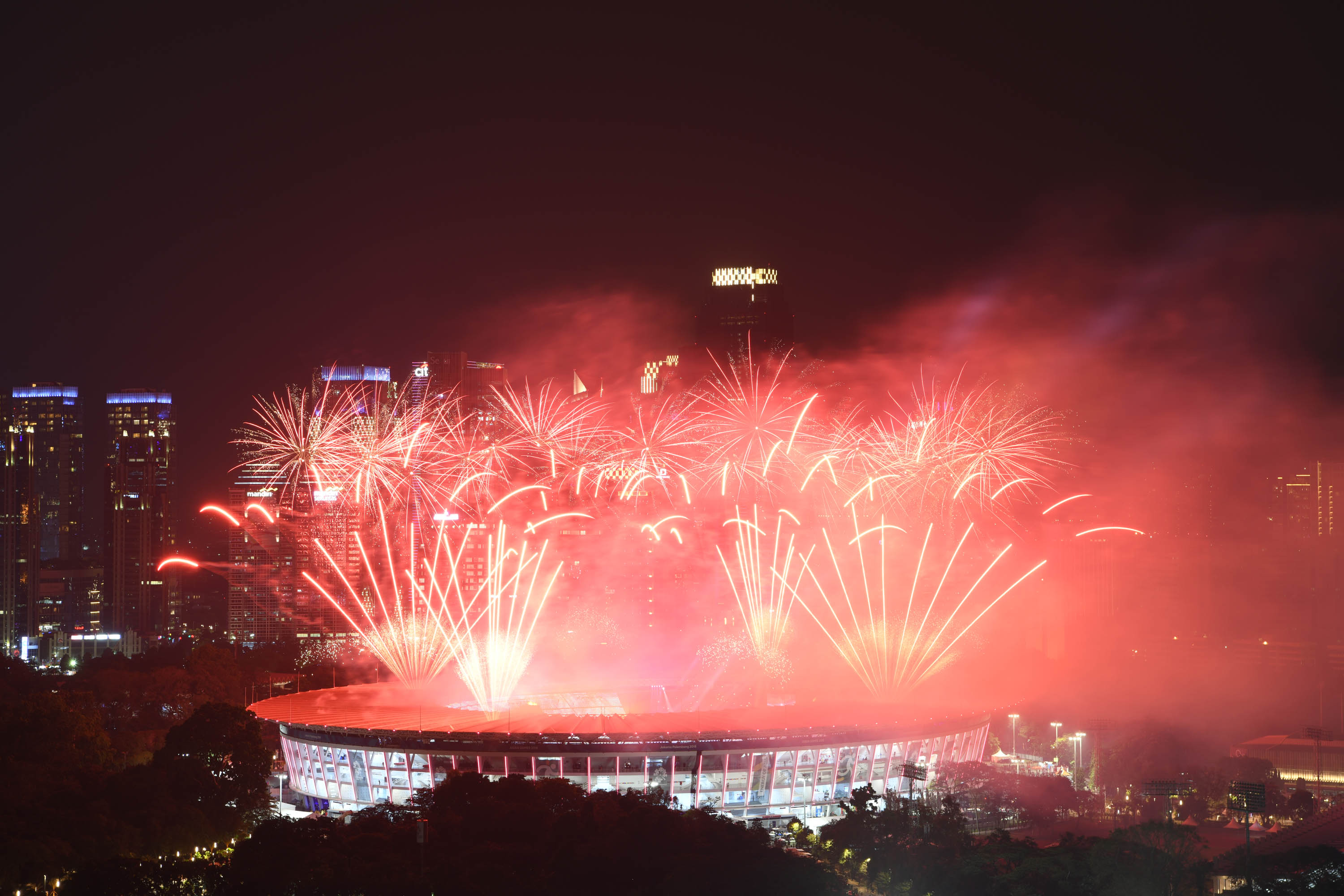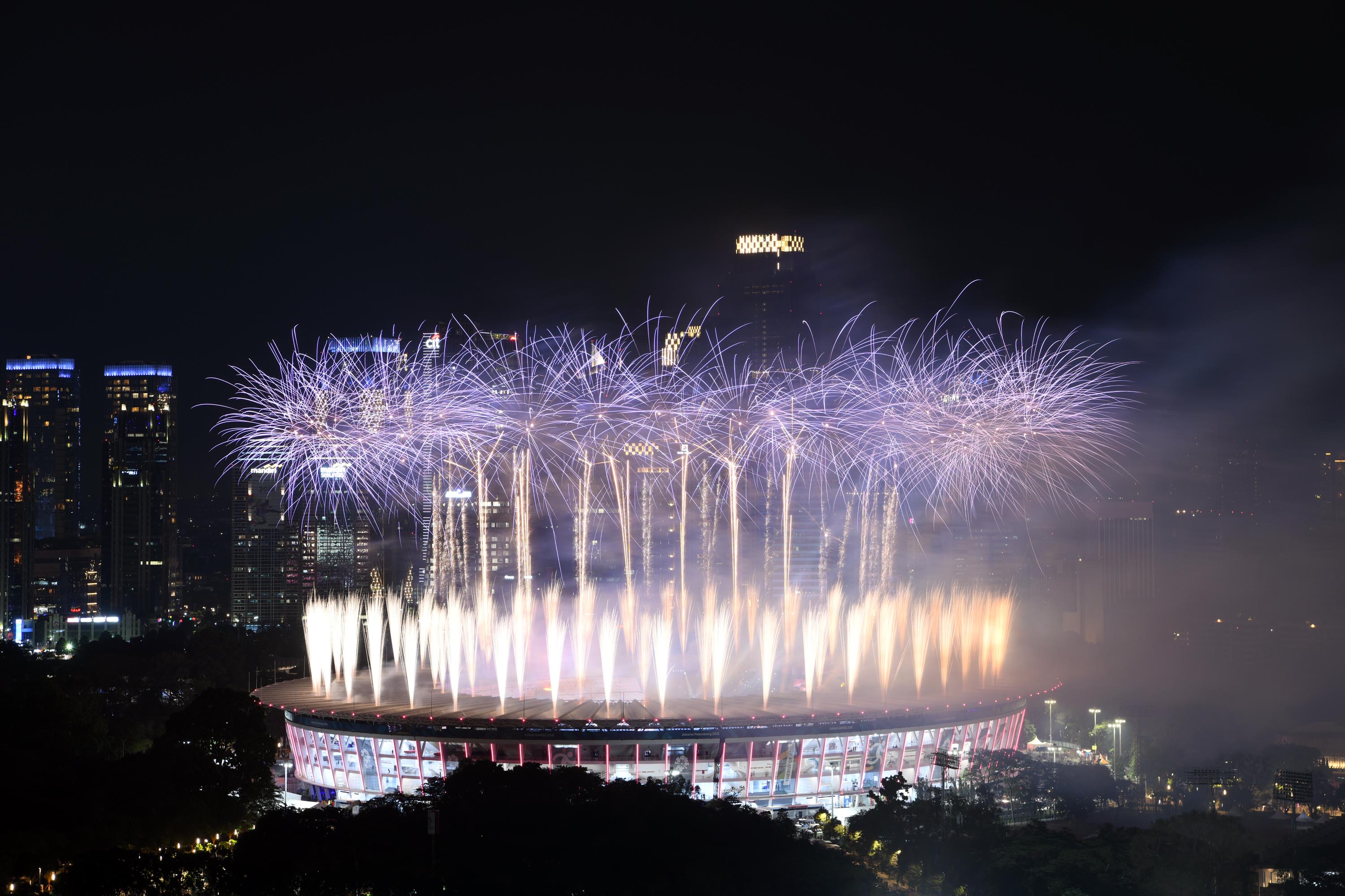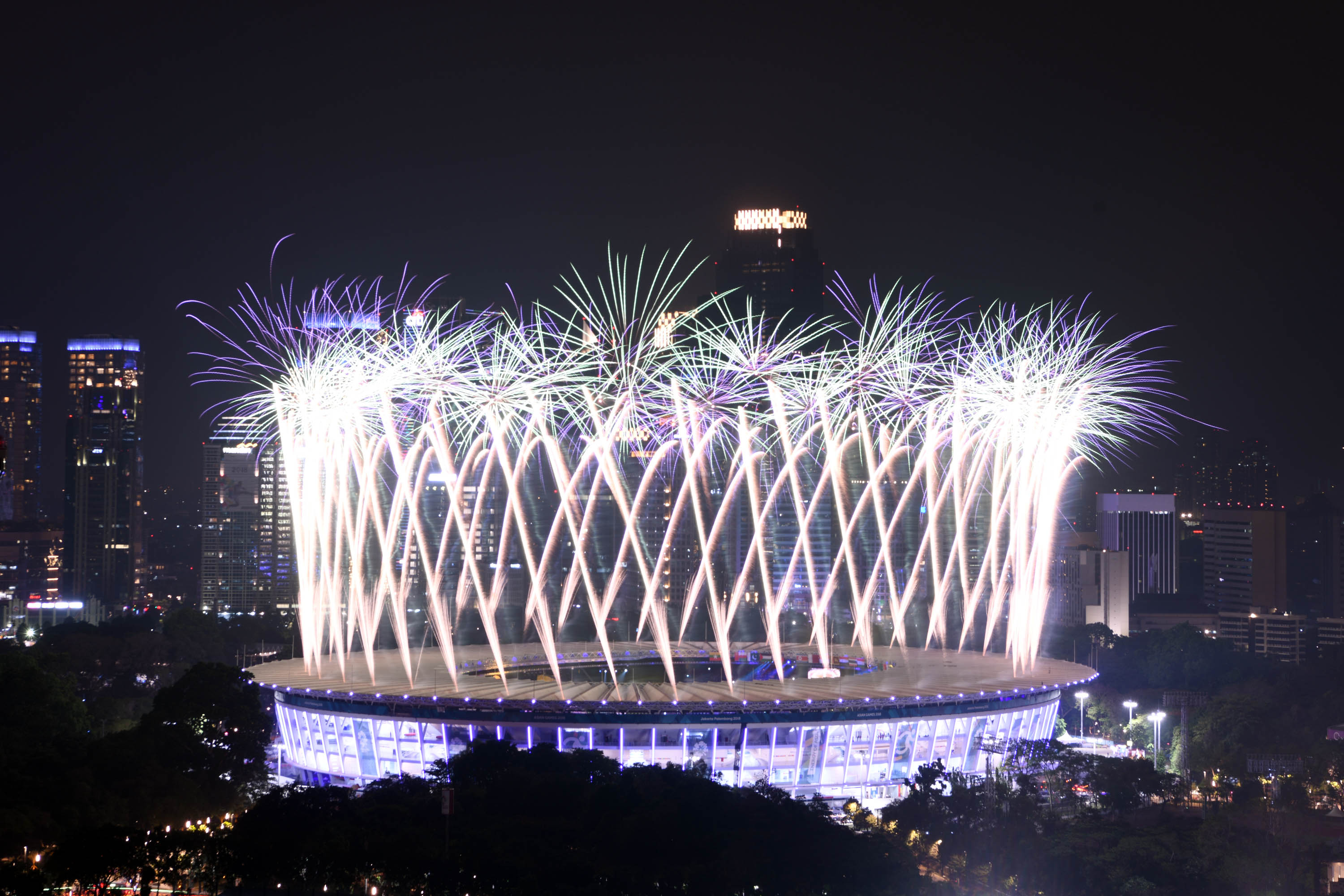 Kembang Api menghiasi udara di atas Stadion Utama Gelora Bung Karno (GBK) Senayan, Jakarta, Sabtu (18/8), malam. Asian Games 2018 yang diikuti oleh 45 Negera Asia akan berlangsung di Jakarta dan Palembang secara resmi dimulai 18 Agustus 2018 dan akan ditutup pada 2 September 2018. AKTUAL/Pool