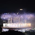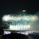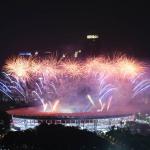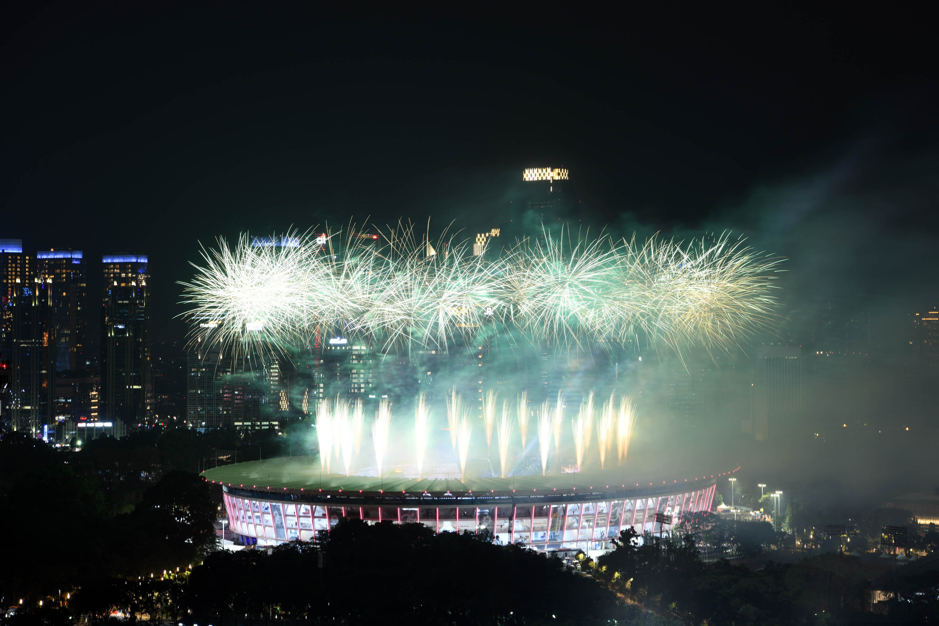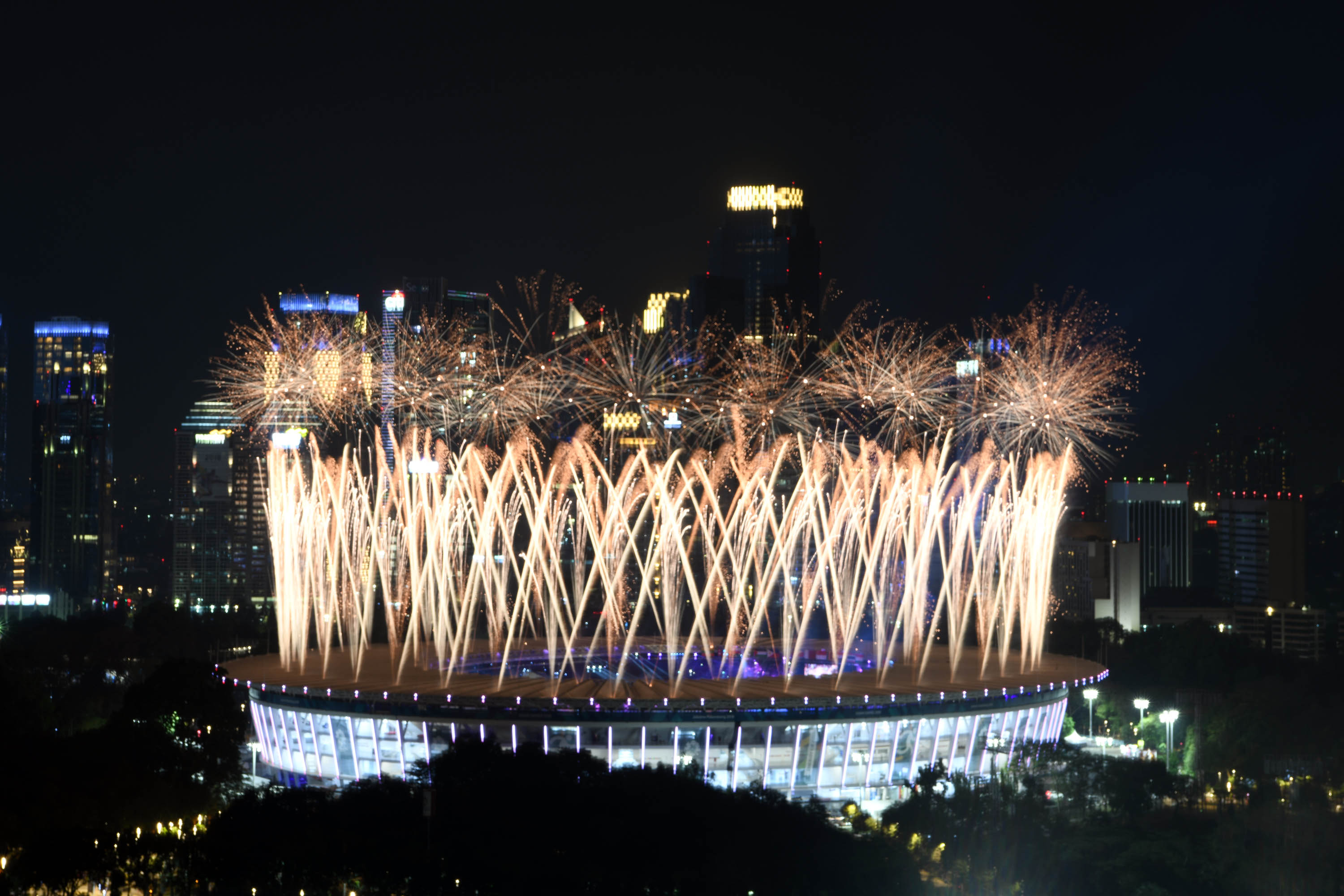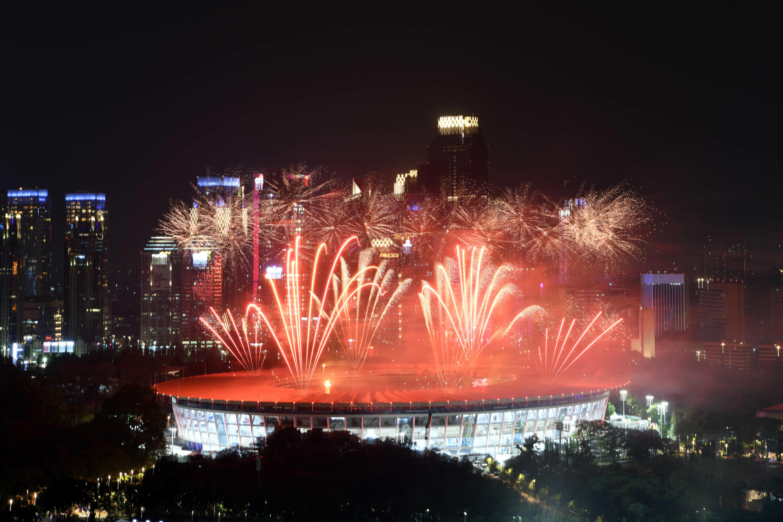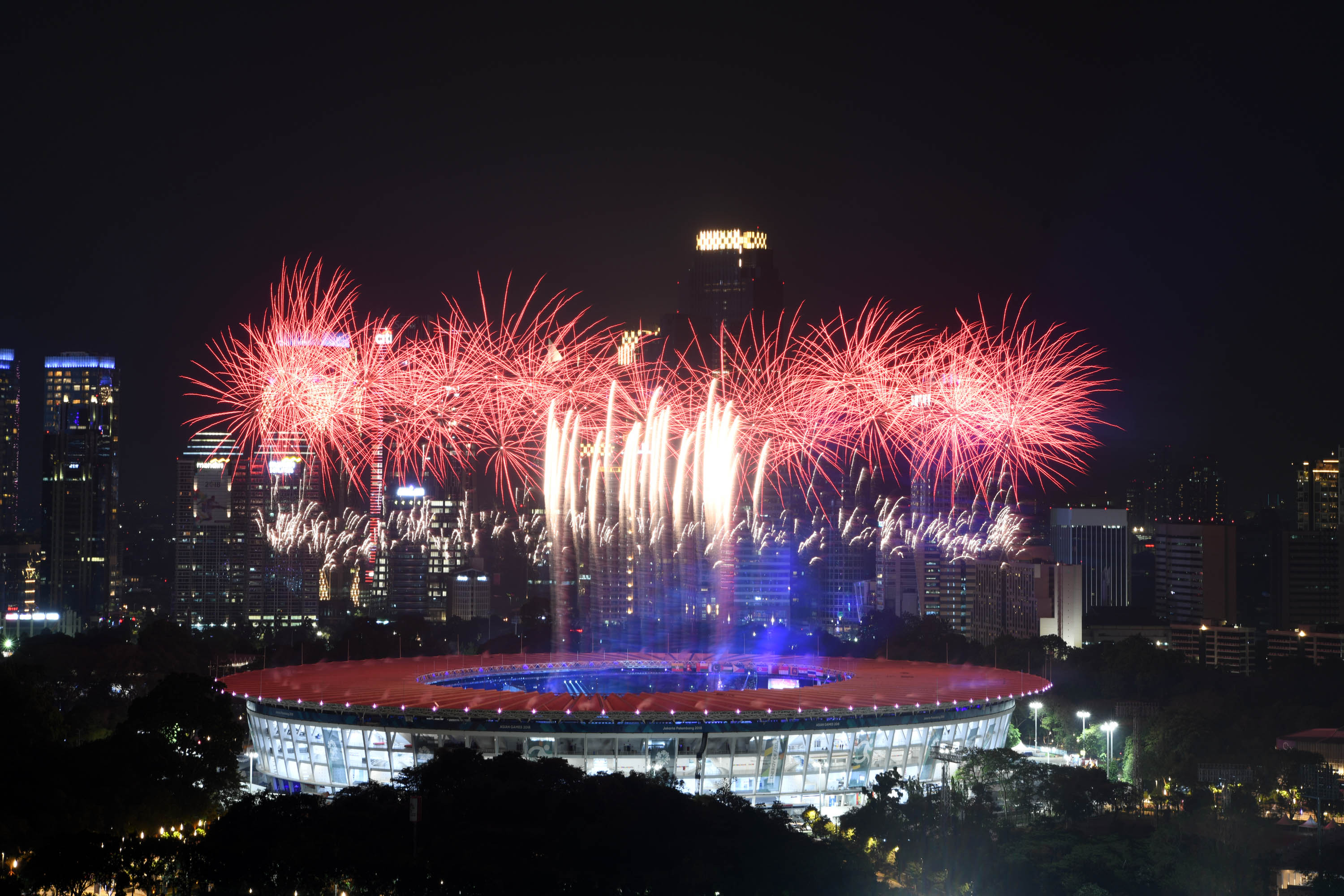 Kembang Api menghiasi udara di atas Stadion Utama Gelora Bung Karno (GBK) Senayan, Jakarta, Sabtu (18/8), malam. Asian Games 2018 yang diikuti oleh 45 Negera Asia akan berlangsung di Jakarta dan Palembang secara resmi dimulai 18 Agustus 2018 dan akan ditutup pada 2 September 2018. AKTUAL/Pool
