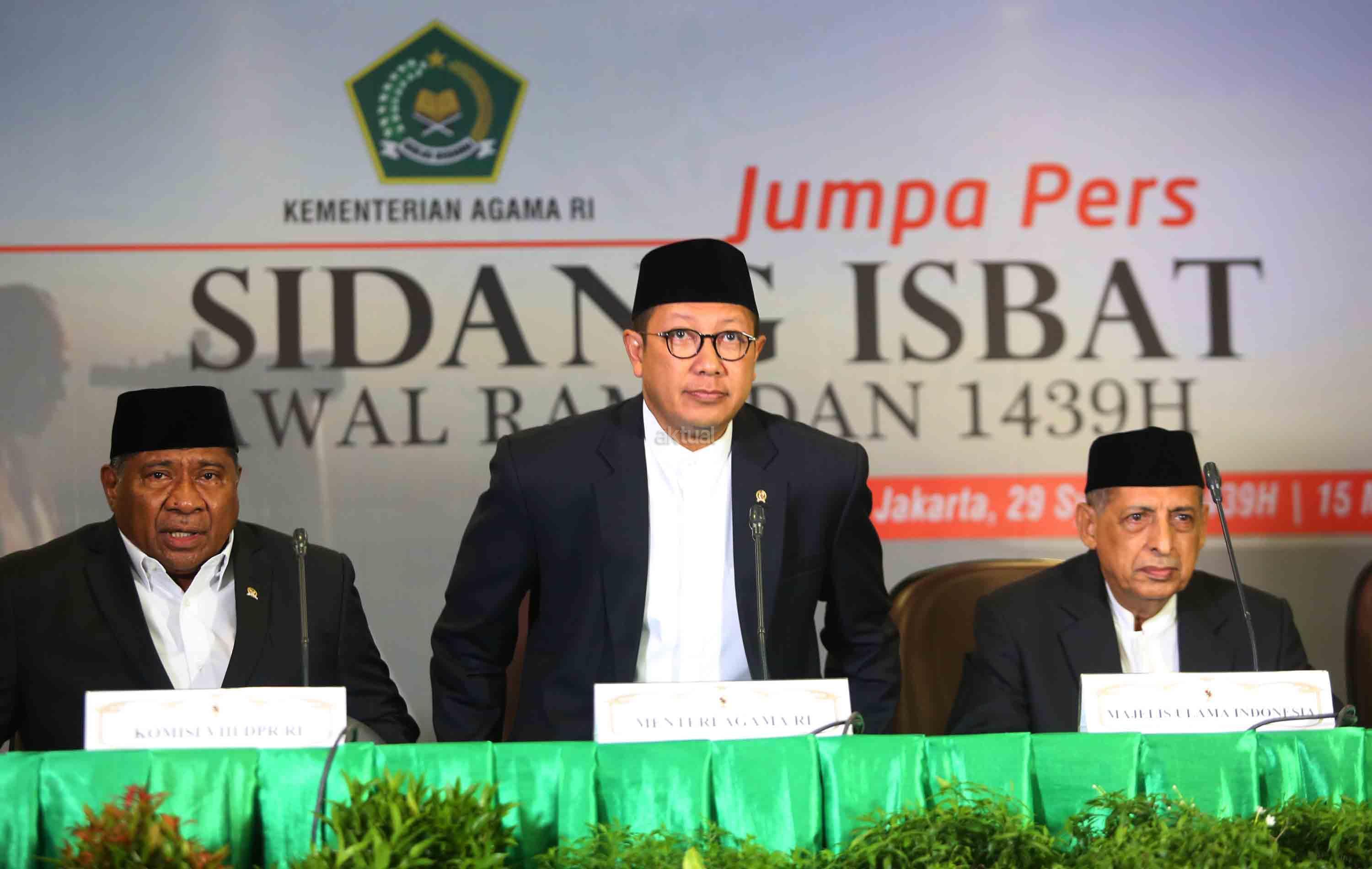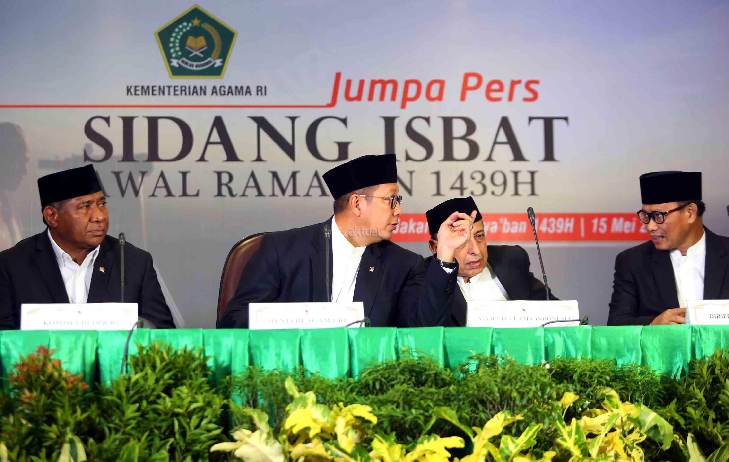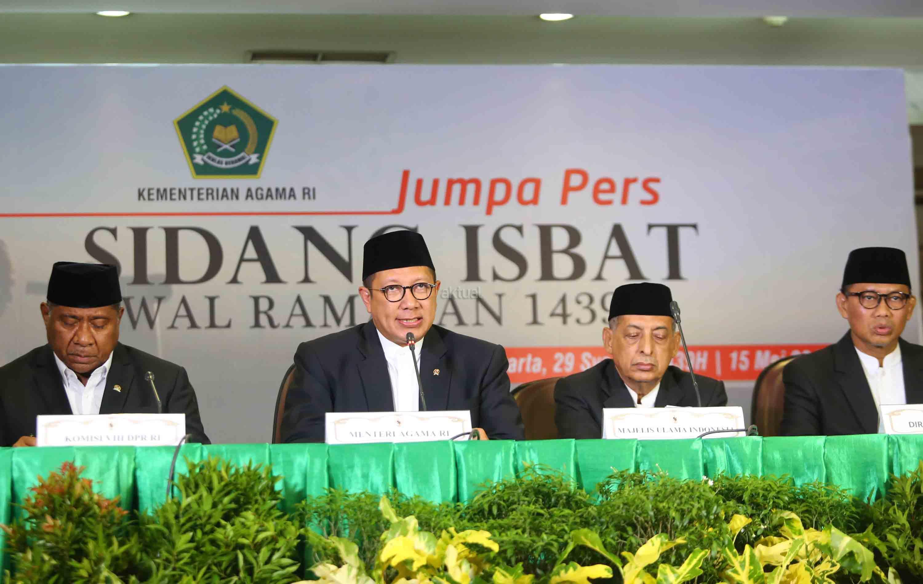 Menteri Agama RI Lukman Hakim bersama Perwakilan Majelis Ulama Indonesia (MUI) Abdullah Jaidi, Komisi VIII DPR RI Ali Taher, dan Dirjen Bimas Islam Muhammadiyah Amin memberikan keterangan kepada media terkait hasil sidang Isbat penentuan tanggal 1 Ramadhan 1439 H di kantor Kementerian Agama RI, Jakarta, Selasa (15/4). Pemerintah mengumumkan hasil pemantauan hilal dan posisi bulan dan menetapkan tanggal 1 Ramadhan jatuh pada Hari Kamis Tanggal 17 Mei 2018. AKTUAL/Tino Oktaviano