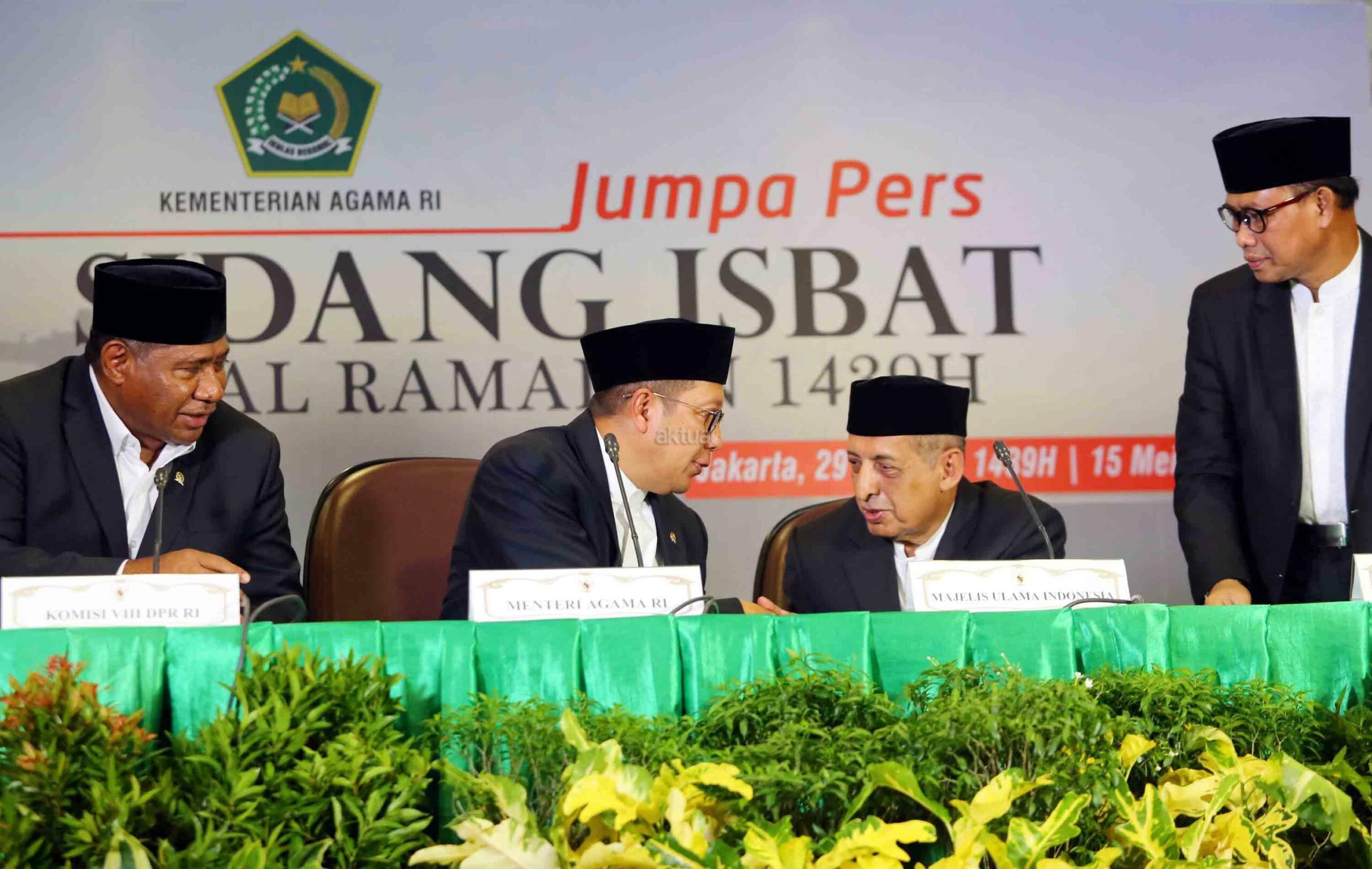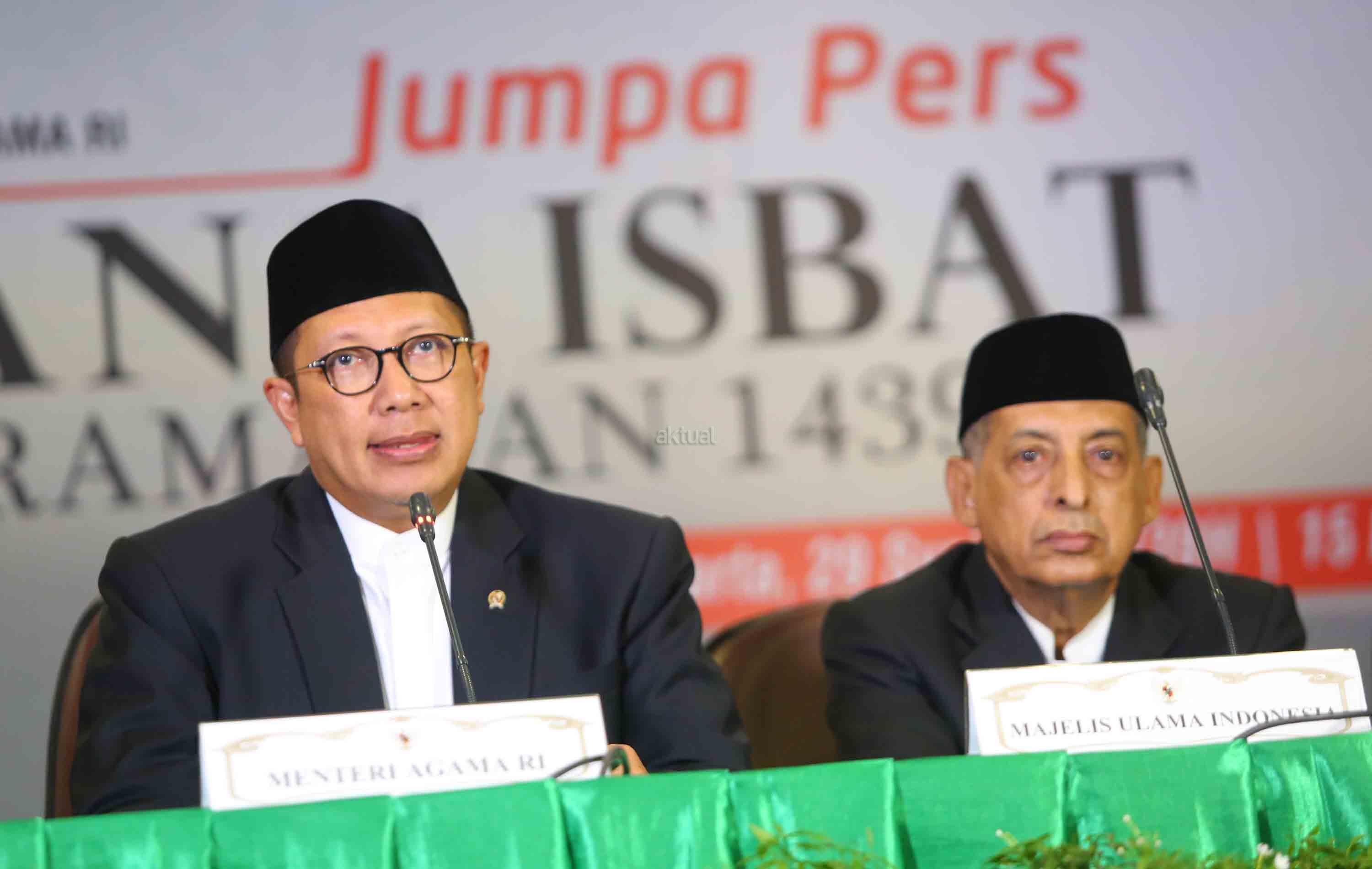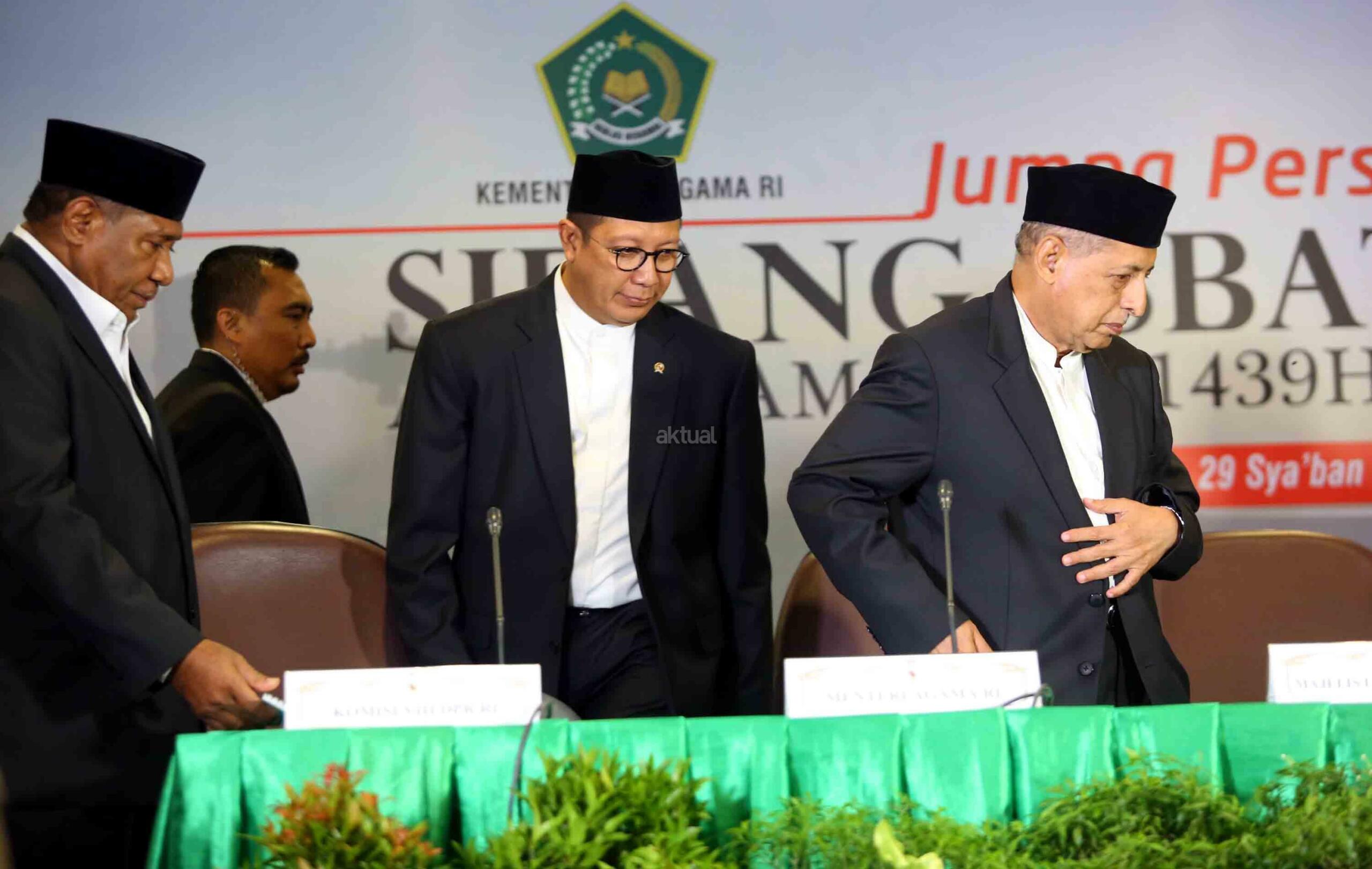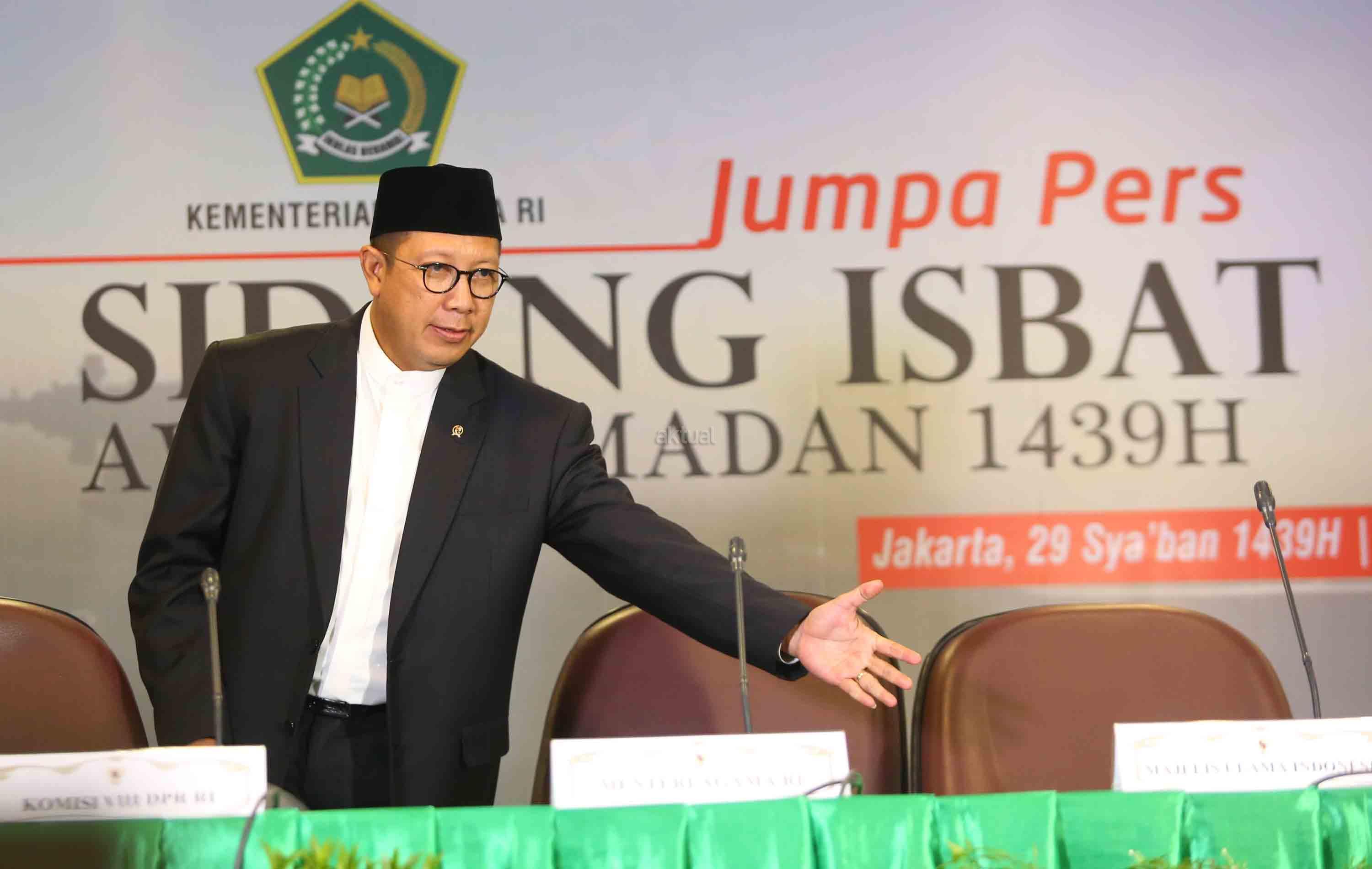 Menteri Agama RI Lukman Hakim bersama Perwakilan Majelis Ulama Indonesia (MUI) Abdullah Jaidi, Komisi VIII DPR RI Ali Taher, dan Dirjen Bimas Islam Muhammadiyah Amin memberikan keterangan kepada media terkait hasil sidang Isbat penentuan tanggal 1 Ramadhan 1439 H di kantor Kementerian Agama RI, Jakarta, Selasa (15/4). Pemerintah mengumumkan hasil pemantauan hilal dan posisi bulan dan menetapkan tanggal 1 Ramadhan jatuh pada Hari Kamis Tanggal 17 Mei 2018. AKTUAL/Tino Oktaviano