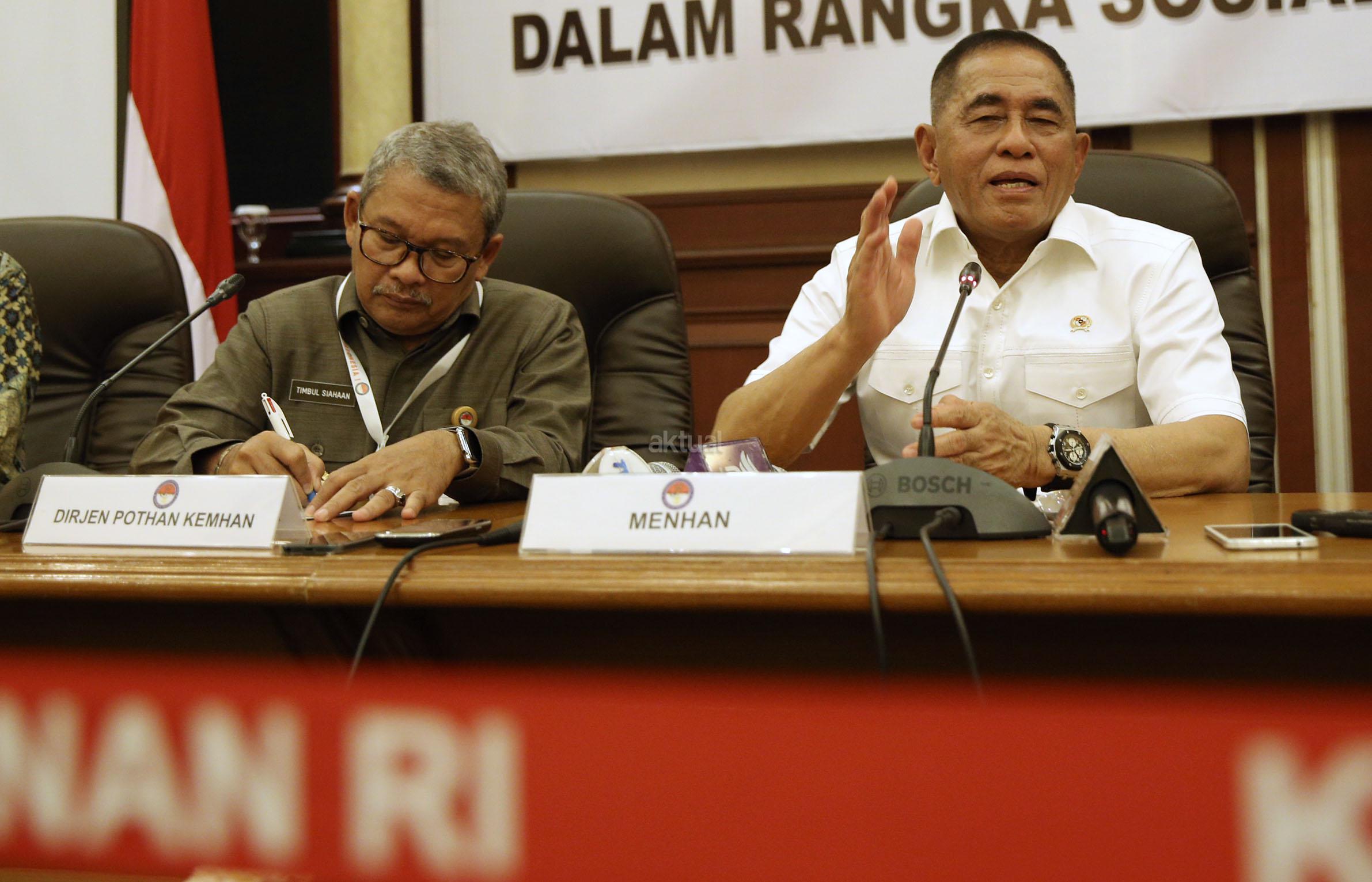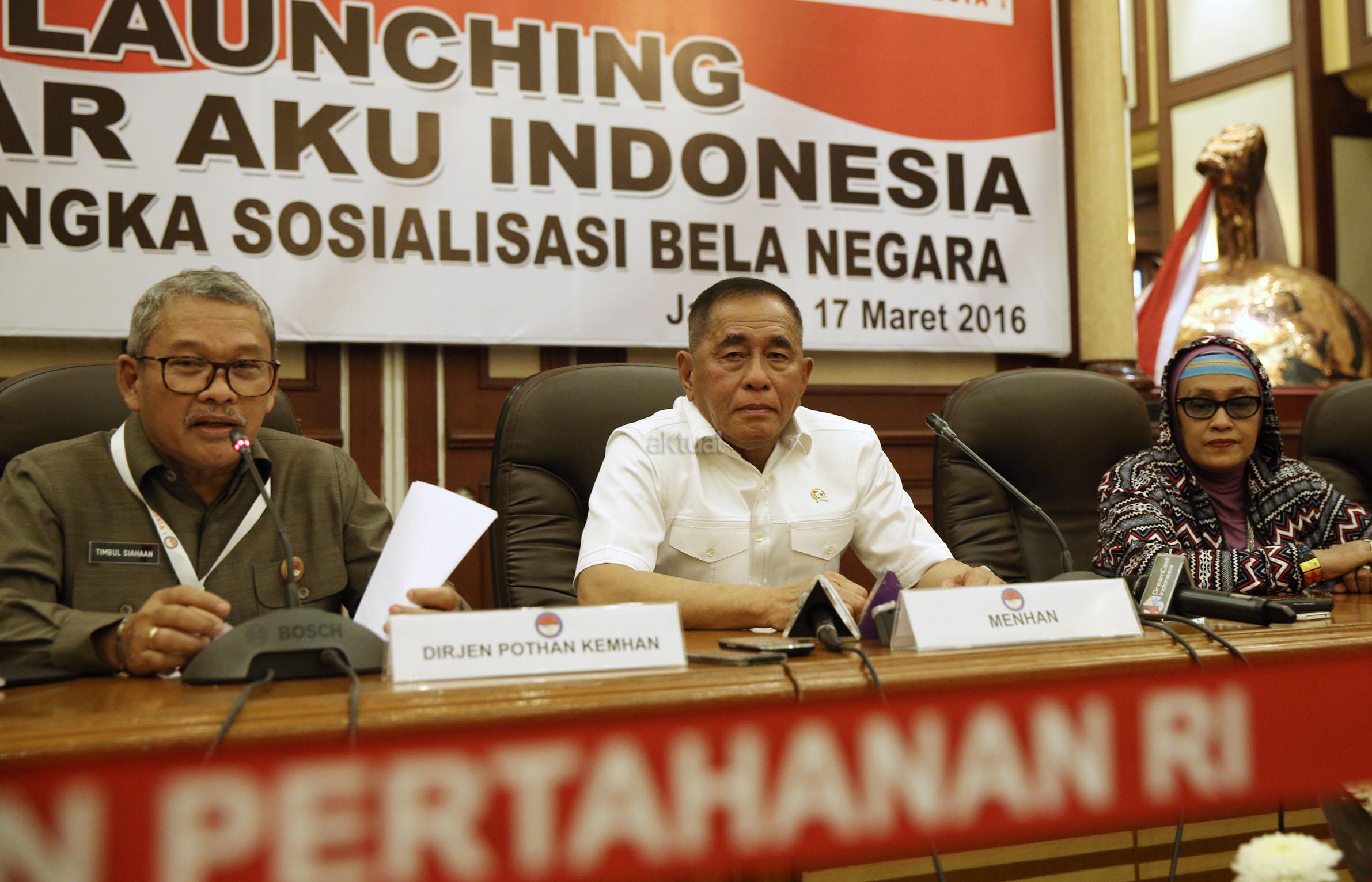 Dirjen Pothan Kemhan RI Dr. Ir. Timbul Siahaan (kiri) , Menteri Pertahanan Jenderal TNI (Purn) Ryamizard Ryacudu (tengah) , Lady rocker Indonesia Reni Jayusman (kanan) saat menggelat jumpa persnya usai acara Launching Gebyar Aku Indonesia di kantor Kementrian Pertahanan, Jalan. Medan Merdeka Barat, Jakarta, Kamis (17/3/2016). Launching Gebyar Aku Indonesia dalam rangka sosialisasi Bela Negara yang didukung para artis dan musisi yang tergabung dalam Indonesia Kita (IKI) dengan menggelar roadshow pagelaran lagu Indonesia Kita.