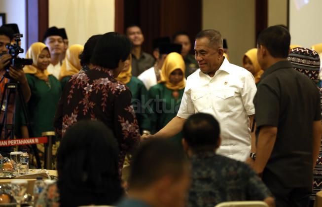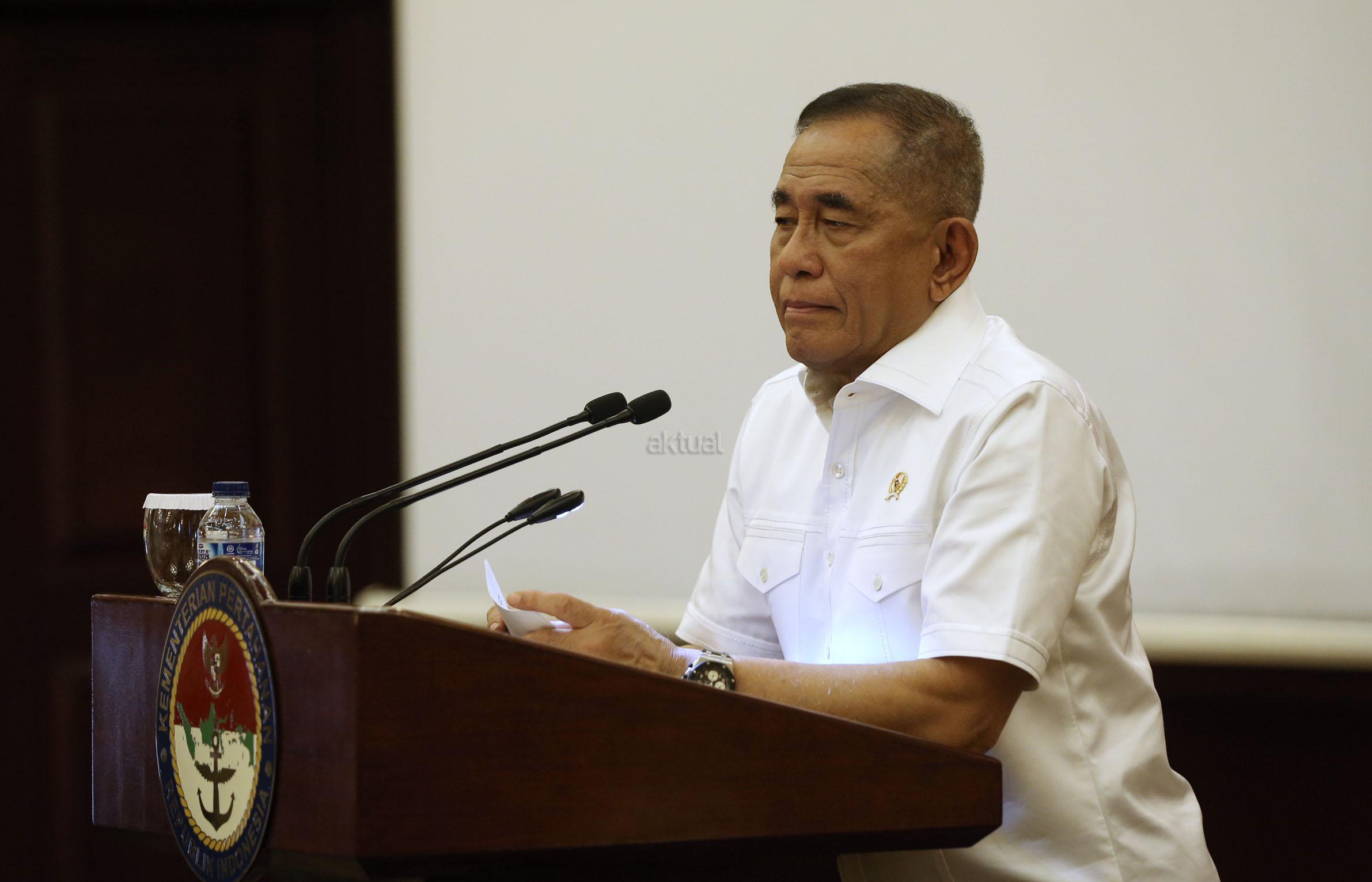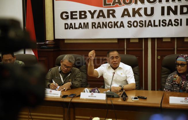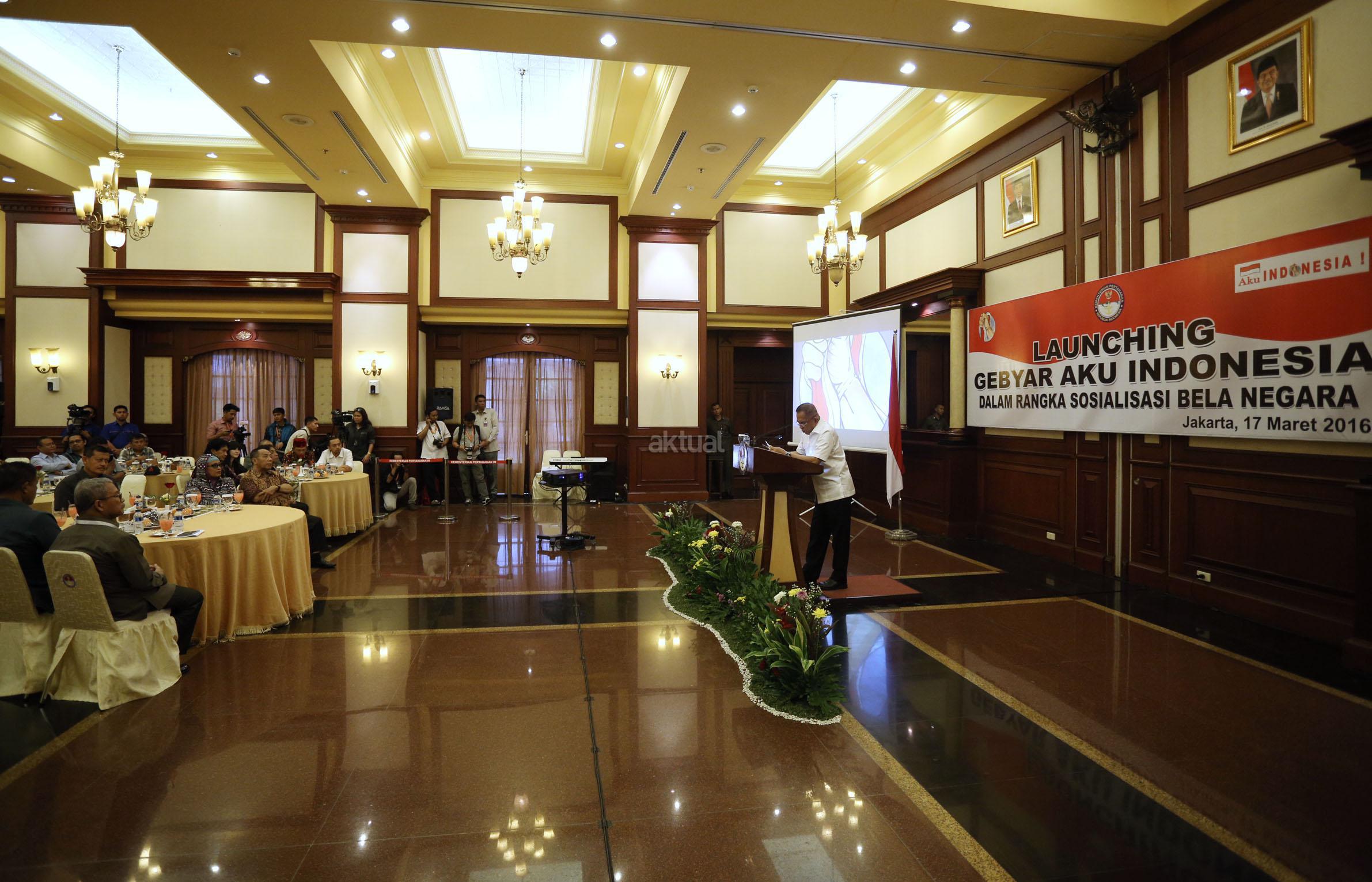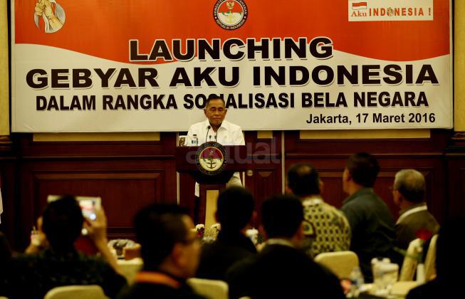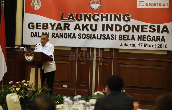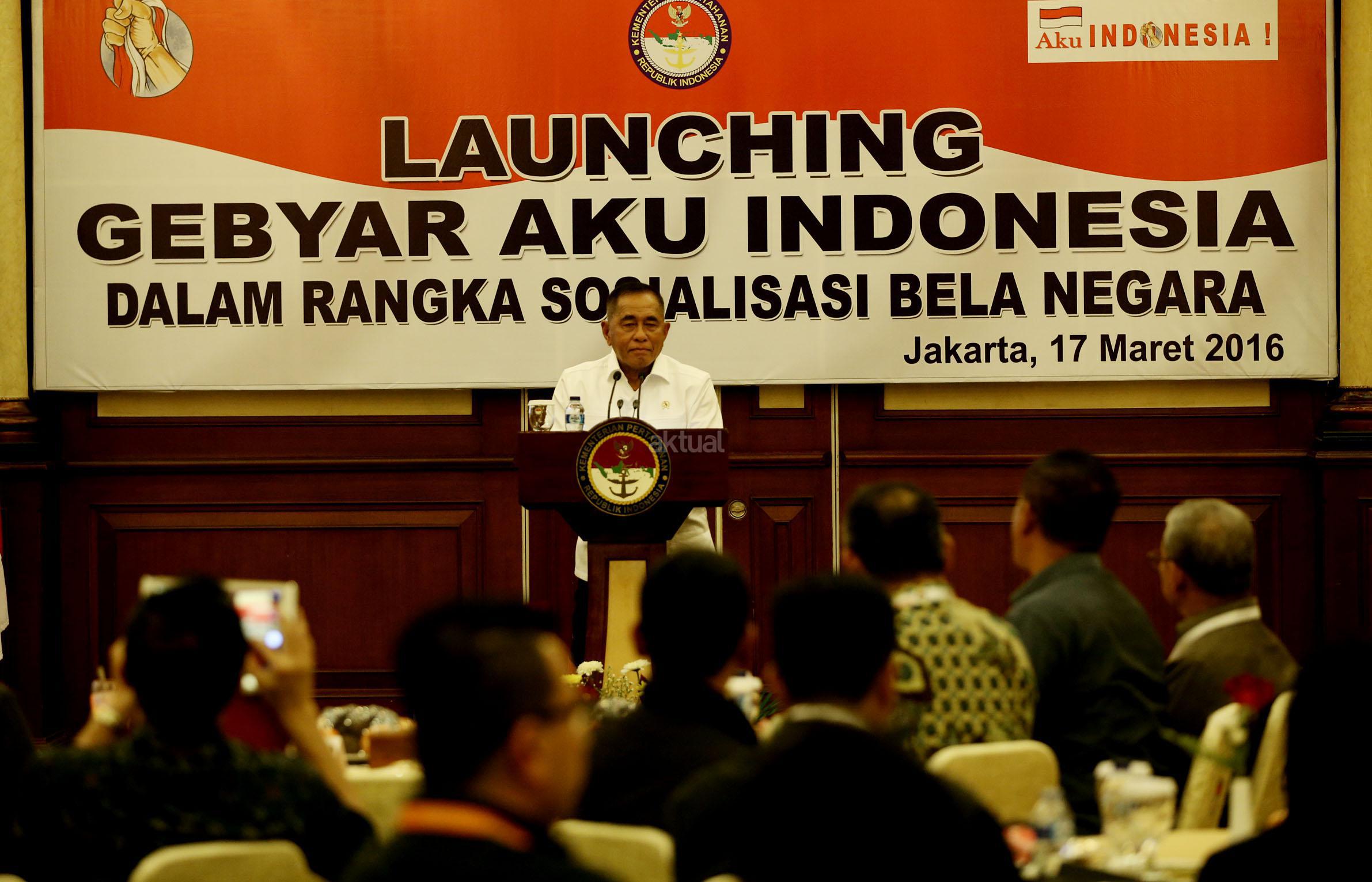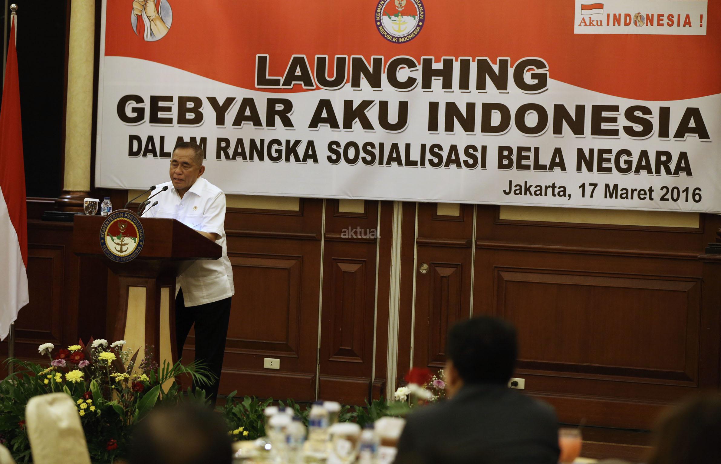 Menteri Pertahanan Jenderal TNI (Purn) Ryamizard Ryacudu memberikan pidato dalam acara Launching Gebyar Aku Indonesia di kantor Kementrian Pertahanan, Jalan. Medan Merdeka Barat, Jakarta, Kamis (17/3/2016). Launching Gebyar Aku Indonesia dalam rangka sosialisasi Bela Negara yang didukung para artis dan musisi yang tergabung dalam Indonesia Kita (IKI) dengan menggelar roadshow pagelaran lagu Indonesia Kita.