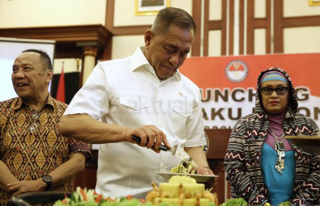 Drummer Legendaris Indonesia Jelly Tobing (kiri) mendampingi Menteri Pertahanan Jenderal TNI (Purn) Ryamizard Ryacudu (tengah) bersama Lady rocker Indonesia Reni Jayusman (kiri) saat memotong nasi tumpeng dalam acara Launching Gebyar Aku Indonesia di kantor Kementrian Pertahanan, Jalan. Medan Merdeka Barat, Jakarta, Kamis (17/3/2016). Launching Gebyar Aku Indonesia dalam rangka sosialisasi Bela Negara yang didukung para artis dan musisi yang tergabung dalam Indonesia Kita (IKI) dengan menggelar roadshow pagelaran lagu Indonesia Kita.