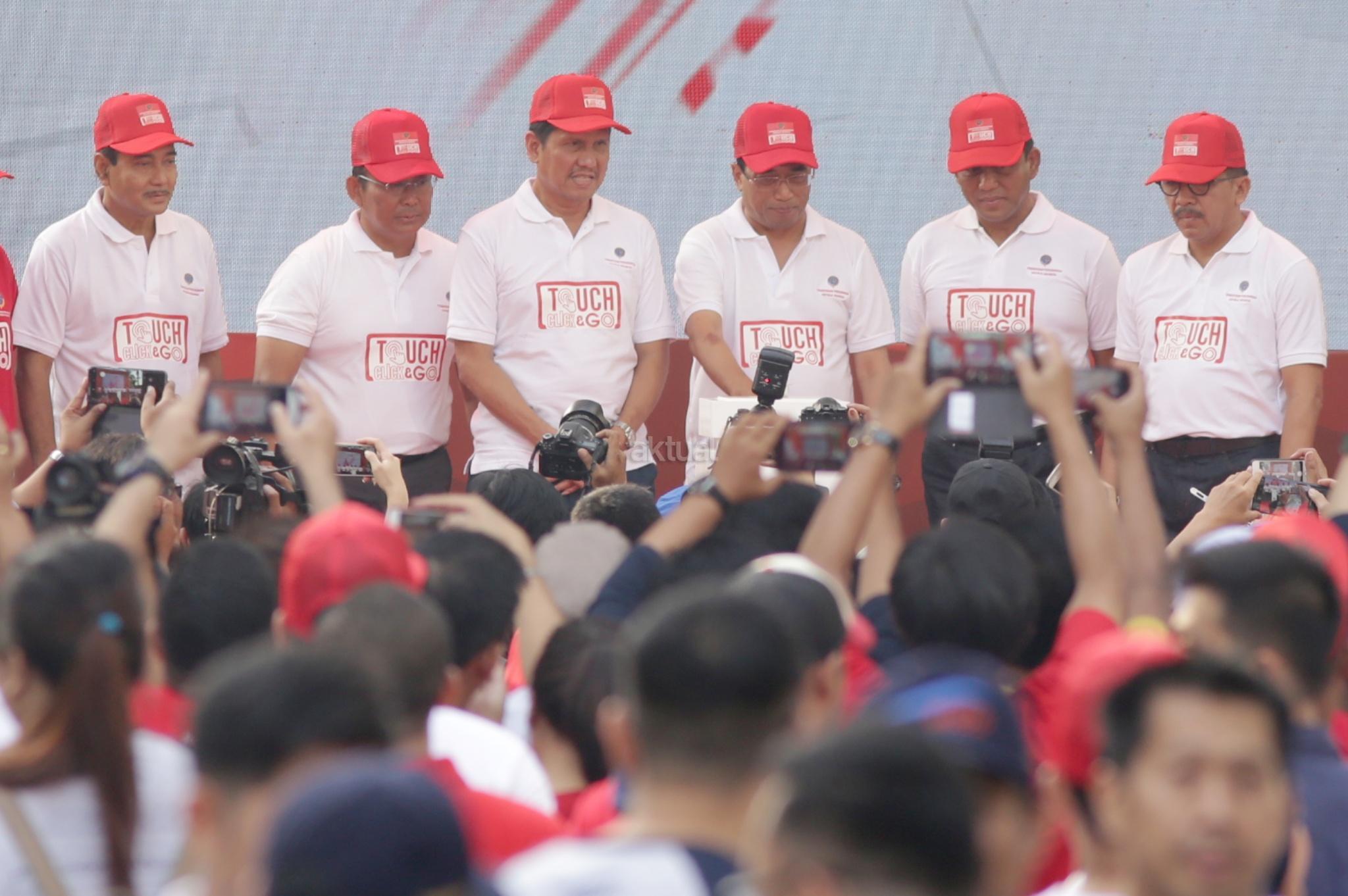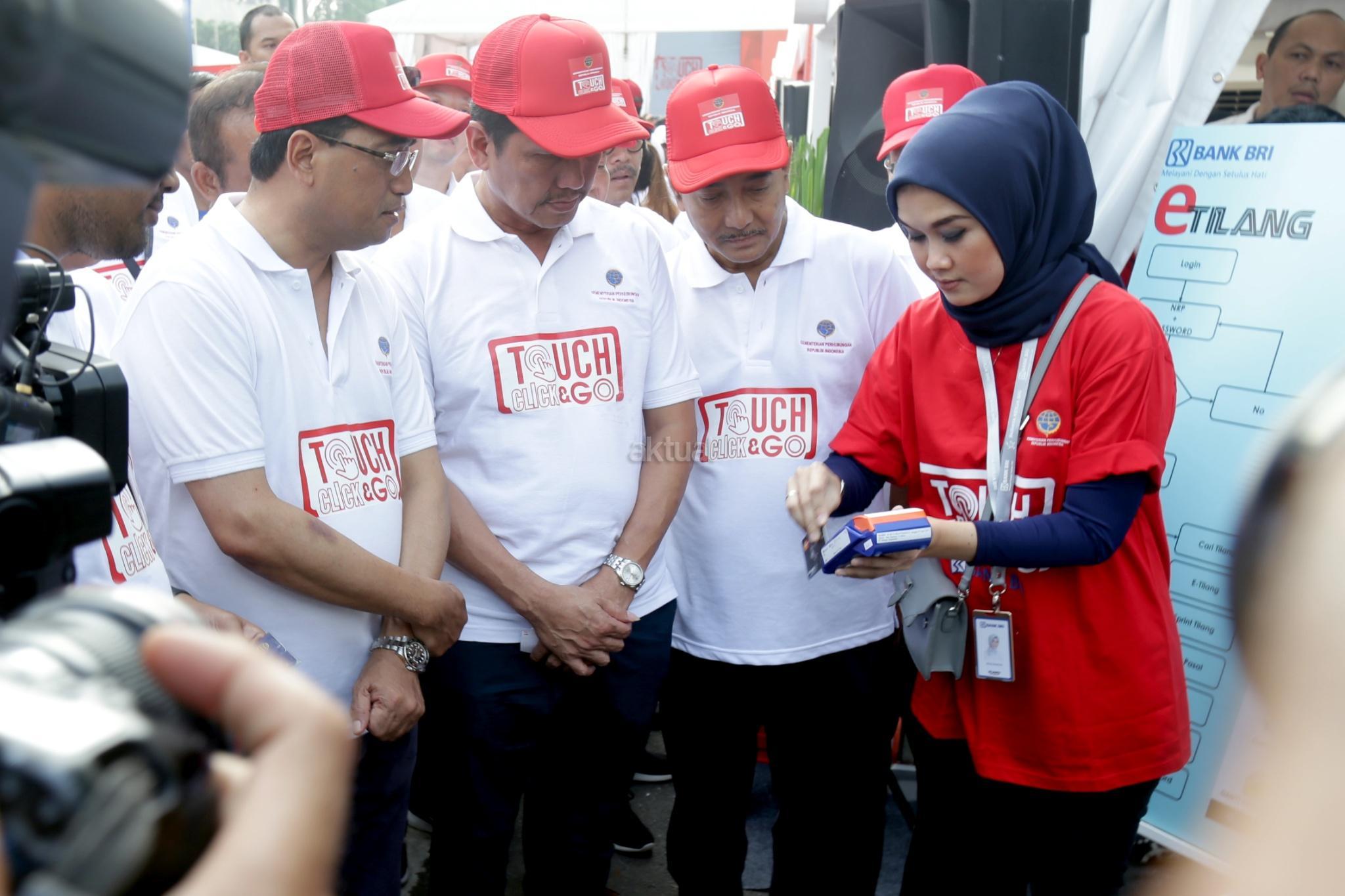 Menteri Perhubungan Budi Karya Sumadi (kiri) memperlihatkan nota kesepahaman bersama Direktur Utama Bank Rakyat Indonesia (BRI) Suprajarto (kanan) usai melakukan tanda tangan kerja sama aplikasi pembayaran pelanggaran saat peluncuran Sistem Aplikasi Pelayanan Bidang Perhubungan Darat di Jakarta, Minggu (4/3/18). Kemenhub bekerjasama dengan BRI dalam implementasi e-tilang. Aplikasi ini merupakab aplikasi berbasis Android yang akan mempermudah masyarakat dalam mengurus pelanggaran tilang tanpa perlu pergi ke pengadilan untuk mengikuti sidang, cukup melakukan pembayaran di bank atau m-banking. AKTUAL/Tino Oktaviano