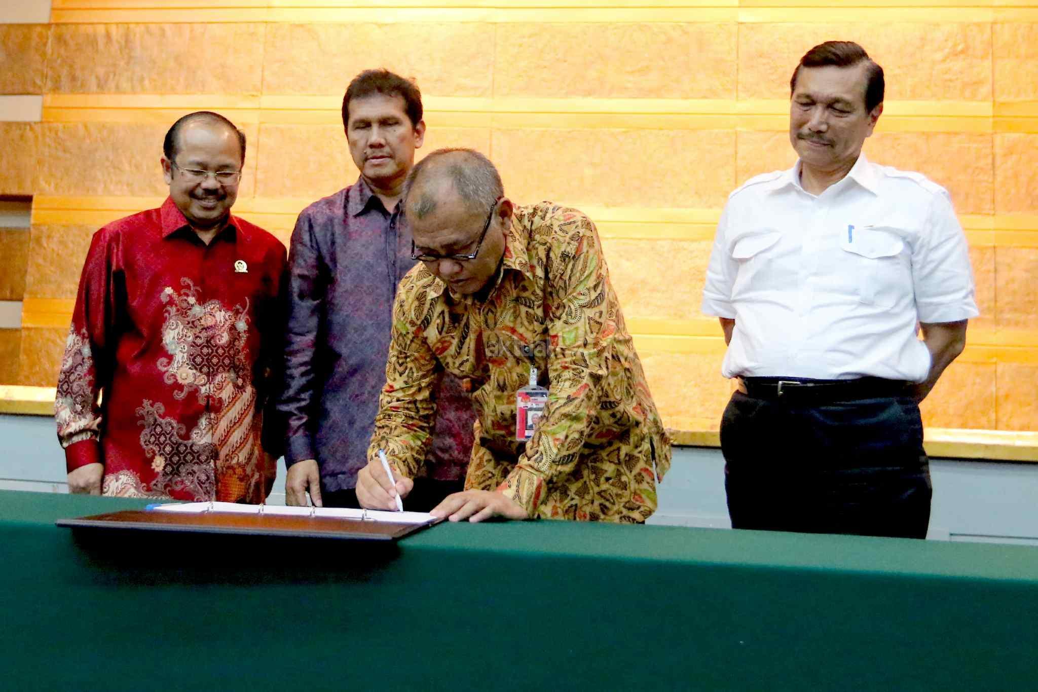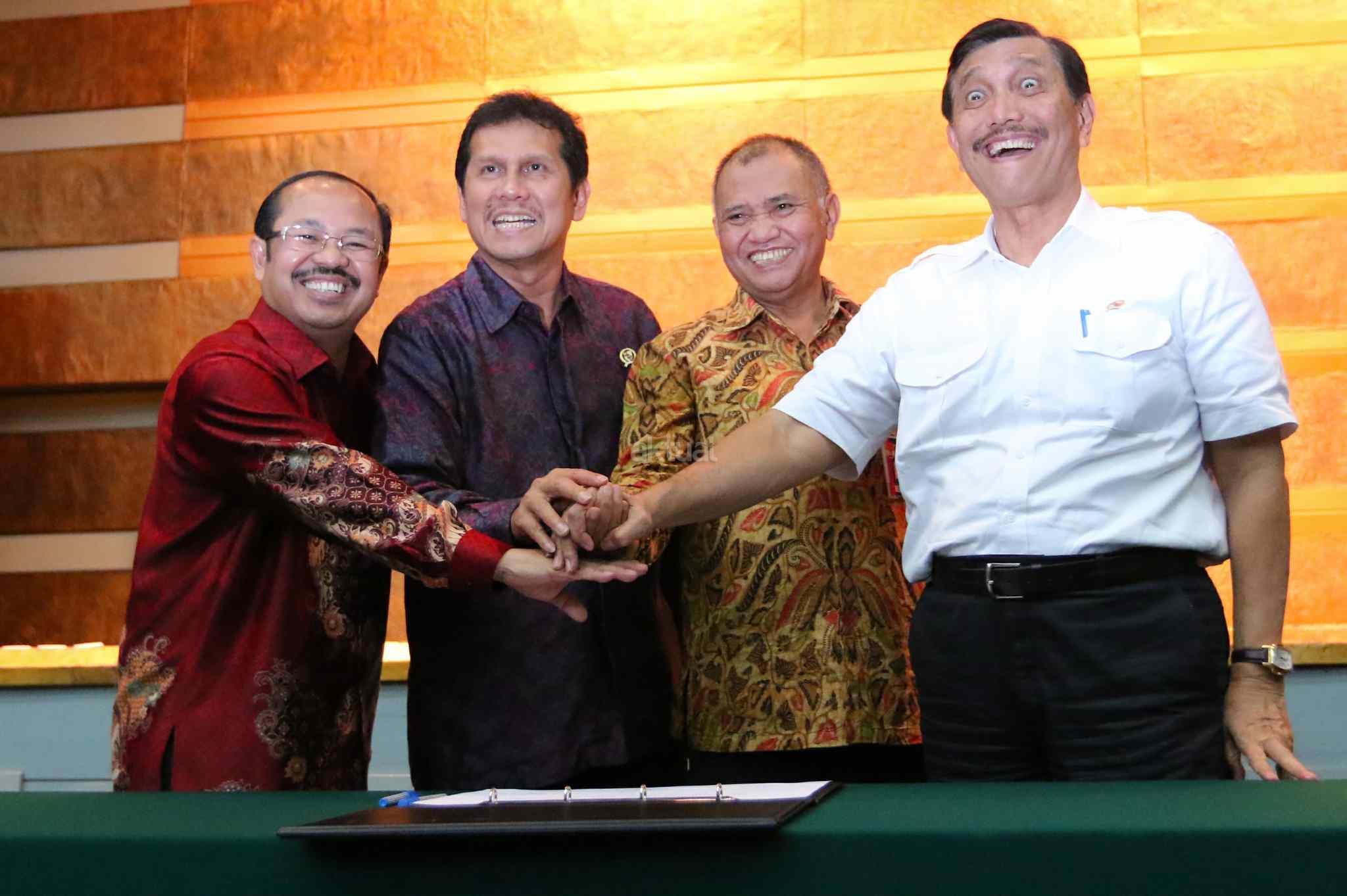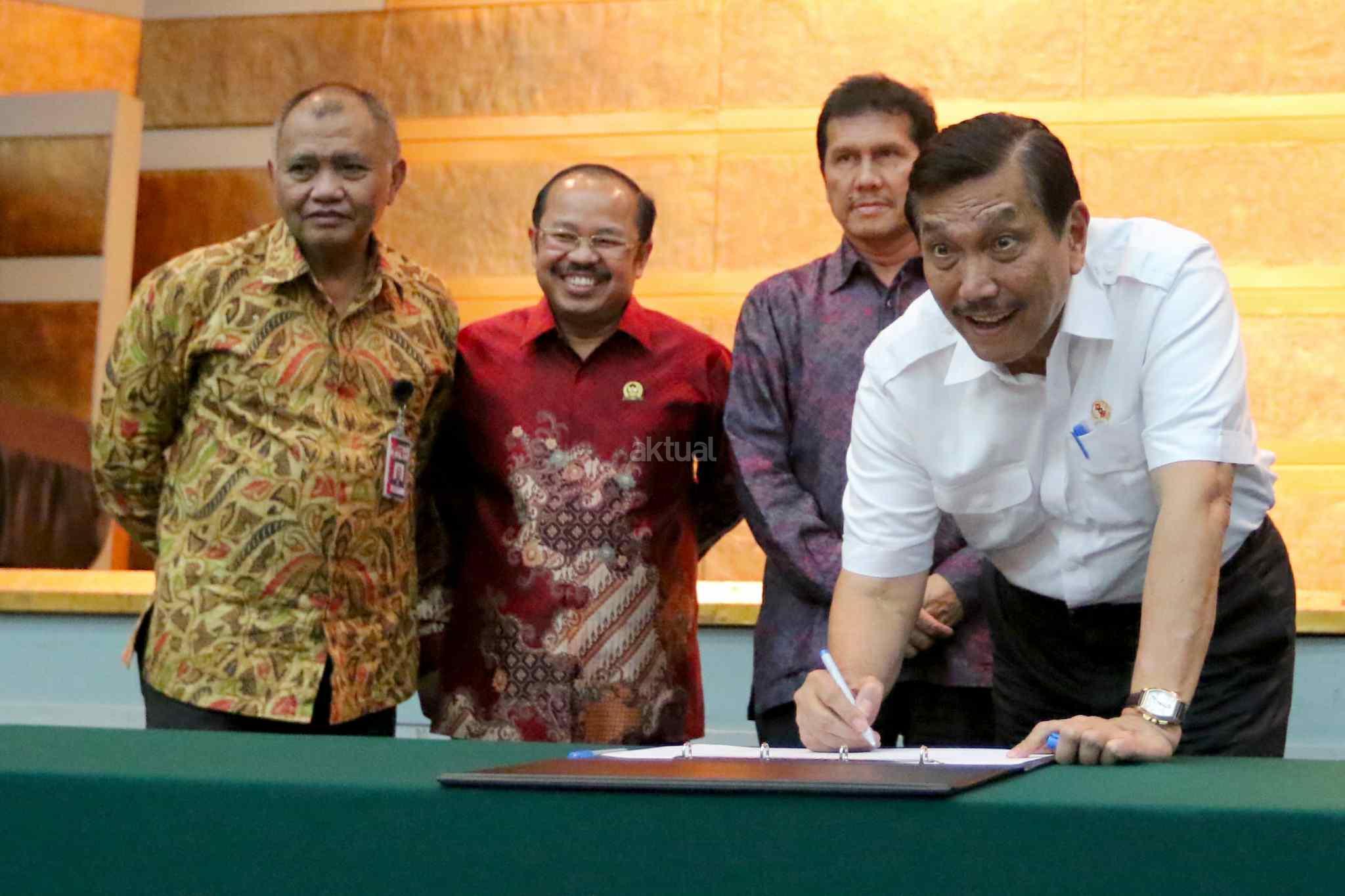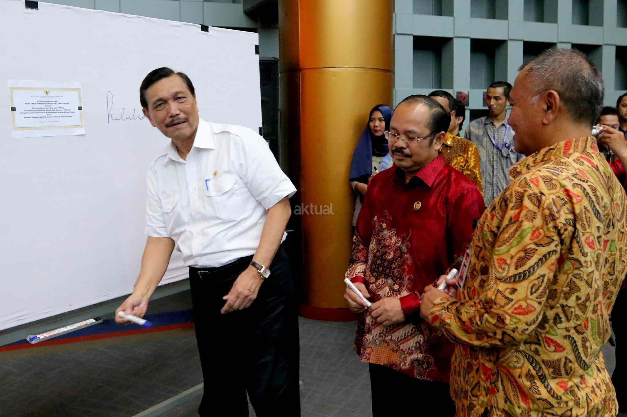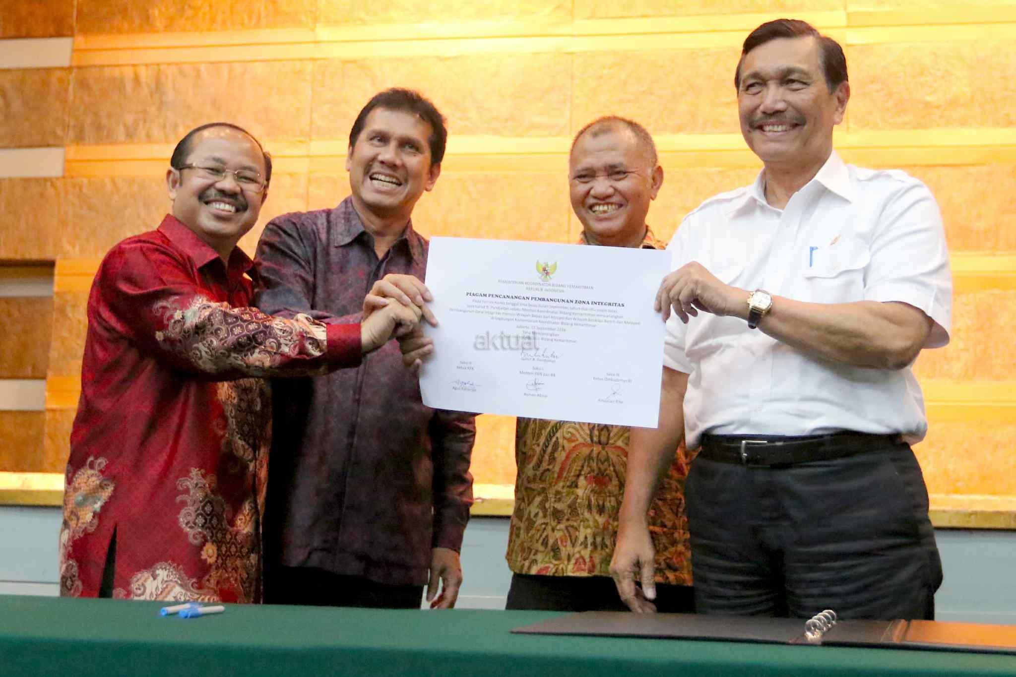 Dari kanan ke kiri, Menko Maritim Luhut Binsar Panjaitan, Menpanrb Asman Abnur, Ketua KPK Agus Rahardjo, dan Ketua Ombudsman Republik Indonesia Amzulian Rifai saat melakukan penandatangan pencanangan zona integritas Kementerian Koordinator Bidang Maritim di Jakarta , Kamis (15/9). Dalam pencanangan zona integrasi tersebut Menko Maritim mencanangkan zona bebas korupsi dan wilayah birokrasi bersih dan melayani. AKTUAL/TINO OKTAVIANO