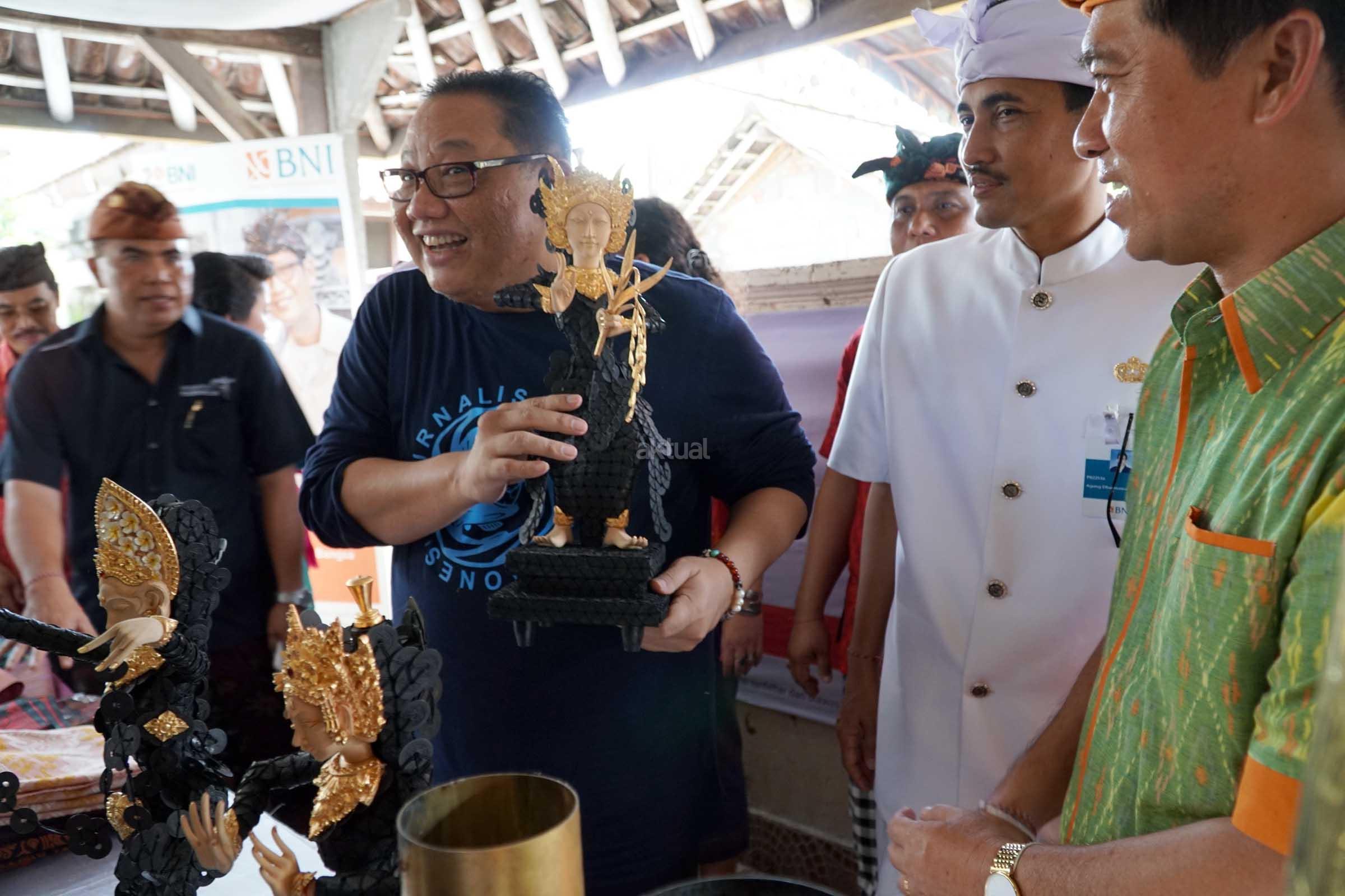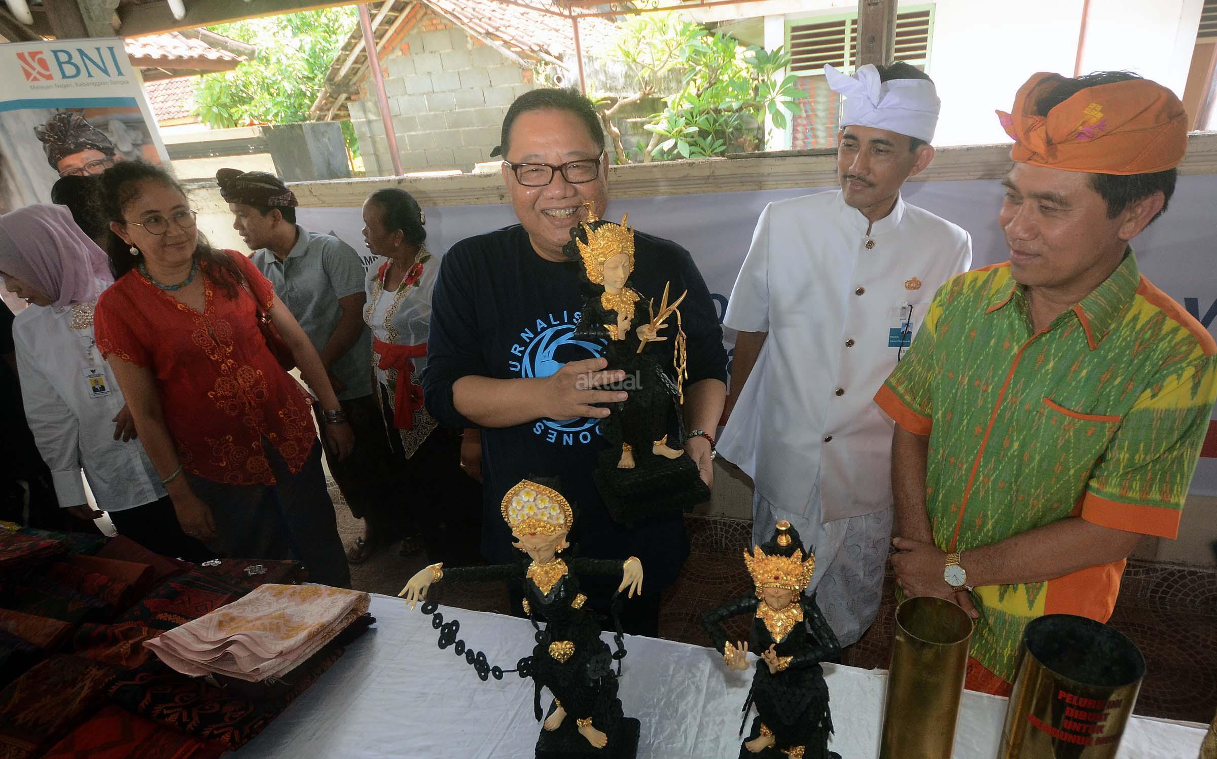 Menteri Koperasi dan Usaha Kecil Menengah Anak Agung Gede Ngurah Puspayoga (ketiga dari kanan) didampingi Bupati Klungkung I Nyoman Suwitra (kanan) dan Pimpinan Wilayah BNI Bali, NTB & NTT Anak Agung Gede Agung Dharmawan (kedua dari kanan) memegang patung koin kepeng karya warga Kampoeng BNI Kamasan pada program Lompatan Budaya Wastra Kamasan di Klungkung, Bali, Jumat (27/1). Program tersebut sebagai peluncuran kesenian kain khas Kamasan yang diharapkan menjadi cinderamata baru Bali. AKTUAL/Jojoners