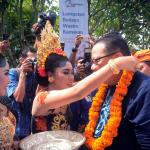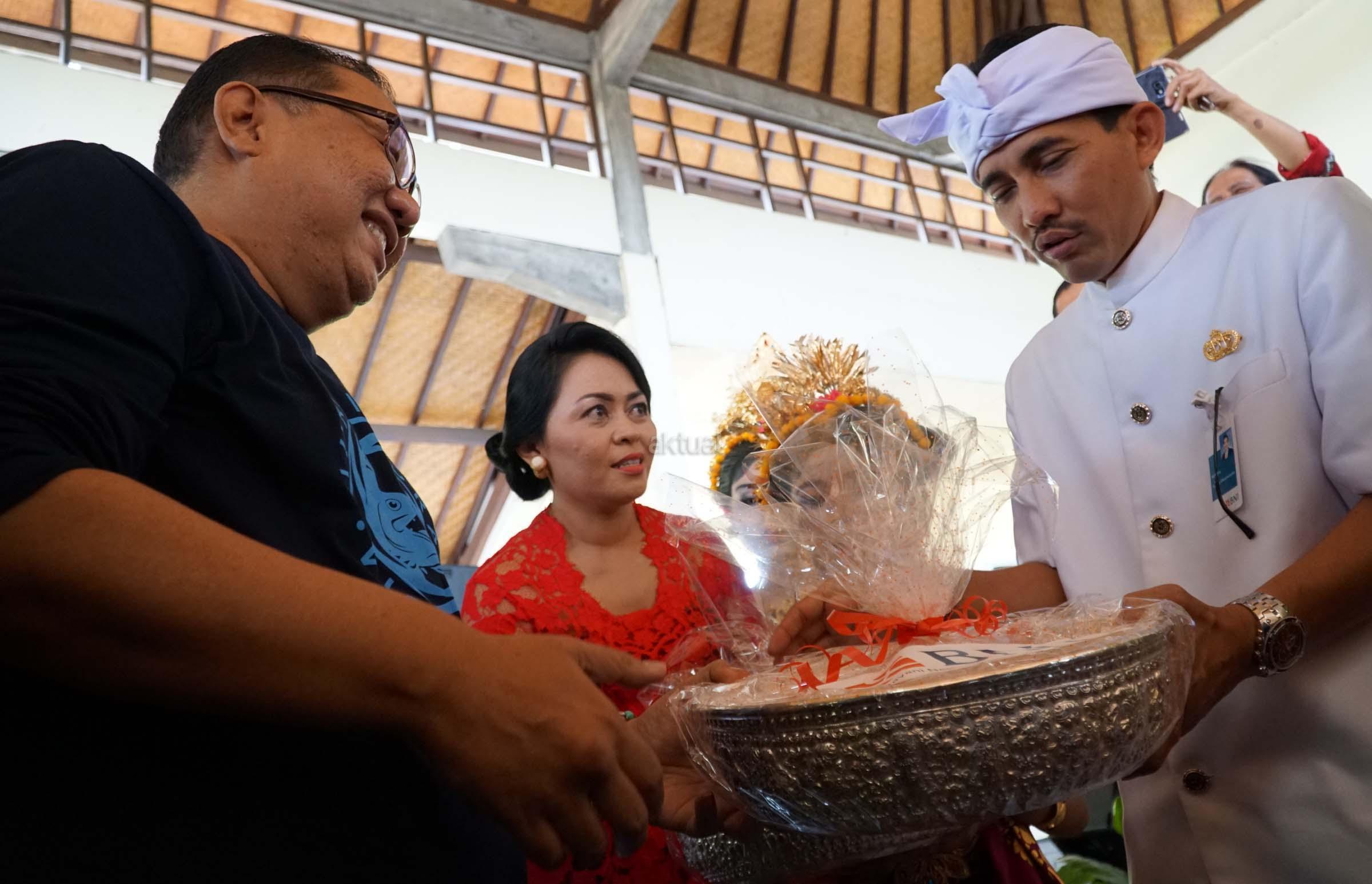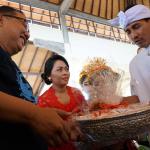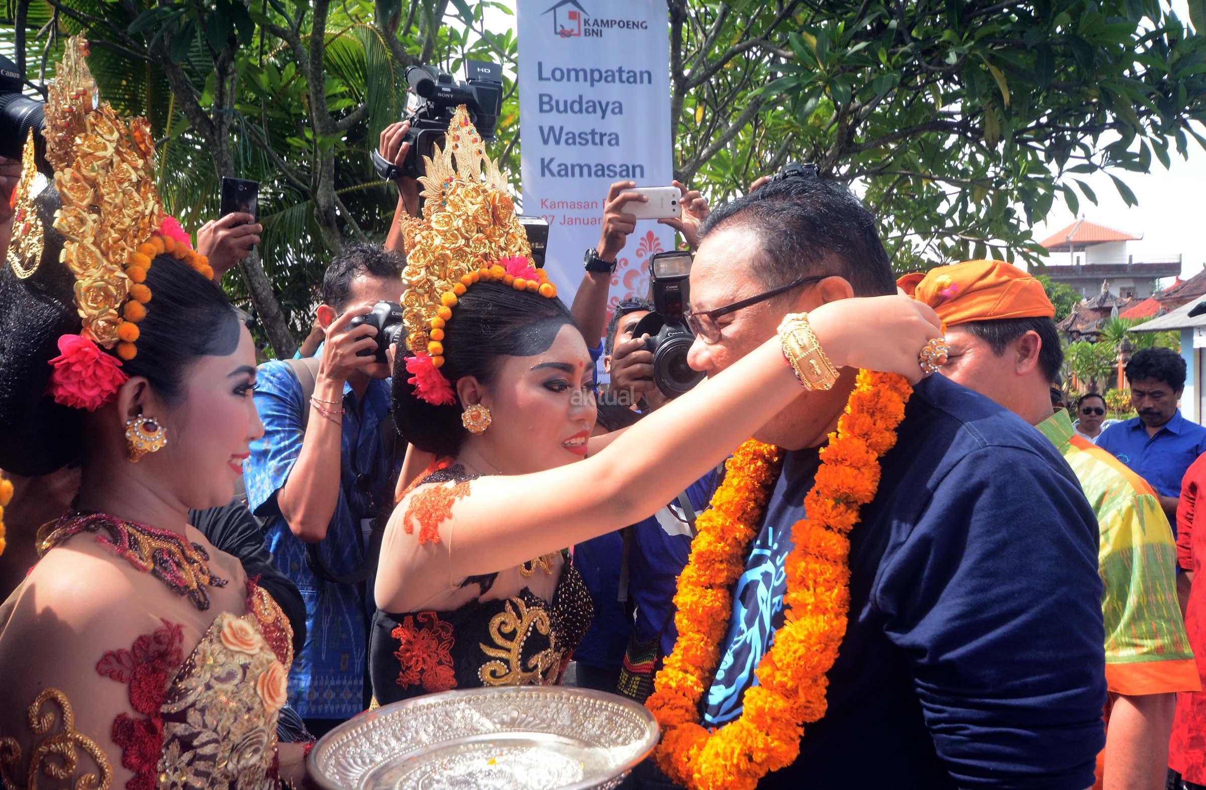 Menteri Koperasi dan Usaha Kecil Menengah Anak Agung Gede Ngurah Puspayoga meneria kalungan bunga saat tiba di Kampoeng BNI Kamasan, Bali, Sabtu (27/1/2017). Program bertema Lompatan Budaya Wastra Kamasan ini dilakukan sebagai soft launching kesenian kain khas Kamasan yang diharapkan dapat menjadi cinderamata baru dari Bali. AKTUAL/Jojoners