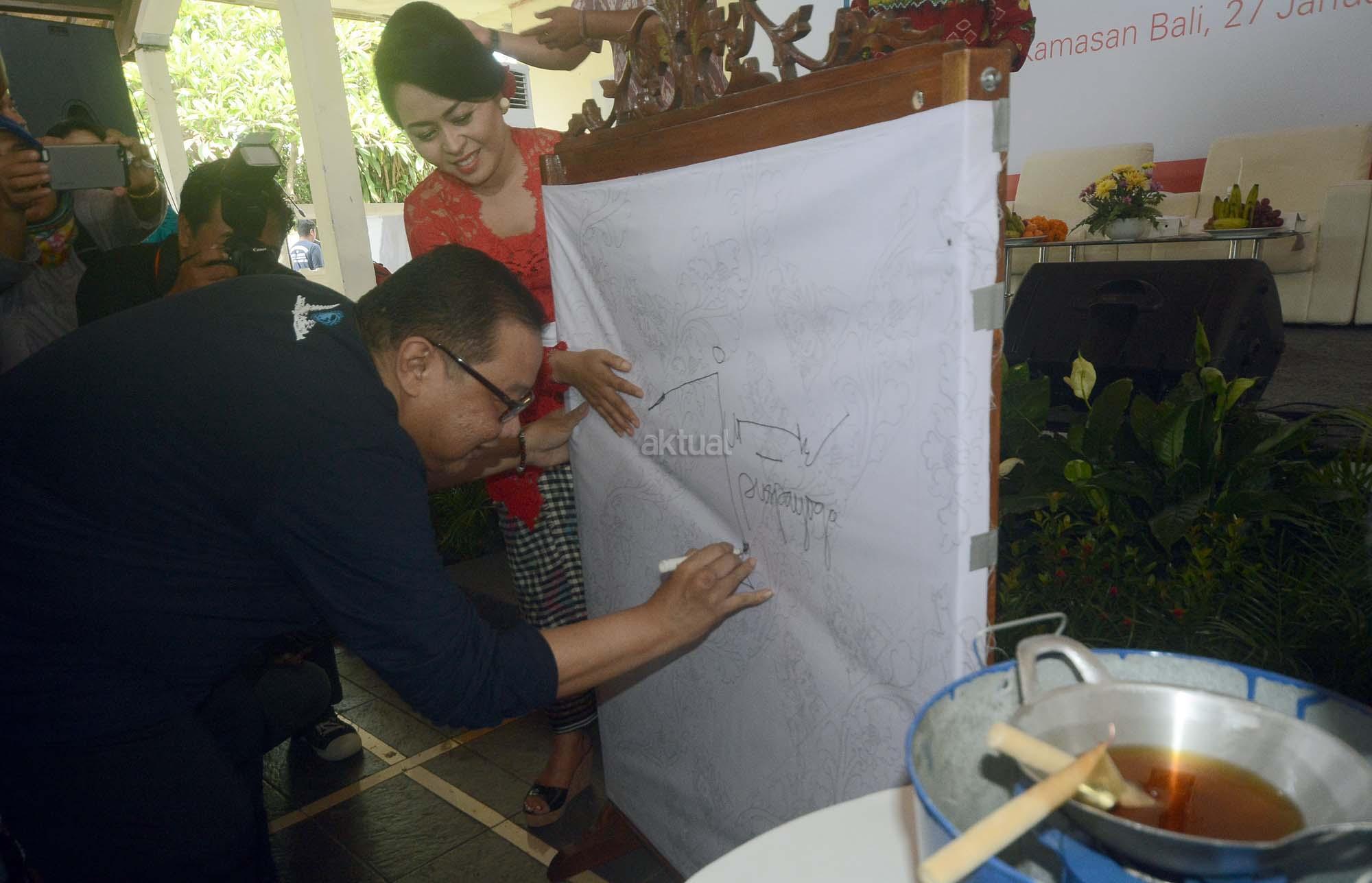 Menteri Koperasi dan Usaha Kecil Menengah Anak Agung Gede Ngurah Puspayoga melakukan goresan pertama di atas kain di Kampoeng BNI Kamasan, Bali, Sabtu (27/1/2017). Program bertema Lompatan Budaya Wastra Kamasan ini dilakukan sebagai soft launching kesenian kain khas Kamasan yang diharapkan dapat menjadi cinderamata baru dari Bali. AKTUAL/Jojoners
