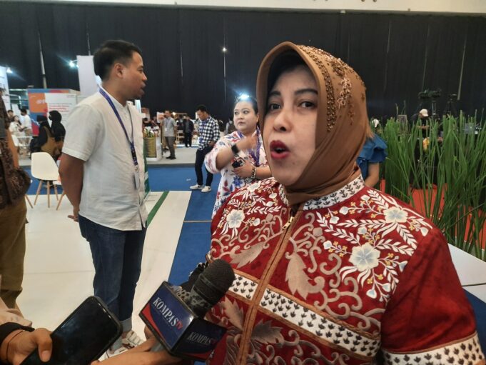 Asisten Deputi Kemitraan dan Perluasan Pasar Kementerian Koperasi dan UKM Pixy menjawab pertanyaan wartawan di ICE BSD, Tangerang, Banten, Selasa (29/8/2023). KOMPAS/YOSEPHA DEBRINA R PUSPARISA