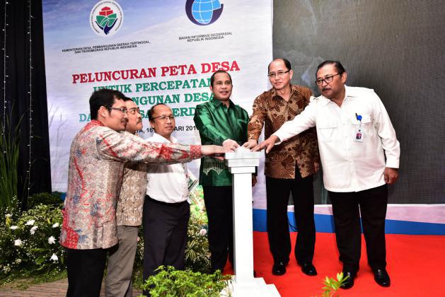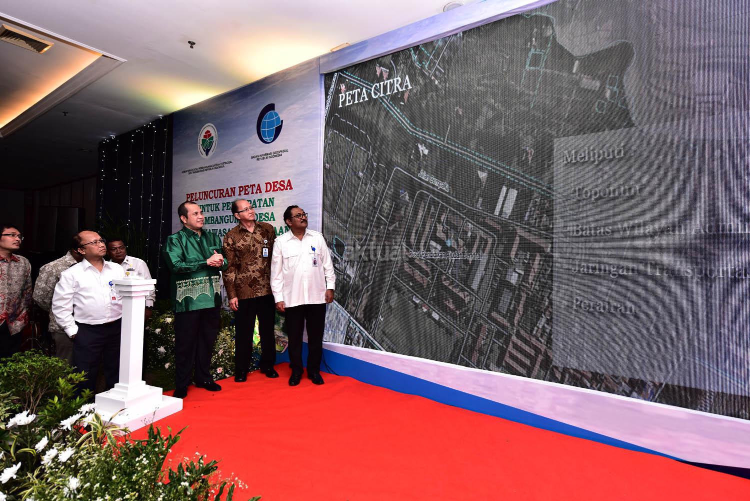 Menteri Desa, PDT dan Transmigrasi, Marwan Jafar dan Kepala Badan Informasi Geospasial, Priyadi Kardono bersama-sama meresmikan peluncuran Peta Desa untuk melakukan Percepatan Pembangunan Desa dan Kawasan Perdesaan di Kantor Kementerian Desa, PDT dan Transmigrasi, Jakarta, Selasa (16/2/2016). Peluncuran Peta Desa ini juga dihadiri Para Pejabat Dari Kementerian Desa, PDTT dan Badan Informasi Geospasial. Dalam kesempatan acara ini Marwan Jafar Bernyanyi Bersama Vocalis Musikimia Fadly.