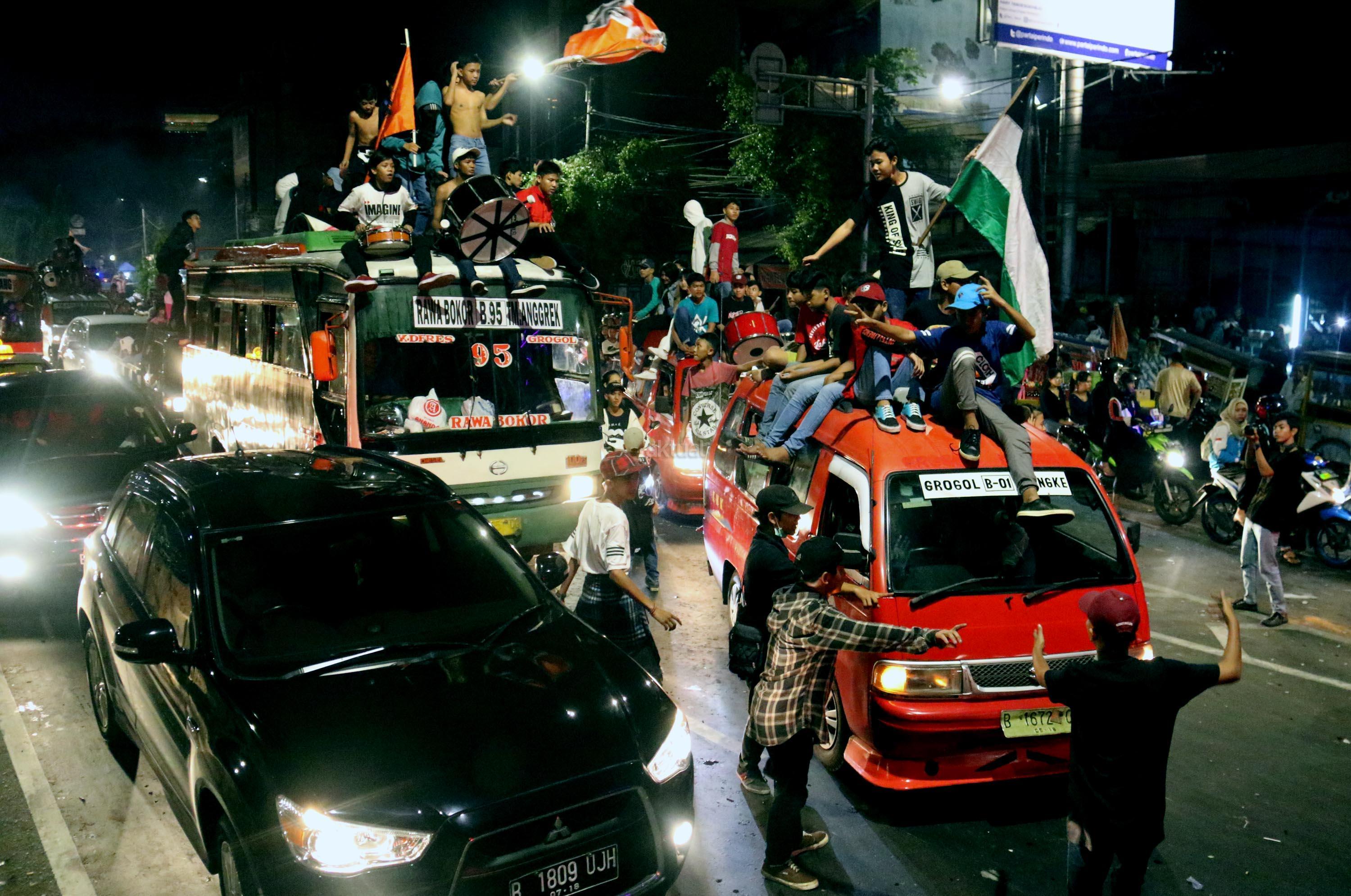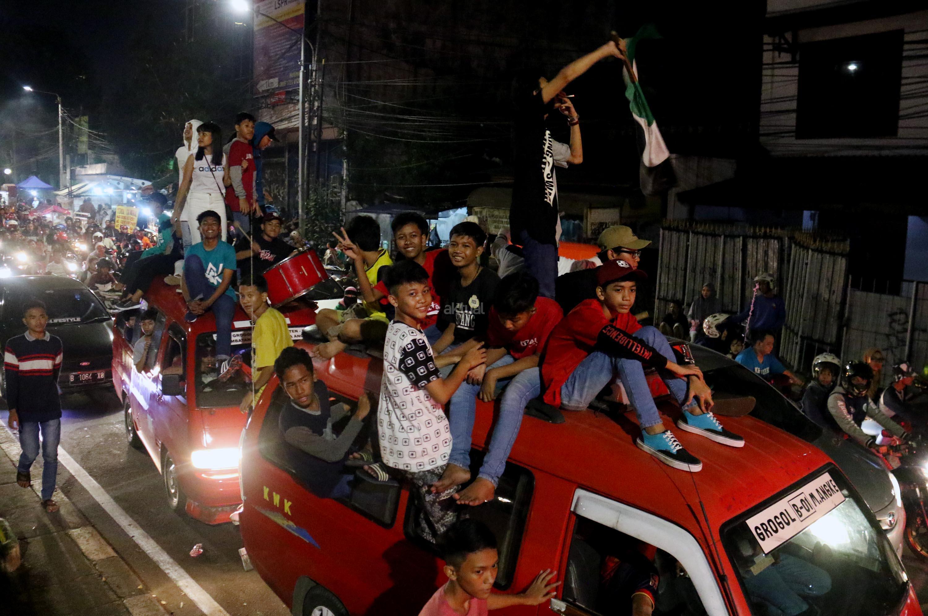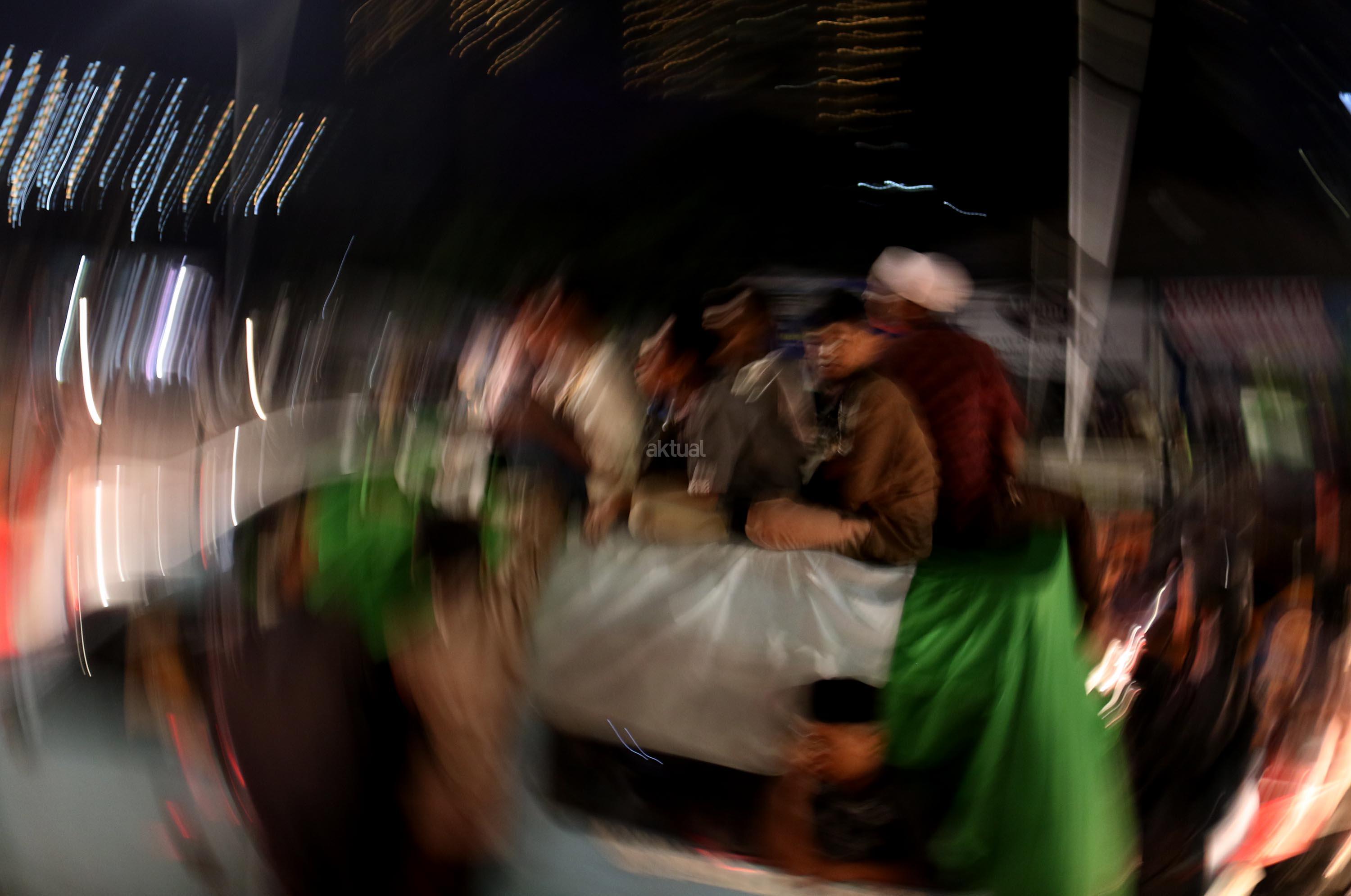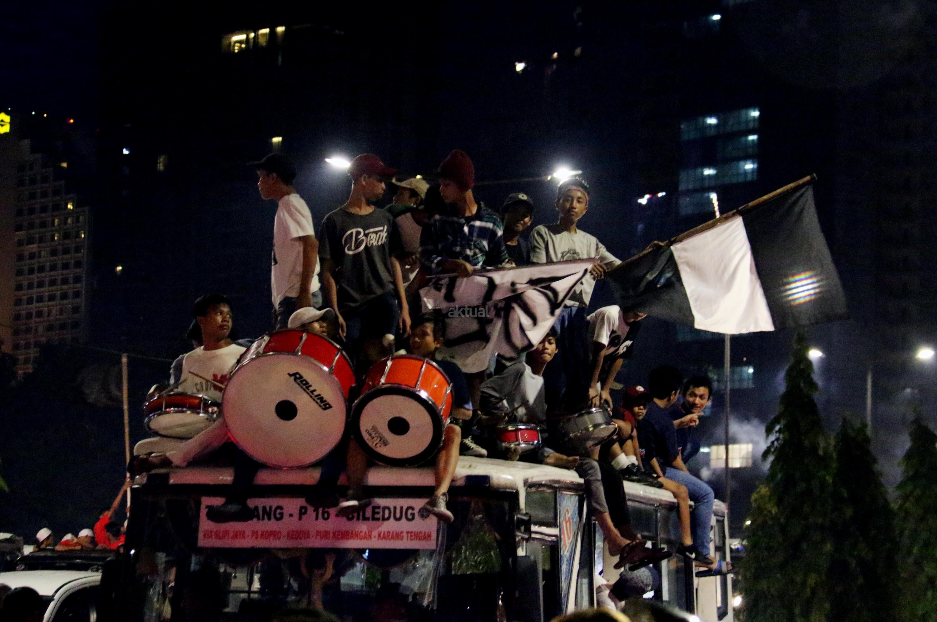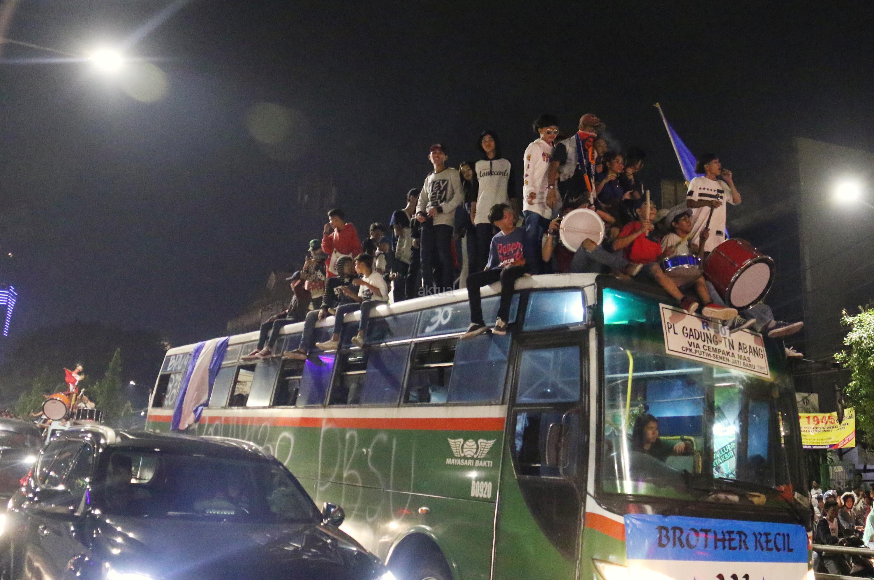Umat muslim menaiki atap bus ketika mengikuti malam takbir di Tanah Abang, Jakarta, Sabtu (24/6/2017). Kegiatan malam takbiran tersebut untuk menyambut Idul Fitri 1438 H yang jatuh pada Minggu (25/6/2017). AKTUAL/Munzir