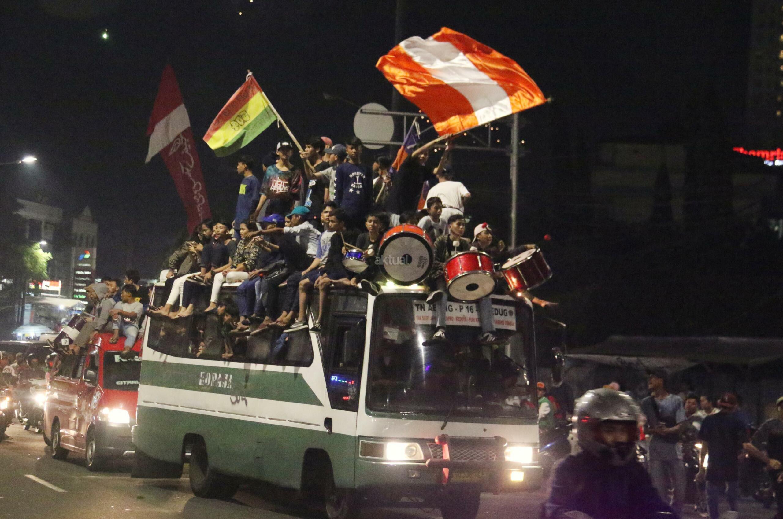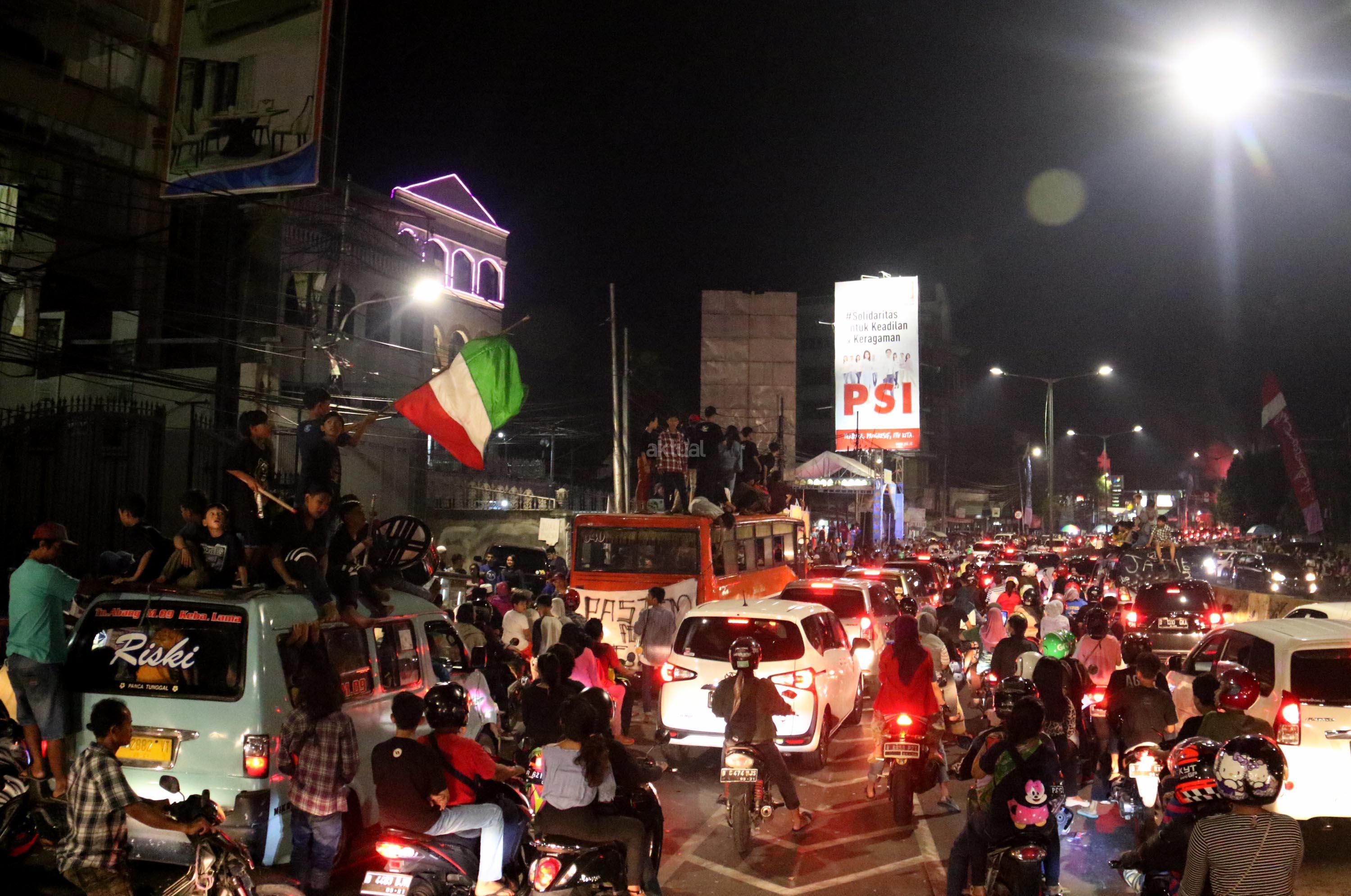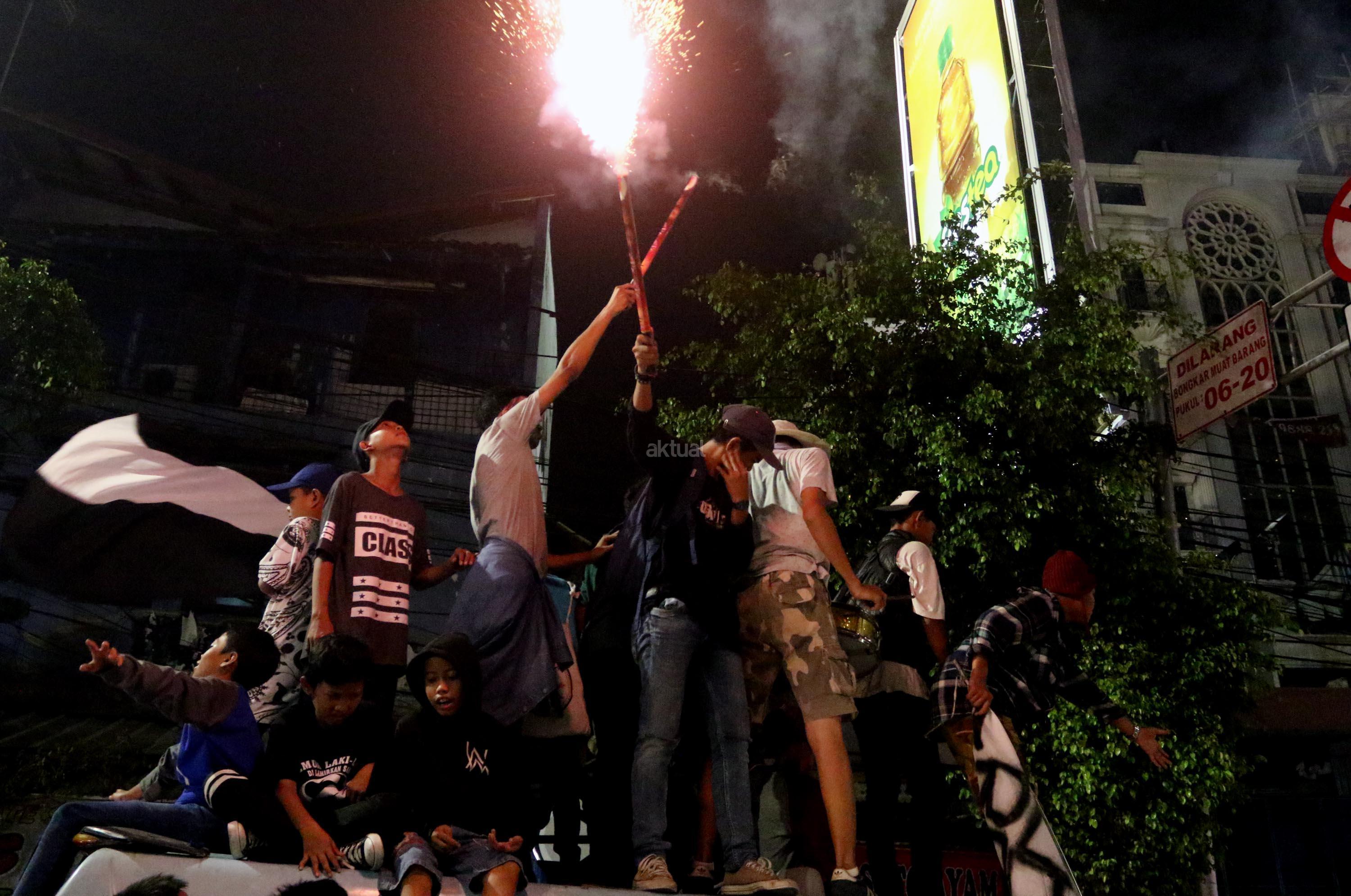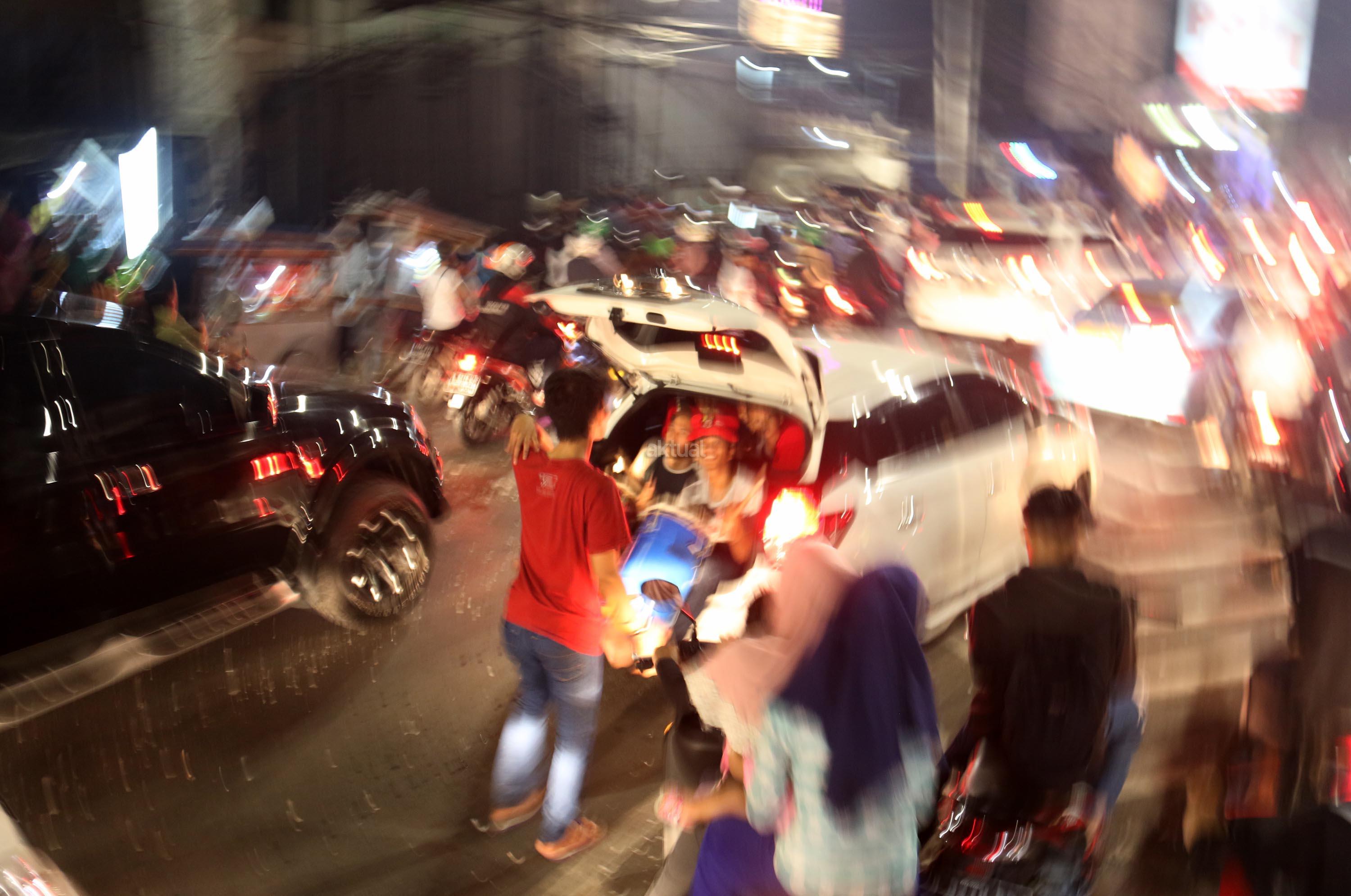 Umat muslim menaiki atap bus ketika mengikuti malam takbir di Tanah Abang, Jakarta, Sabtu (24/6/2017). Kegiatan malam takbiran tersebut untuk menyambut Idul Fitri 1438 H yang jatuh pada Minggu (25/6/2017). AKTUAL/Munzir