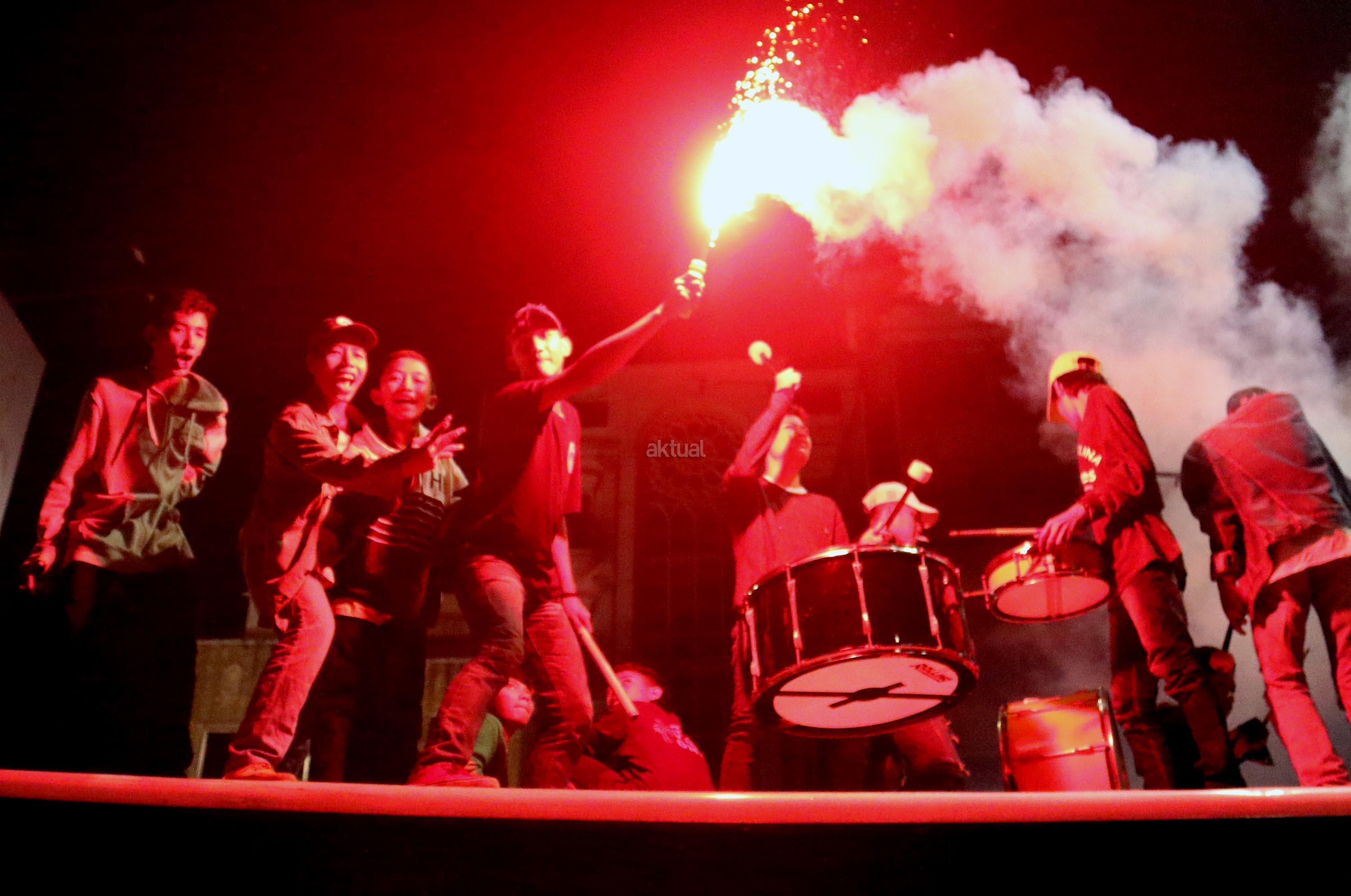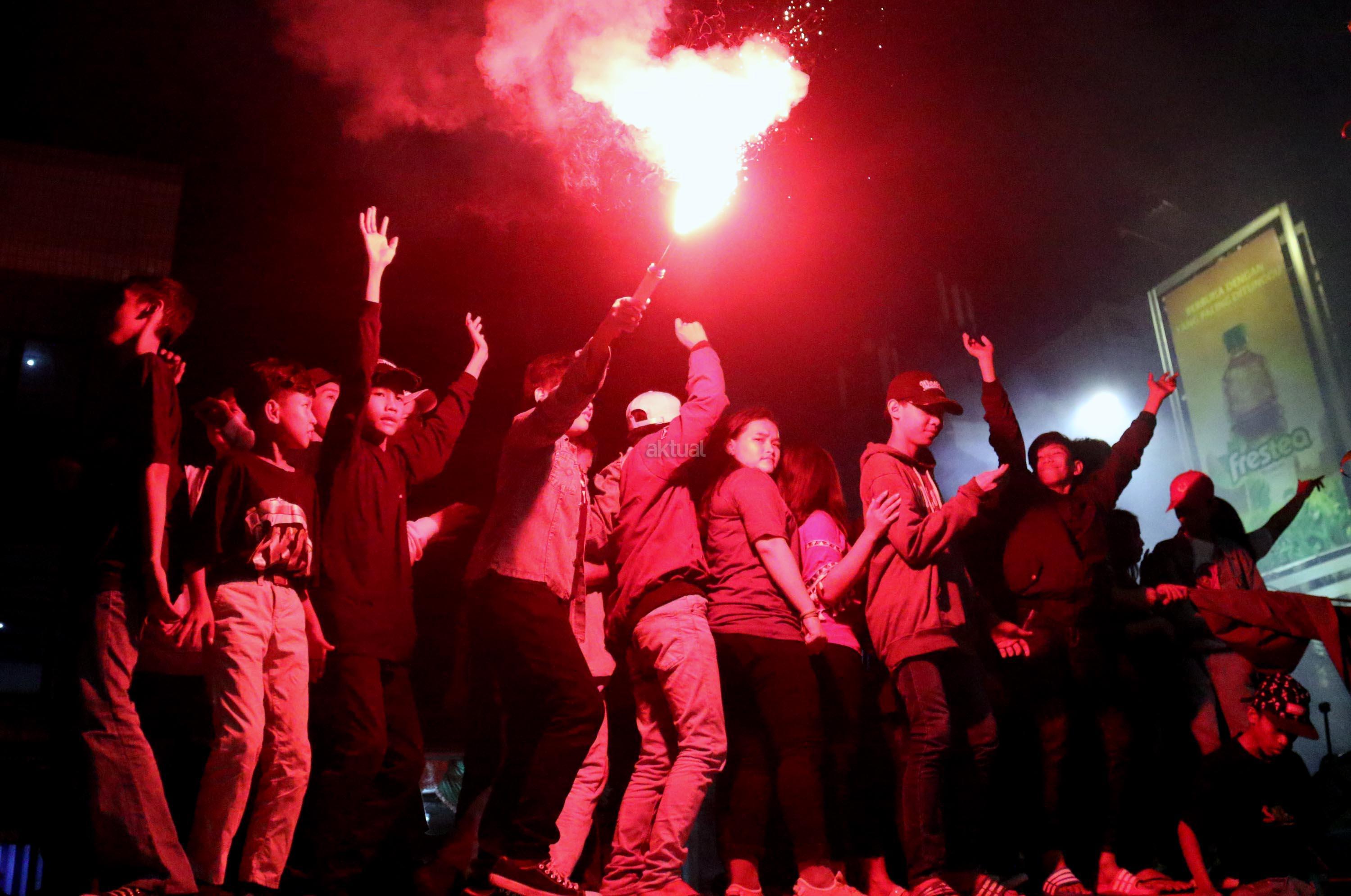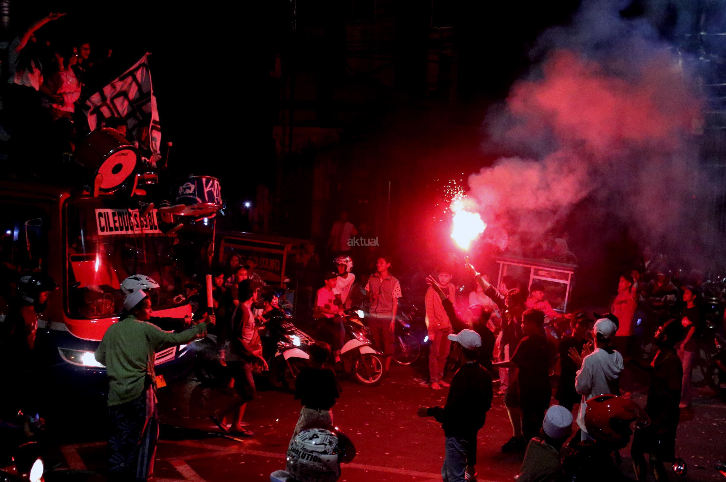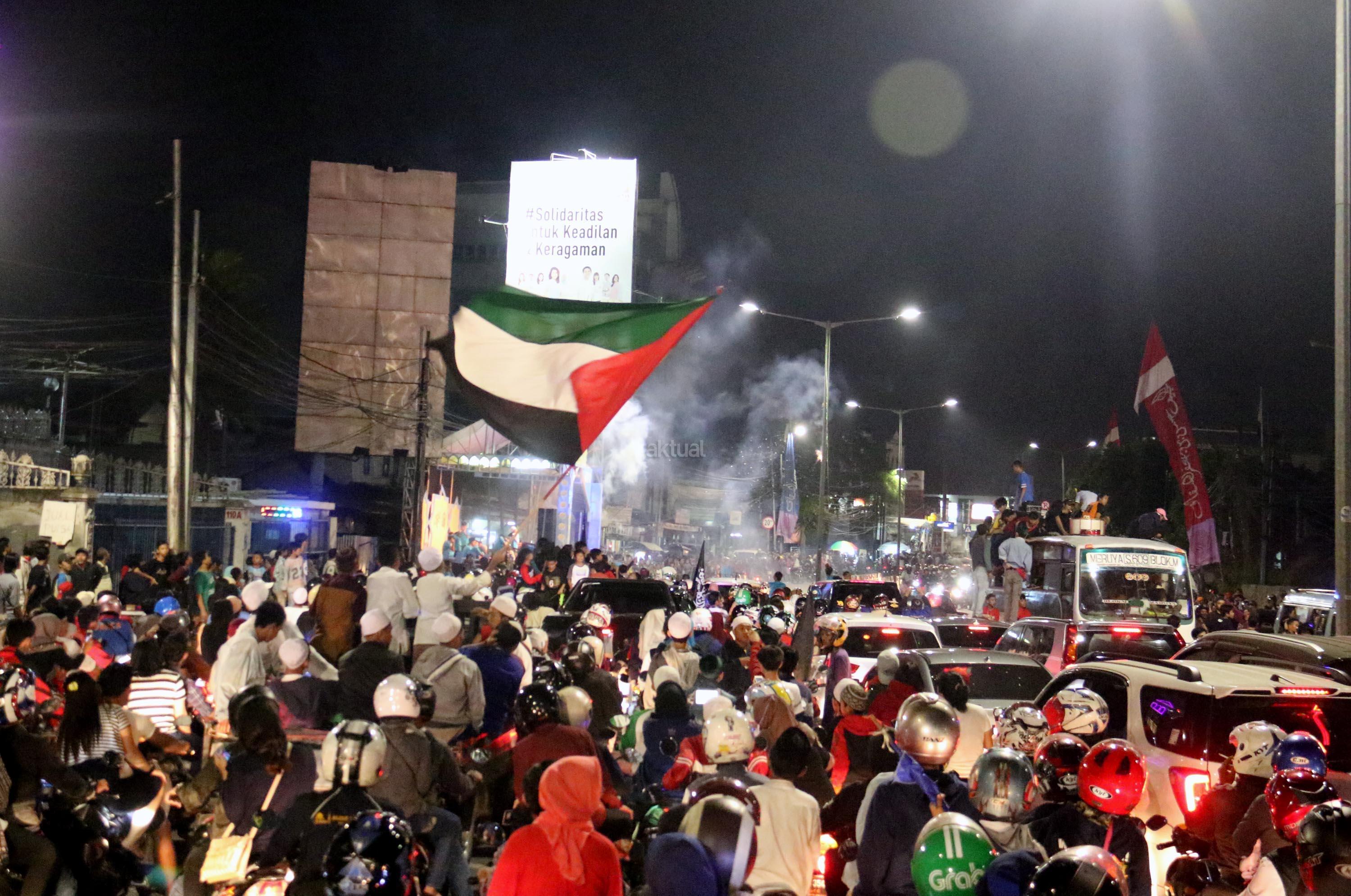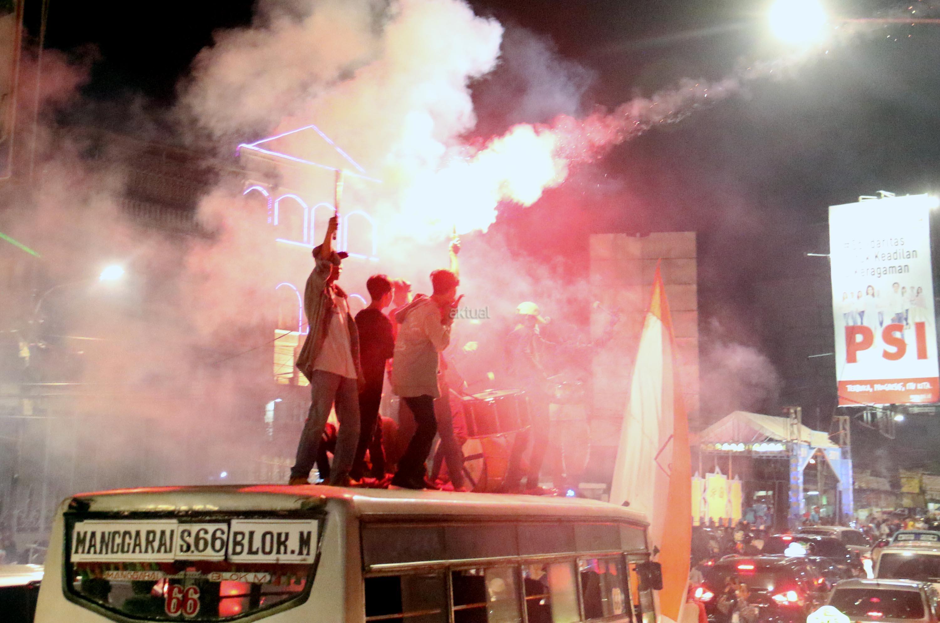 Umat muslim menaiki atap bus ketika mengikuti malam takbir di Tanah Abang, Jakarta, Sabtu (24/6/2017). Kegiatan malam takbiran tersebut untuk menyambut Idul Fitri 1438 H yang jatuh pada Minggu (25/6/2017). AKTUAL/Munzir