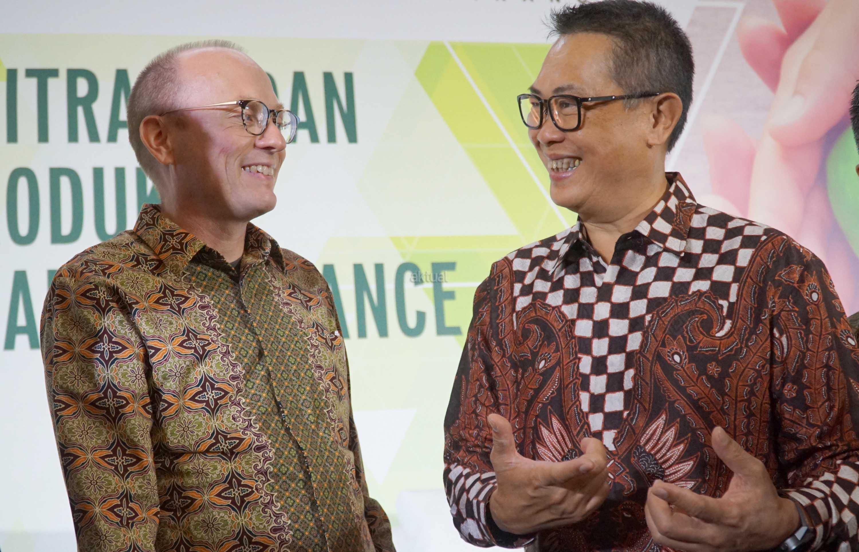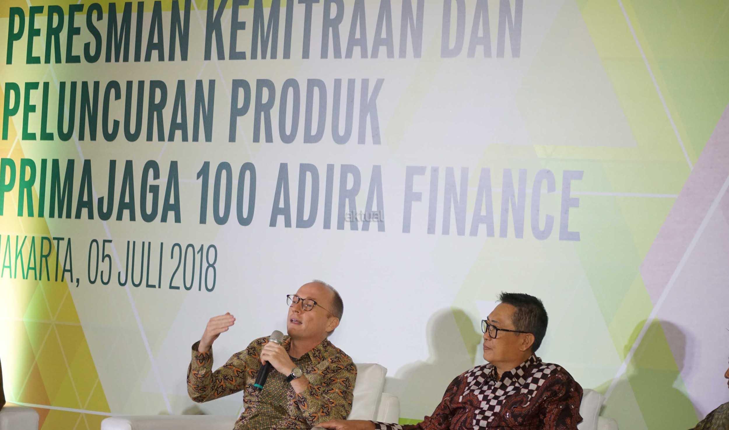 President Director & CEO Manulife Indonesia Jonathan Hekster (kiri) bersama dengan Presdir & CEO Adira Finance Hafid Hadeli berbincang disela peluncuran Primajaga 100 Adira Finance, di Jakarta, Kamis (5/7). Primajaga 100 Adira Finance merupakan produk asuransi jiwa hadir untuk harga terjangkau yang fleksibel dan untuk para konsumen terhadap resiko meninggal dunia dan ketidakmampuan total tetap dan dipasarkan melalui ratusan cabang Adira Finance yang tersebar di seluruh Indonesia. AKTUAL/Eko S Hilman