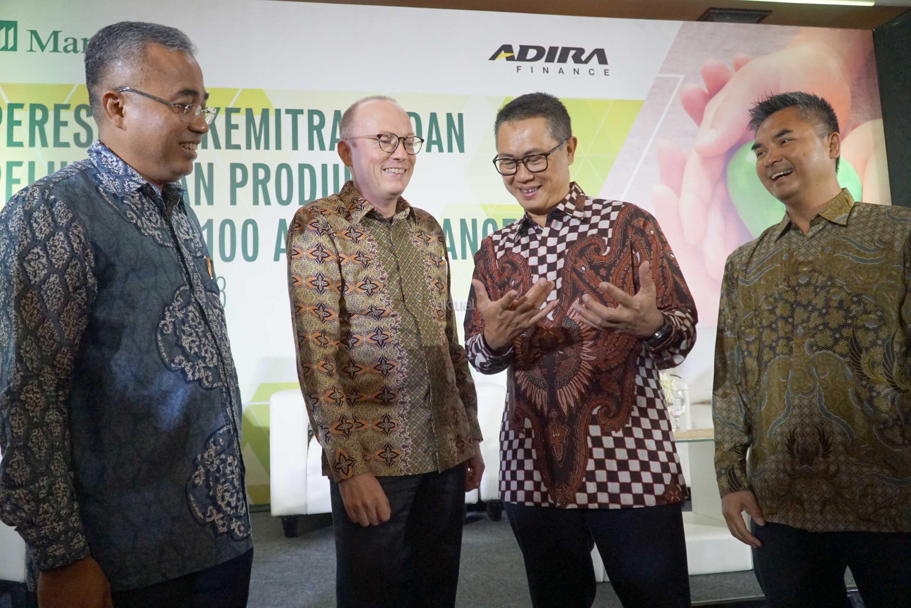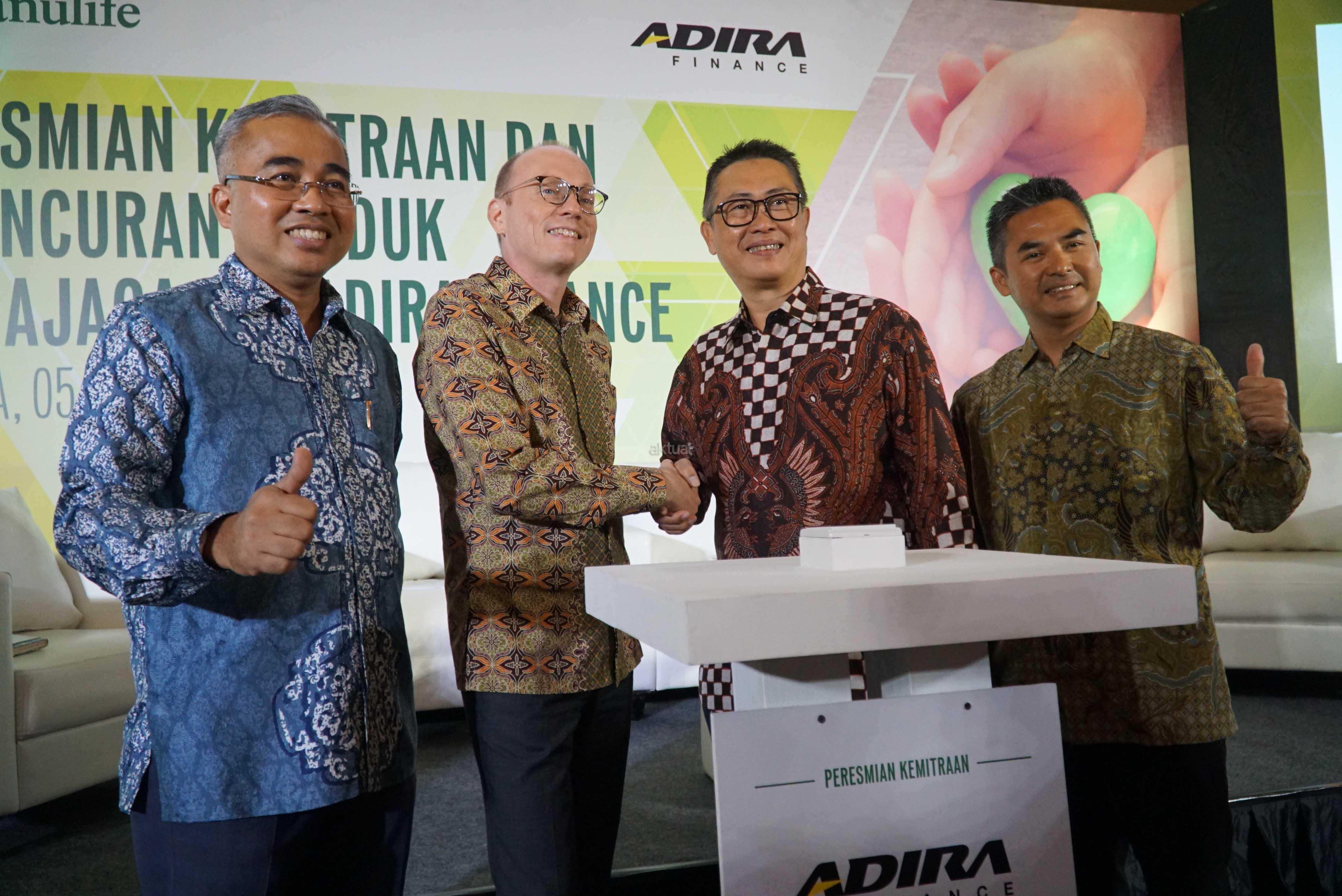 President Director & CEO Manulife Indonesia Jonathan Hekster (kedua kiri) bersama SVP & Head of Partnership Business Norman Tetelepta (kiri), berjabat tangan dengan Presdir & CEO Adira Finance Hafid Hadeli (kedua kanan), didampingi Head of National Fleet Sales Agus Hamid saling berbincang disela peluncuran Primajaga 100 Adira Finance, di Jakarta, Kamis (5/7). Primajaga 100 Adira Finance merupakan produk asuransi jiwa hadir untuk harga terjangkau yang fleksibel dan untuk para konsumen terhadap resiko meninggal dunia dan ketidakmampuan total tetap dan dipasarkan melalui ratusan cabang Adira Finance yang tersebar di seluruh Indonesia. AKTUAL/Eko S Hilman