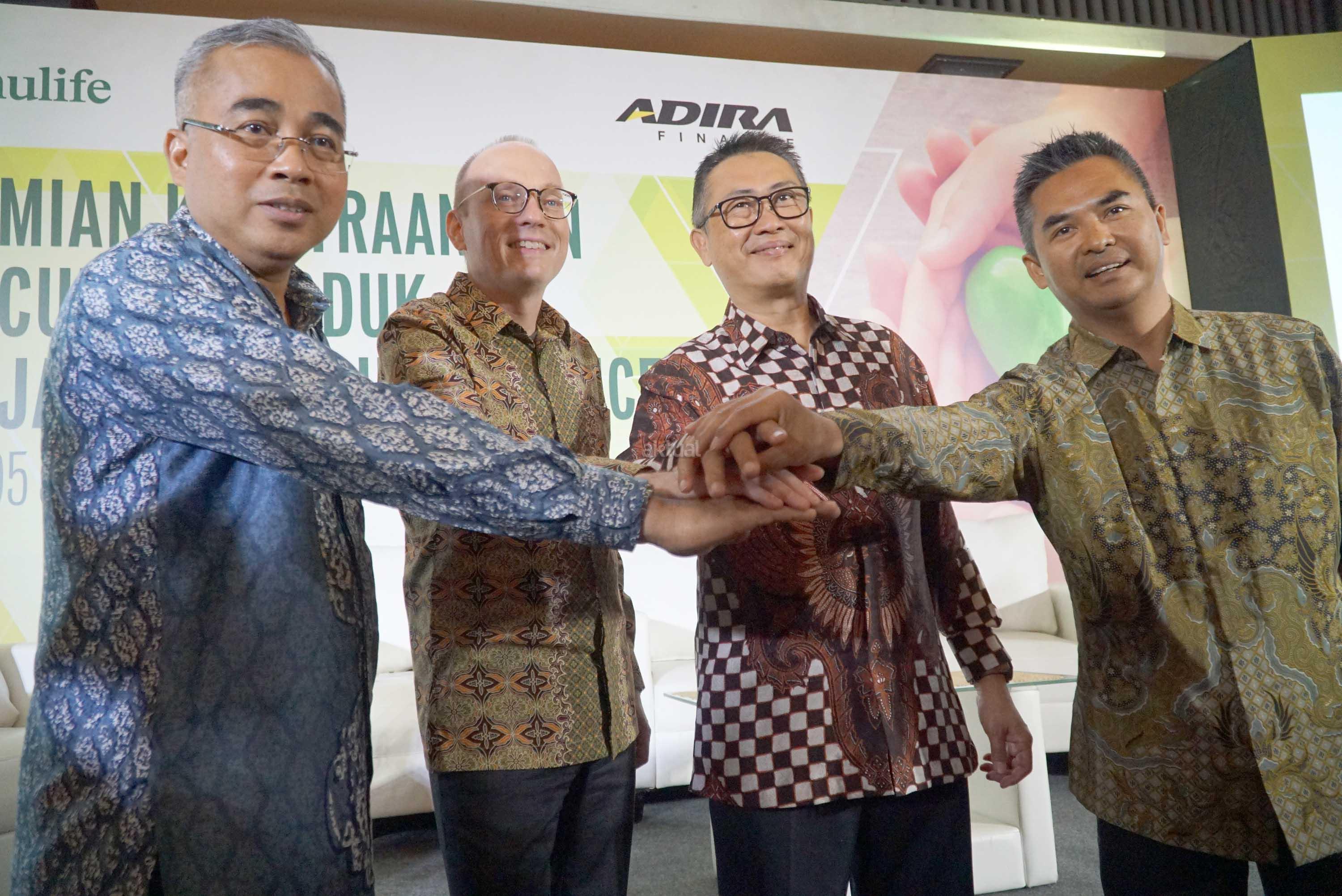 President Director & CEO Manulife Indonesia Jonathan Hekster (kedua kiri) didampingi SVP & Head of Partnership Business Norman Tetelepta (kiri), berjabat tangan dengan Presdir & CEO Adira Finance Hafid Hadeli (kedua kanan), didampingi Head of National Fleet Sales Agus Hamid, saat peluncuran Primajaga 100 Adira Finance, di Jakarta, Kamis (5/7). Primajaga 100 Adira Finance merupakan produk asuransi jiwa hadir untuk harga terjangkau yang fleksibel dan untuk para konsumen terhadap resiko meninggal dunia dan ketidakmampuan total tetap dan dipasarkan melalui ratusan cabang Adira Finance yang tersebar di seluruh Indonesia. AKTUAL/Eko S Hilman