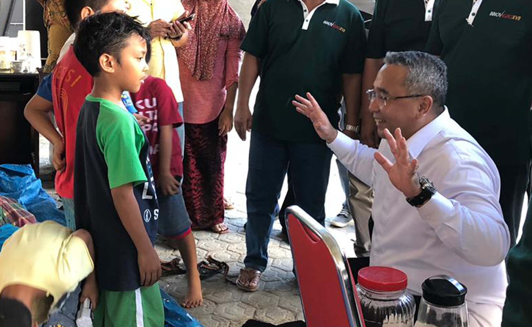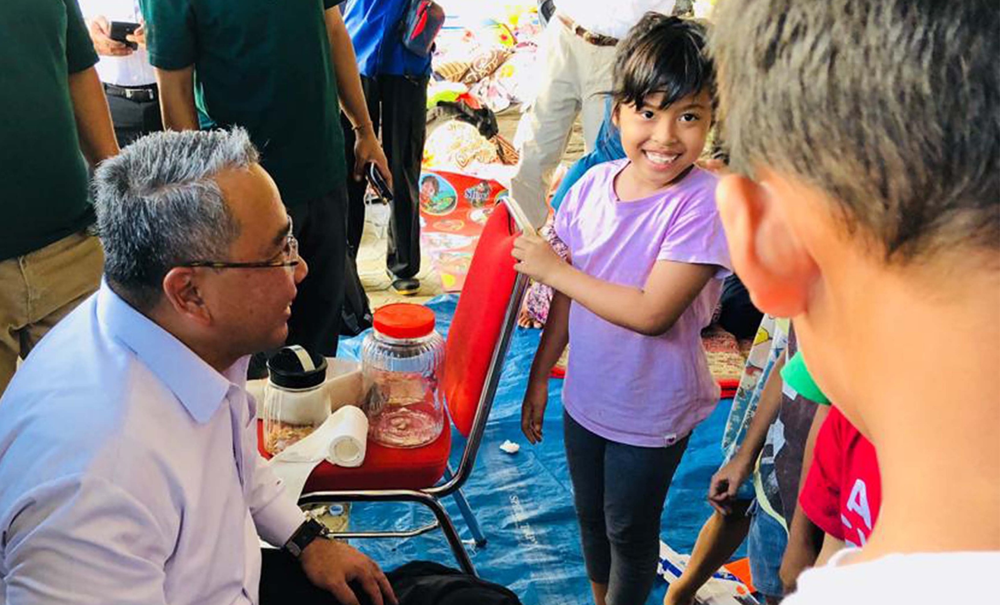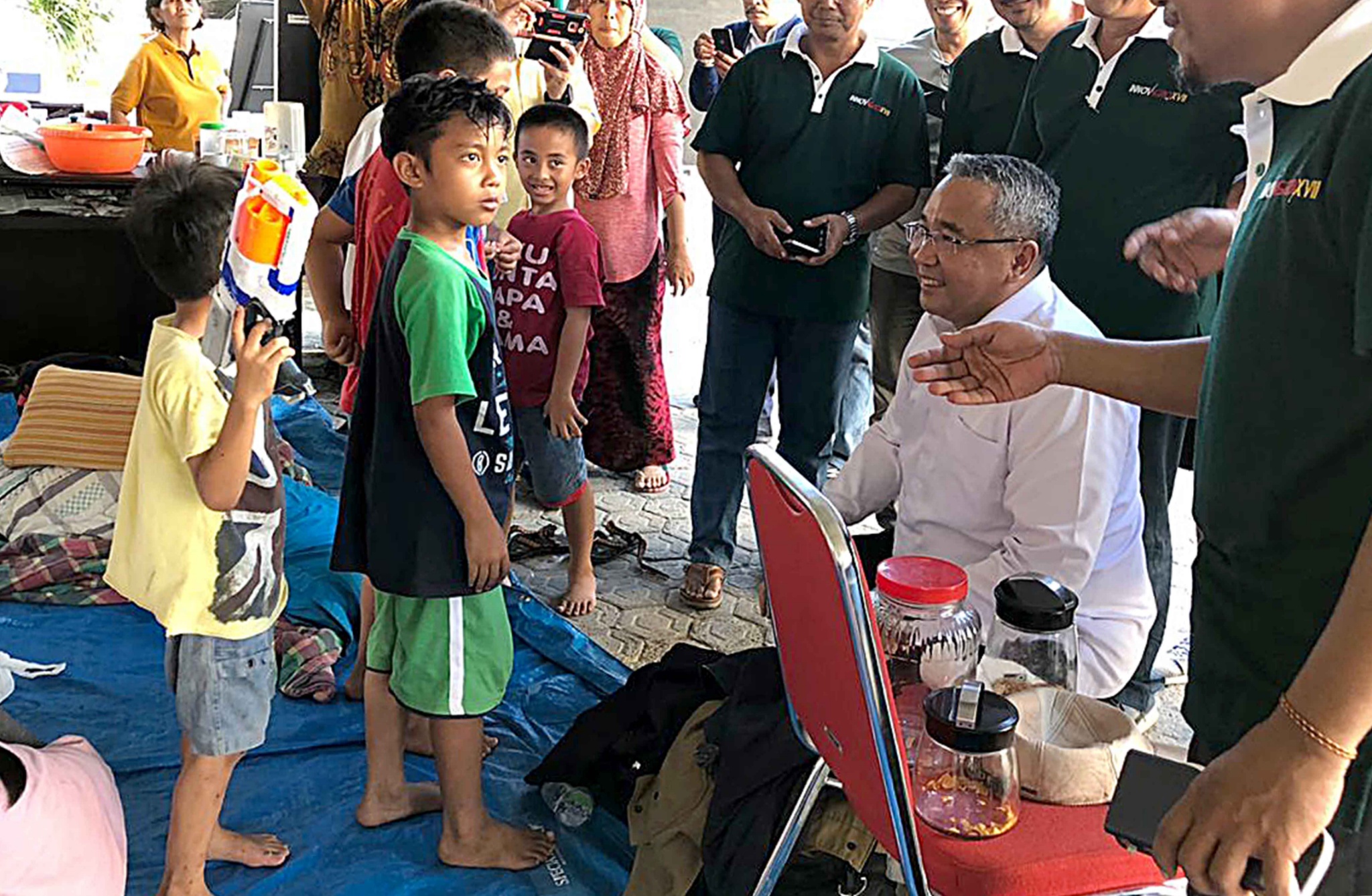 Menteri Desa, Pembangunan Daerah Tertinggal, dan Transmigrasi (Mendes PDTT) Eko Putro Sandjojo, berdialog dengan anak-anak yang menjadi korban gempa saat persiapan posko pengungsi di Balai Transmigrasi Kota Palu, Sulawesi Tengah, Selasa (2/10). Posko dibantu dari perusahaan swasta dan BUMN (Badan Usaha Milik Negara) dapat menampung hingga 2.000 pengungsi dan menyediakan kebutuhan logistik serta tenaga medis. AKTUAL/Dok Kemendes