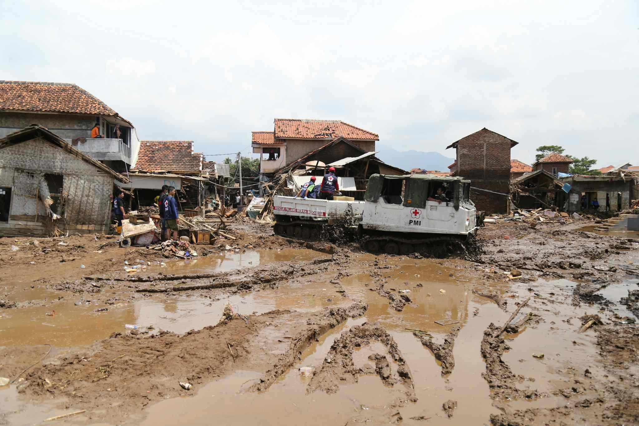 Kendaran hagglund milik Palang Merah Indonesia (PMI) melintas medan berlumpur di Kampung Bojong Sudika, Cimacan, Garut, Jumat (23/9). Kendaraan hagglund dikerahkan PMI untuk mempermudah mobilisasi sukarelawan dan proses evakuasi di tengah kawasan yang penuh lumpur akibat terjangan banjir bandang. AKTUAL/TINO OKTAVIANO