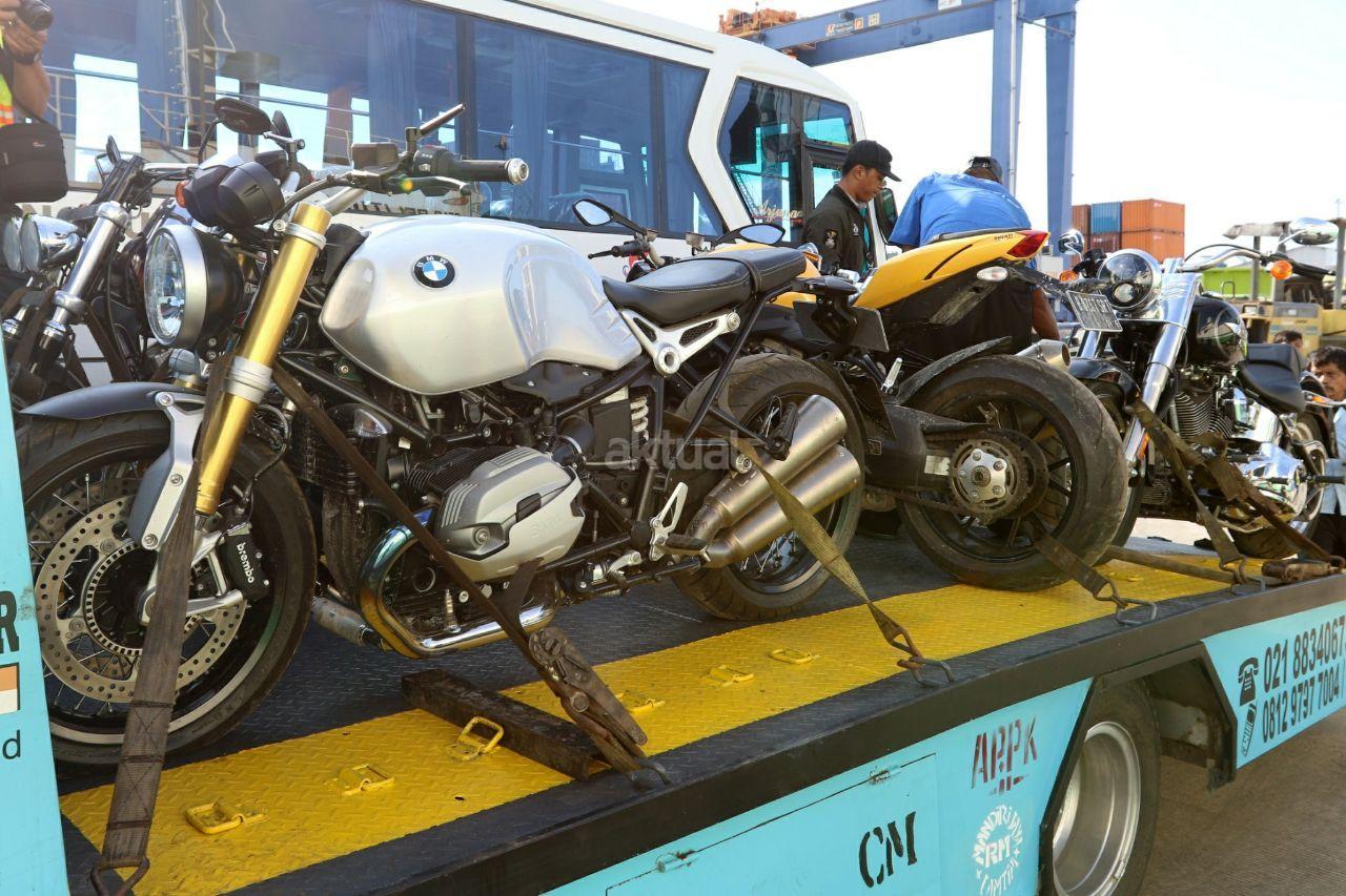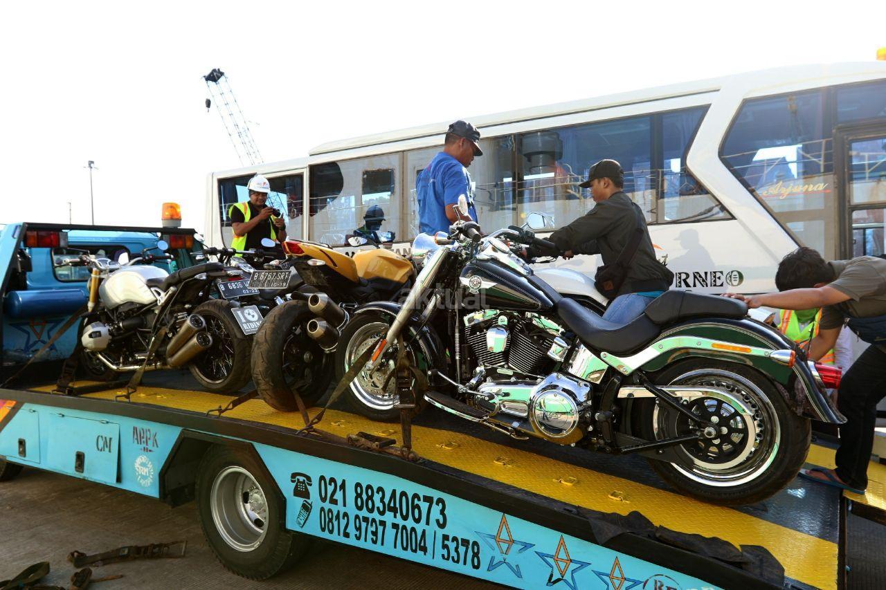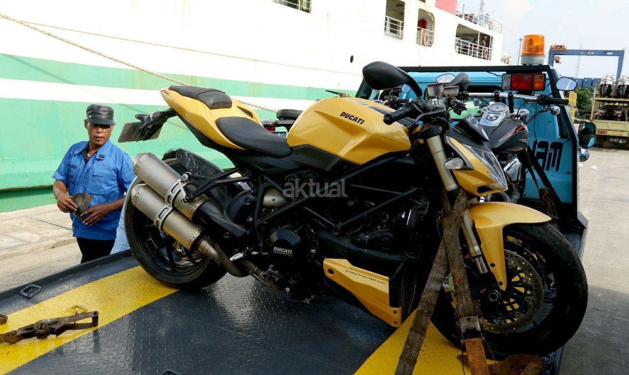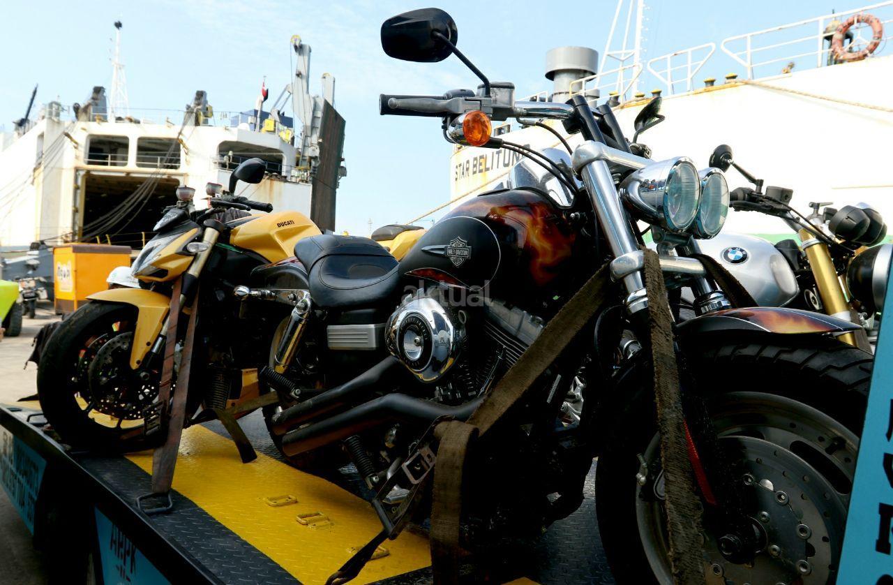 Sejumlah motor mewah milik tersangka Bupati Hulu Sungai Tengah (nonaktif) Abdul Latif tiba Pelabuhan Tanjung Priok, Jakarta Utara, Senin (19/3). Sebanyak 16 kendaraan mewah (delapan mobil dan delapan motor) sitaan KPK dari Kalimantan Selatan yang diduga hasil gratifikasi serta pencucian uang tersangka tersebut telah tiba di Jakarta dan akan dititipkan ke Rumah Penyimpanan Benda Sitaan Negara Jakarta Barat. AKTUAL/Tino Oktaviano