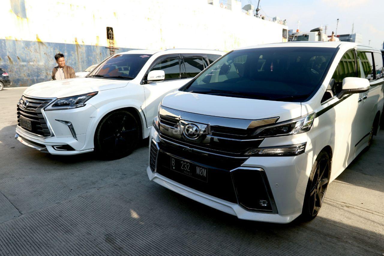 Petugas keamanan berjalan di dekat mobil mewah milik tersangka Bupati Hulu Sungai Tengah (nonaktif) Abdul Latif di Pelabuhan Tanjung Priok, Jakarta Utara, Senin (19/3). Sebanyak 16 kendaraan mewah (delapan mobil dan delapan motor) sitaan KPK dari Kalimantan Selatan yang diduga hasil gratifikasi serta pencucian uang tersangka tersebut telah tiba di Jakarta dan akan dititipkan ke Rumah Penyimpanan Benda Sitaan Negara Jakarta Barat. AKTUAL/Tino Oktaviano