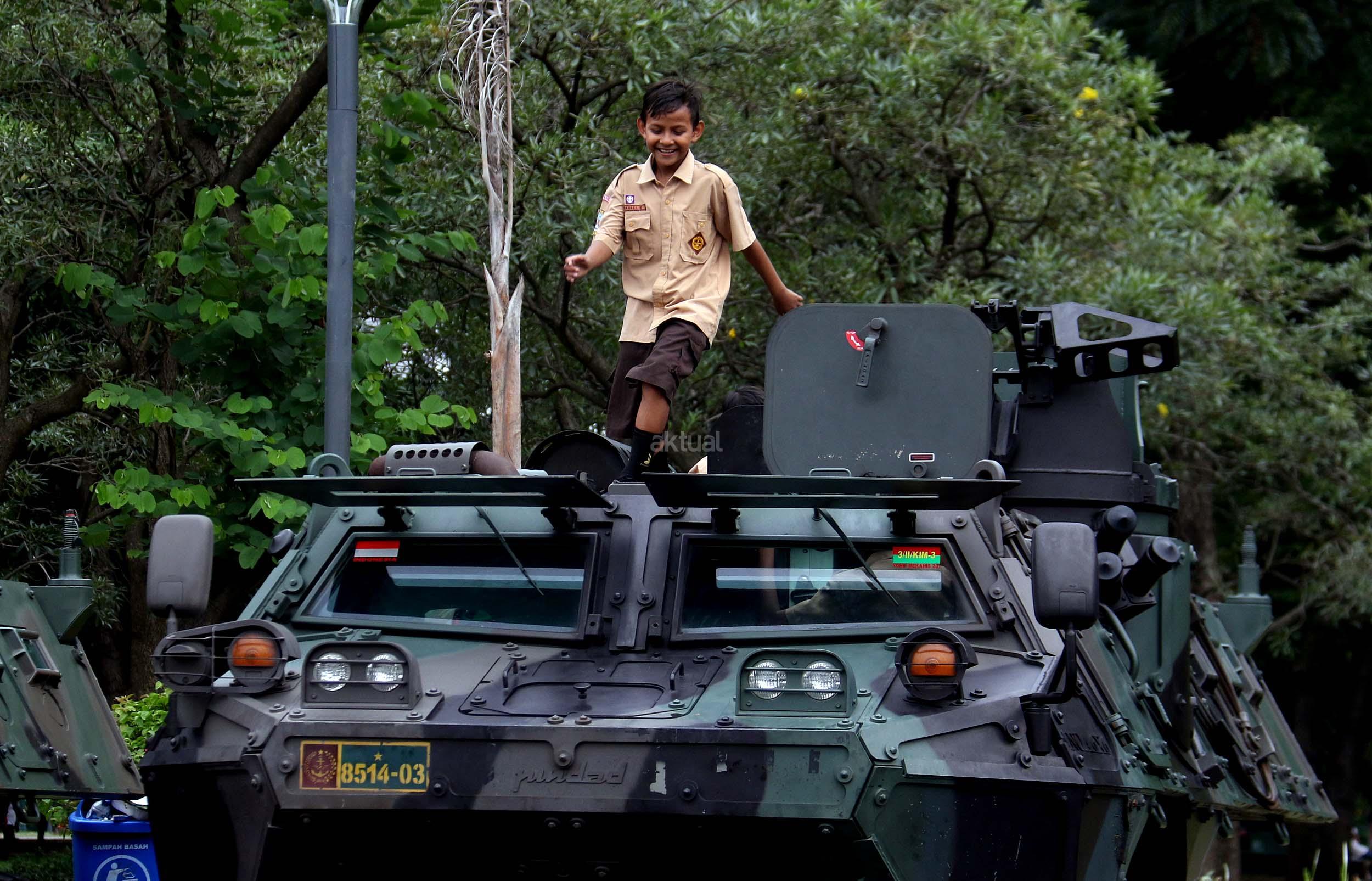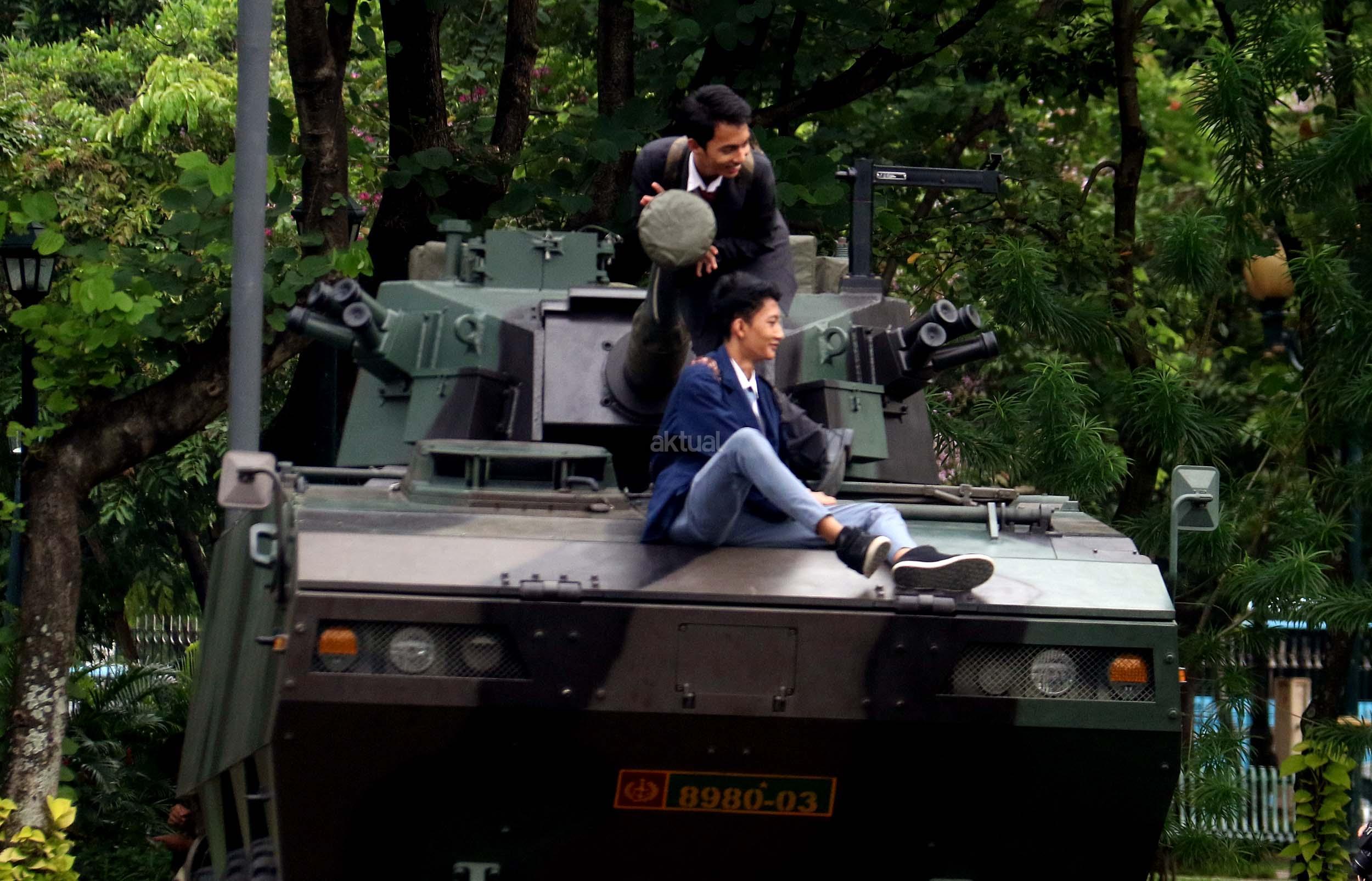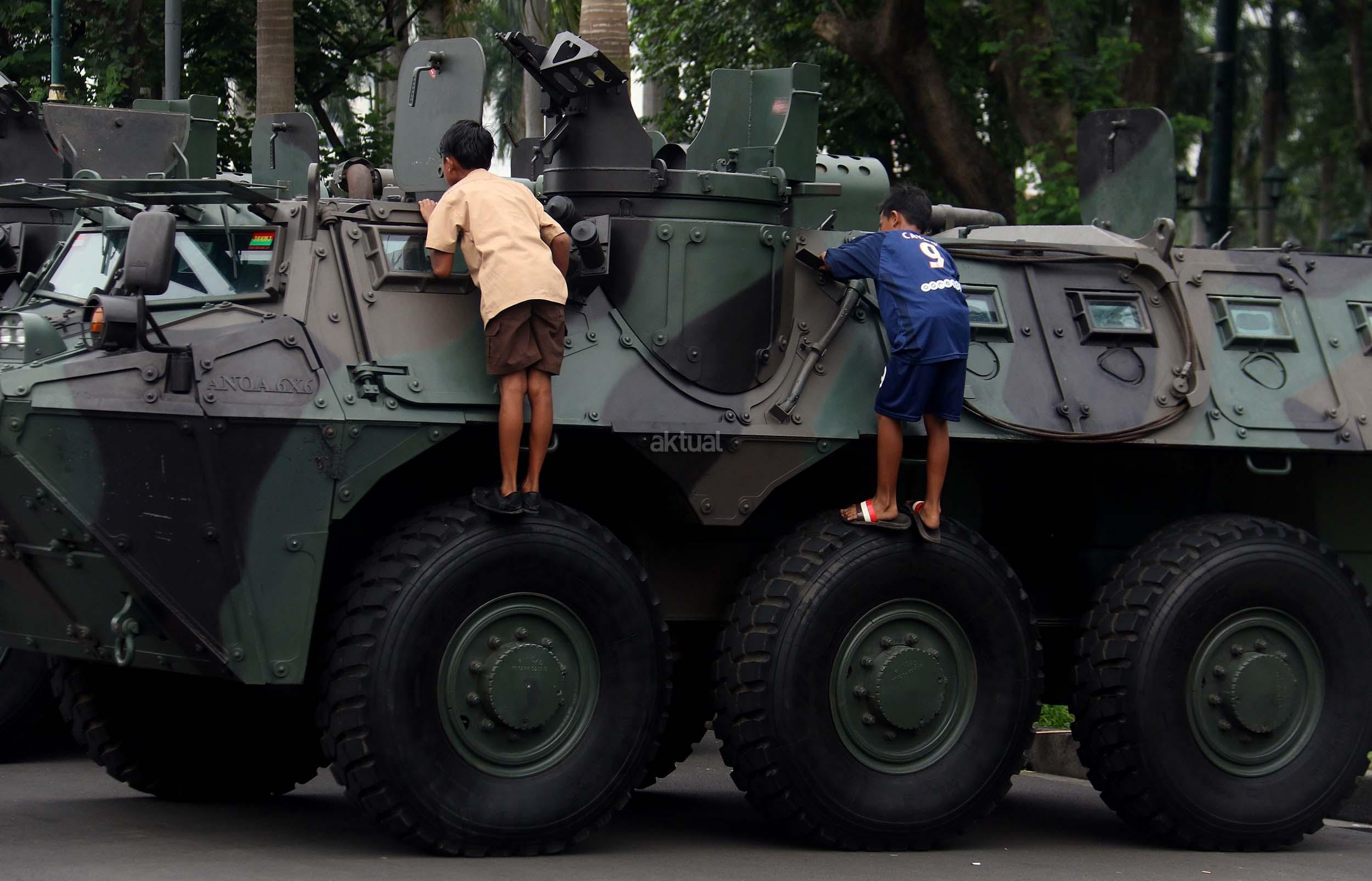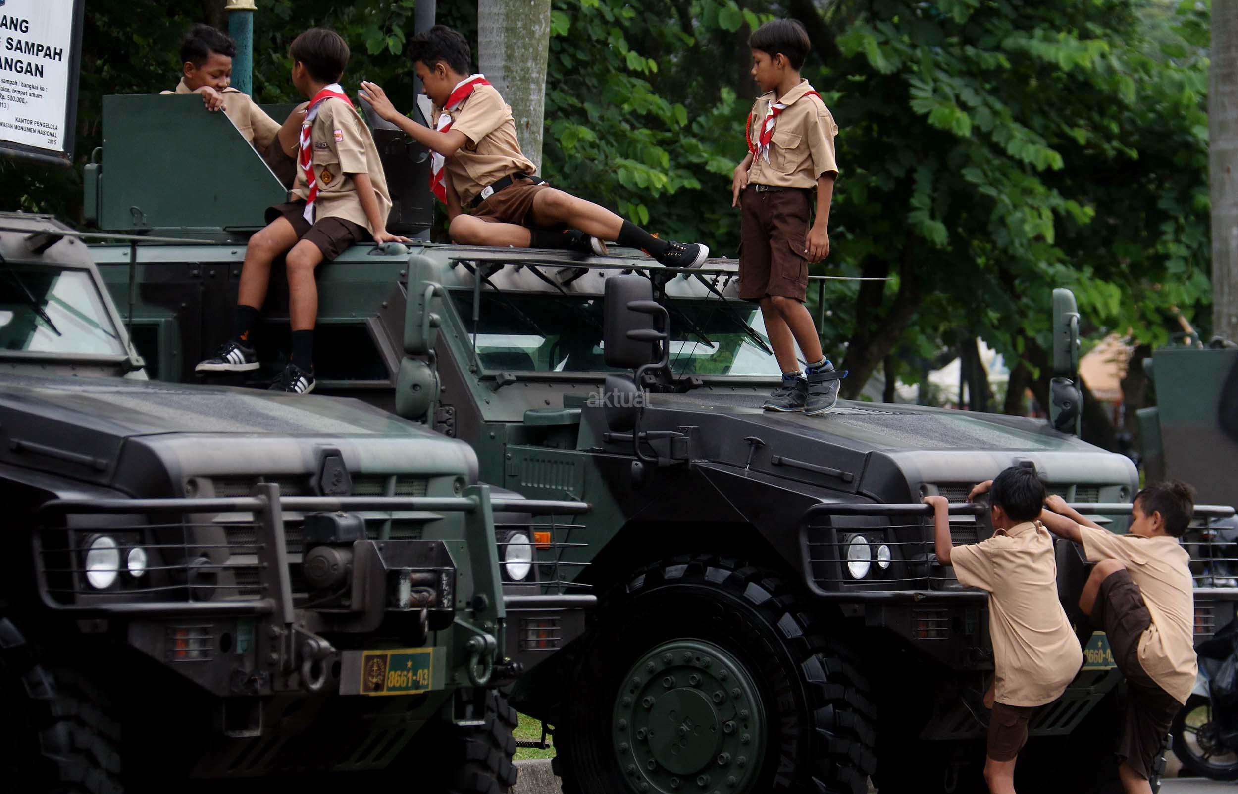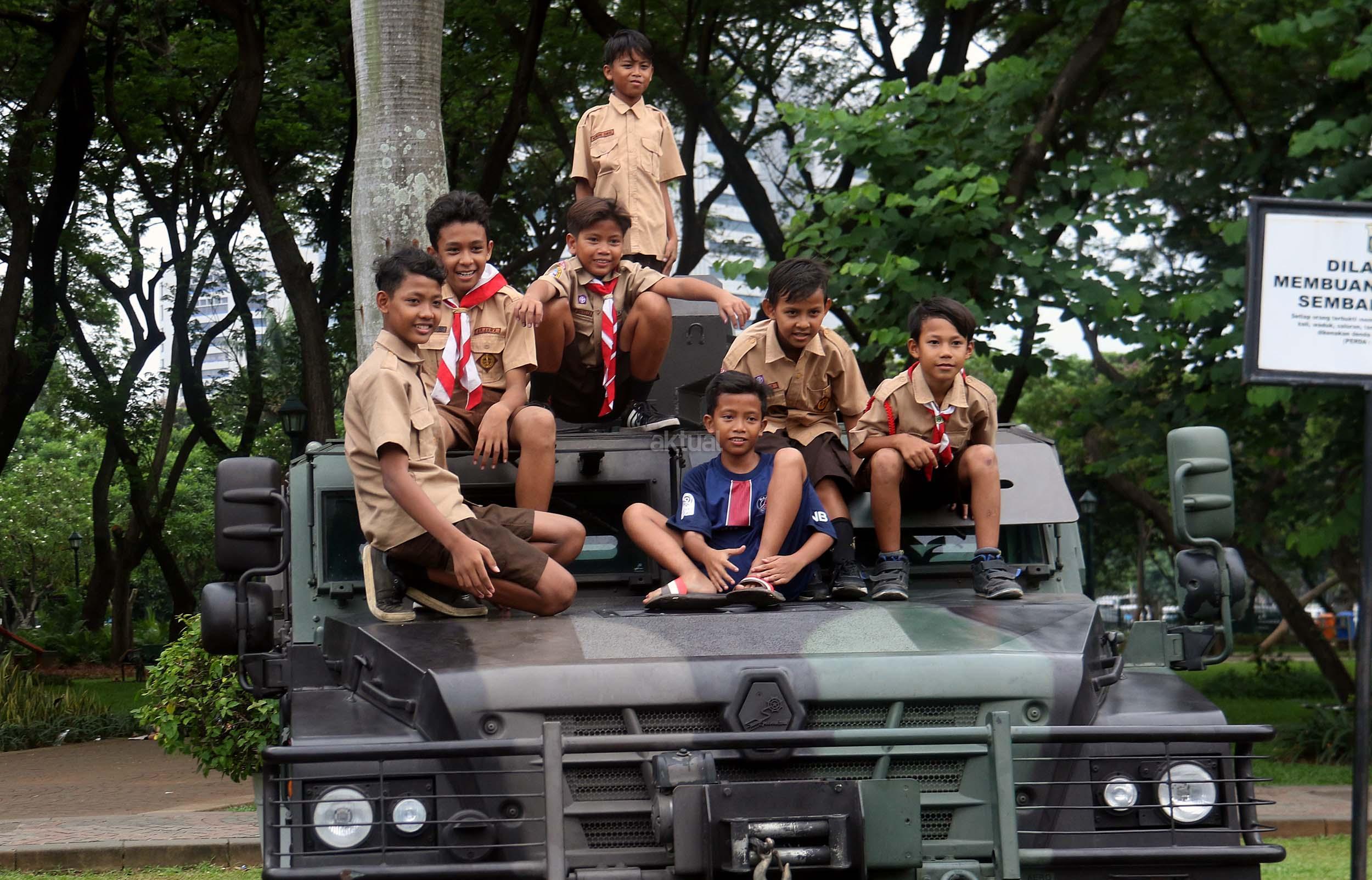 Para pelajar asyik bermain diatas kendaraan taktis milik TNI di silang Monas, Jakarta, Rabu (30/11/2016). Kendaraan taktis milik TNI disiagakan untuk pengamanan aksi 212 atau Aksi Bela Islam III yang rencananya akan menggelar sholat Jumat akbar di silang Monas pada 2 Desember 2016 nanti. AKTUAL/Munzir