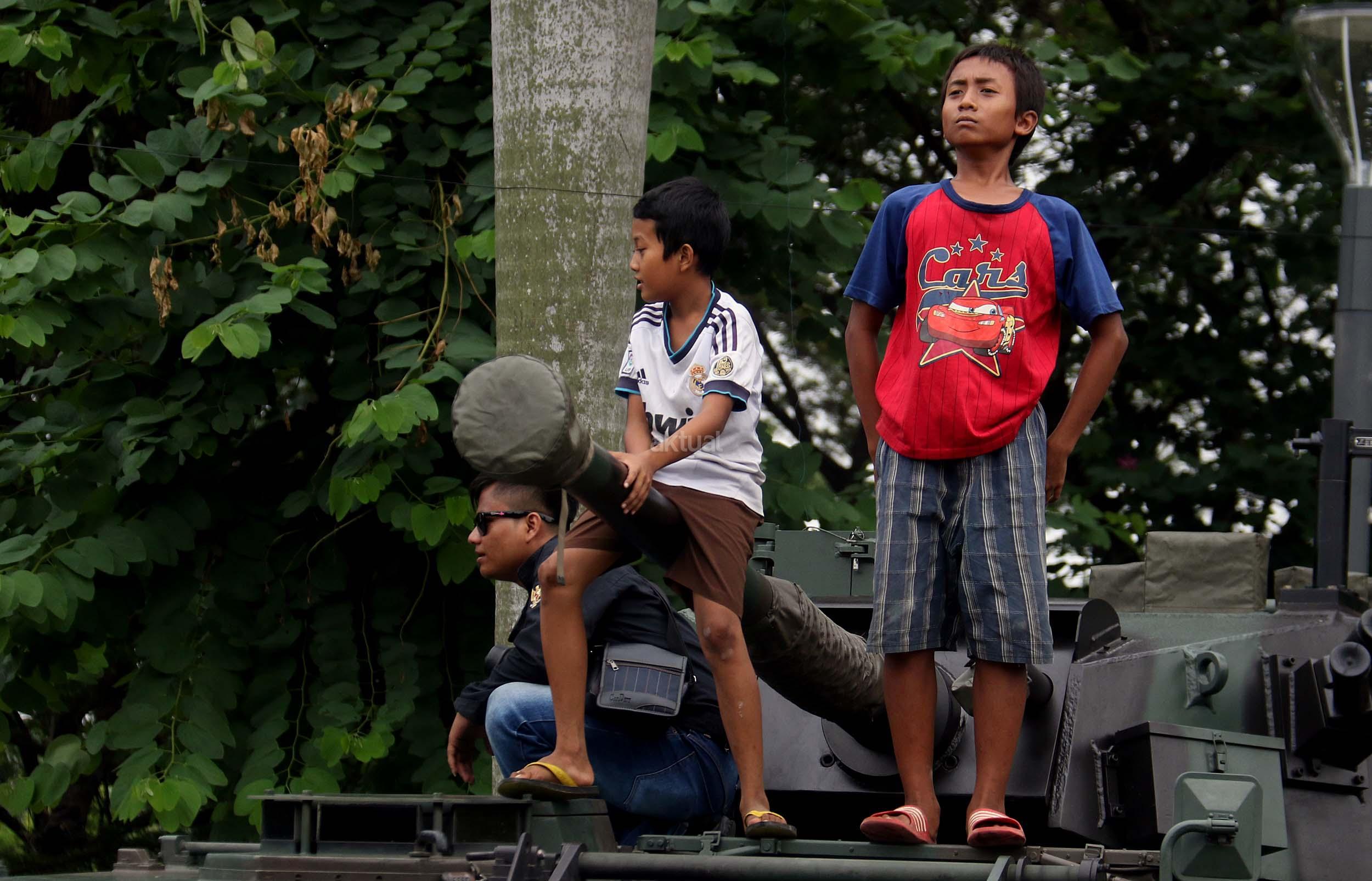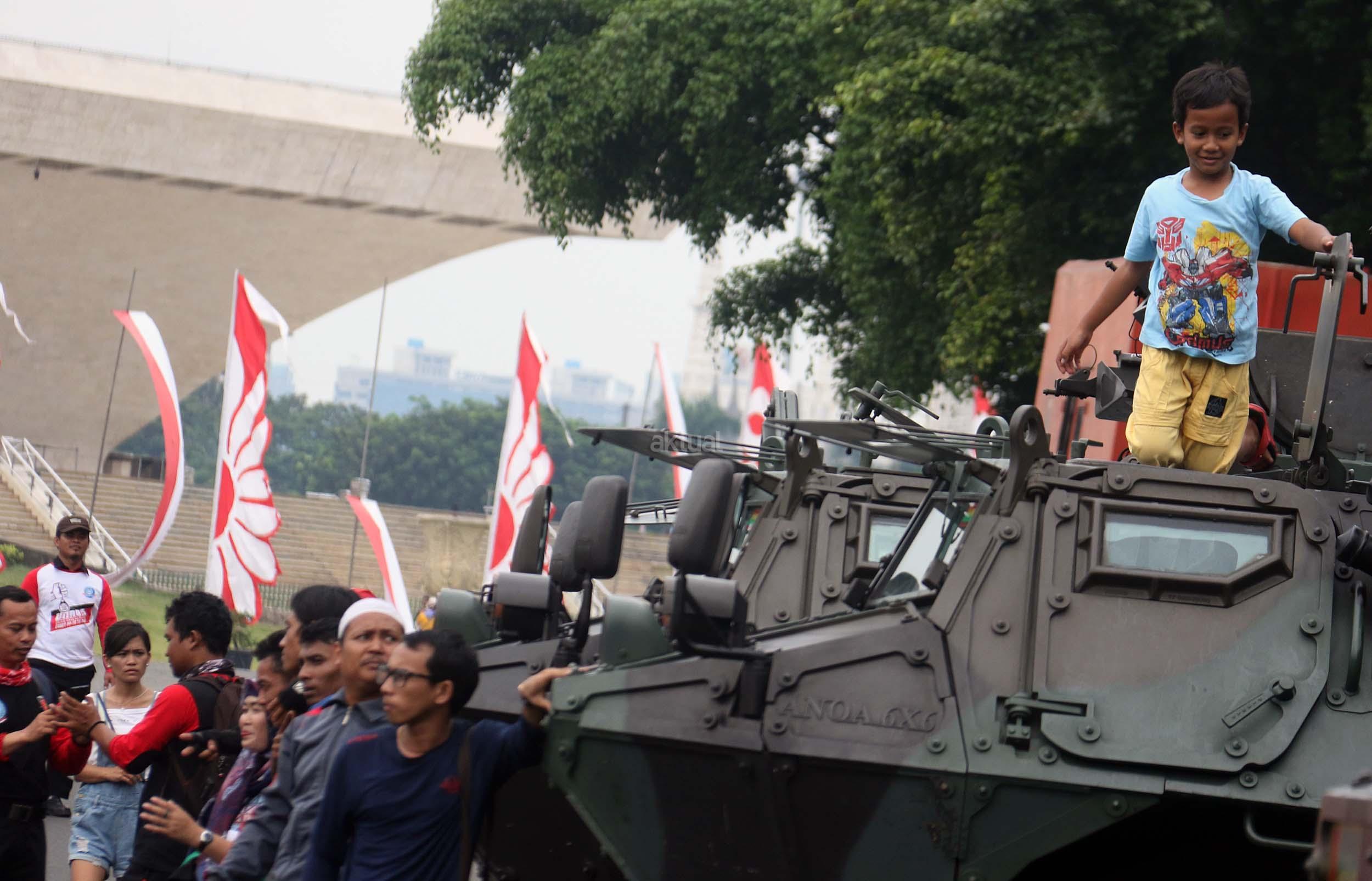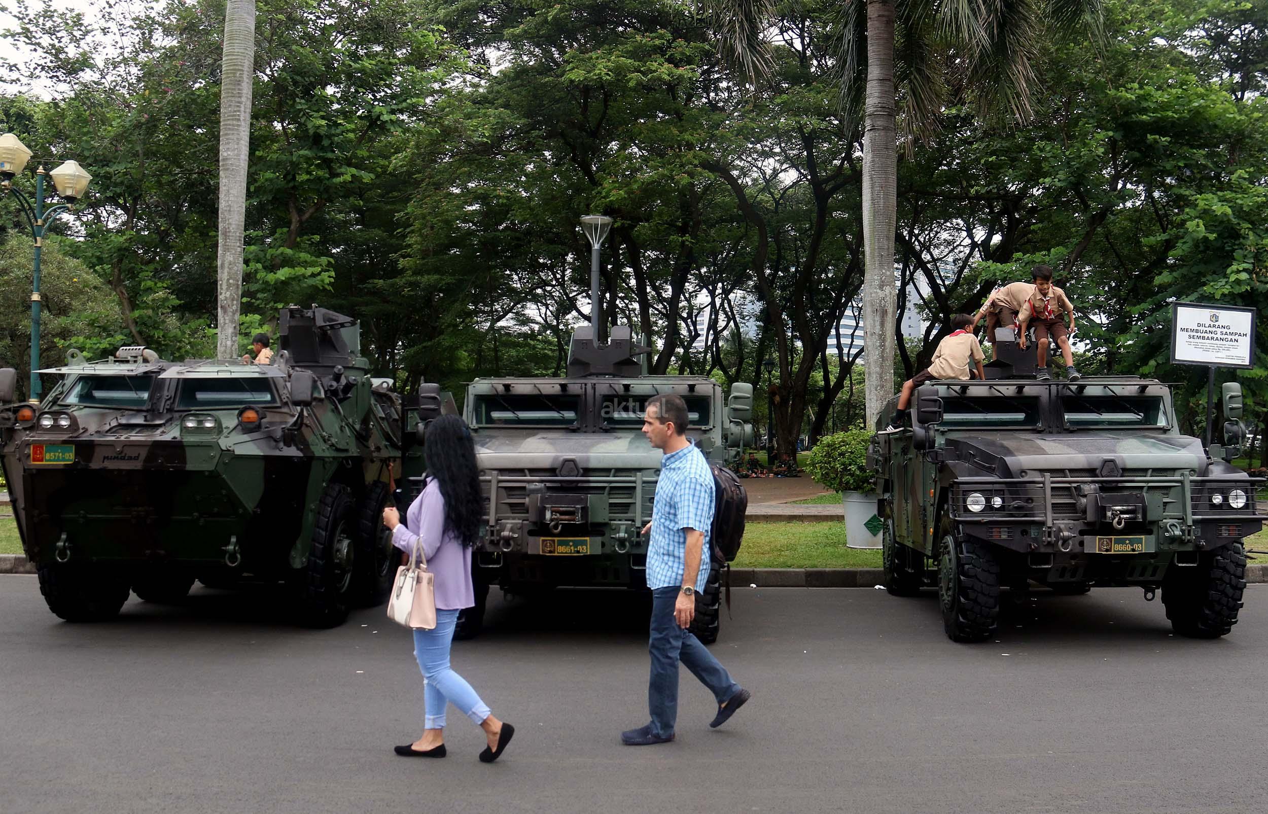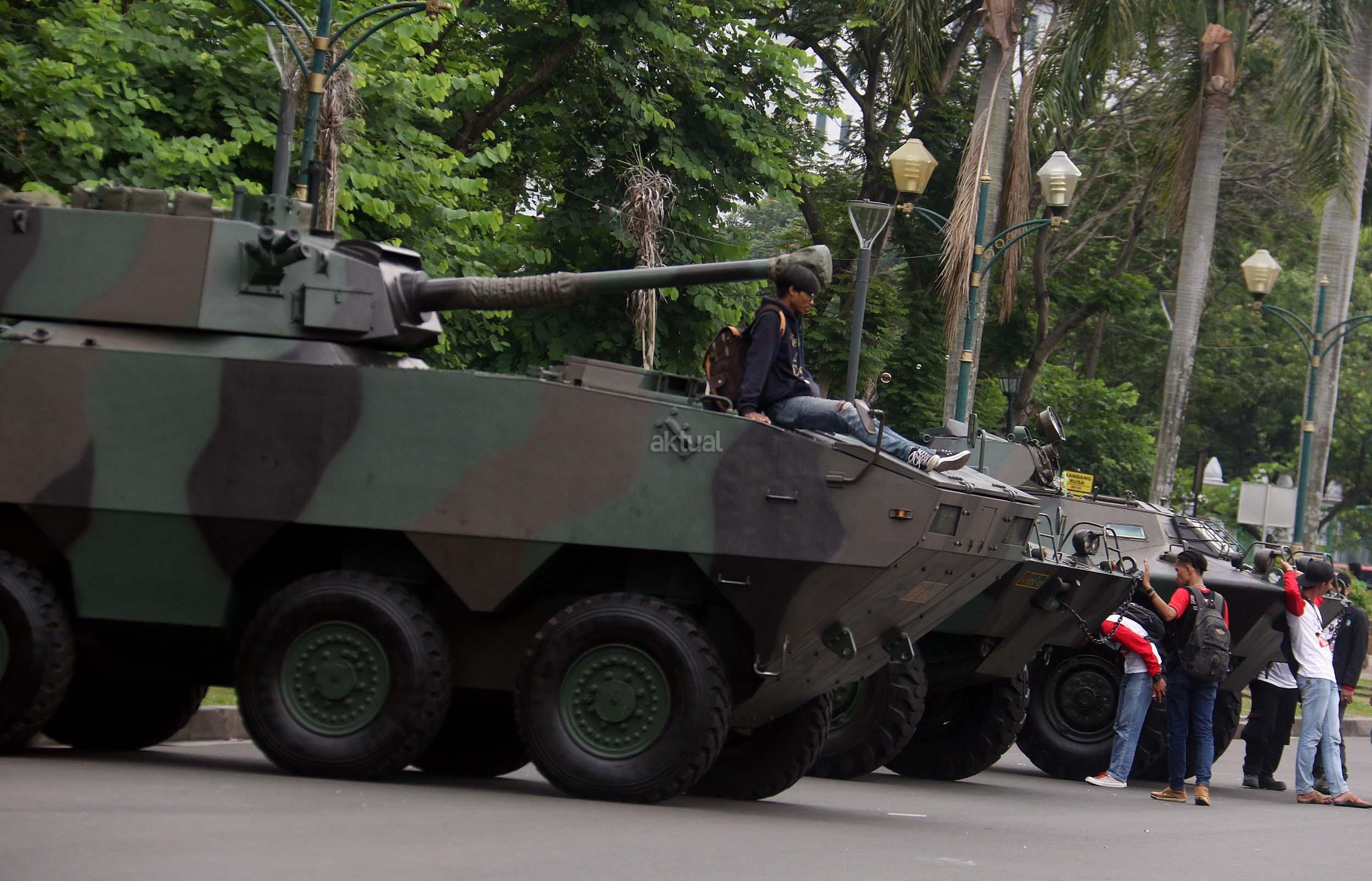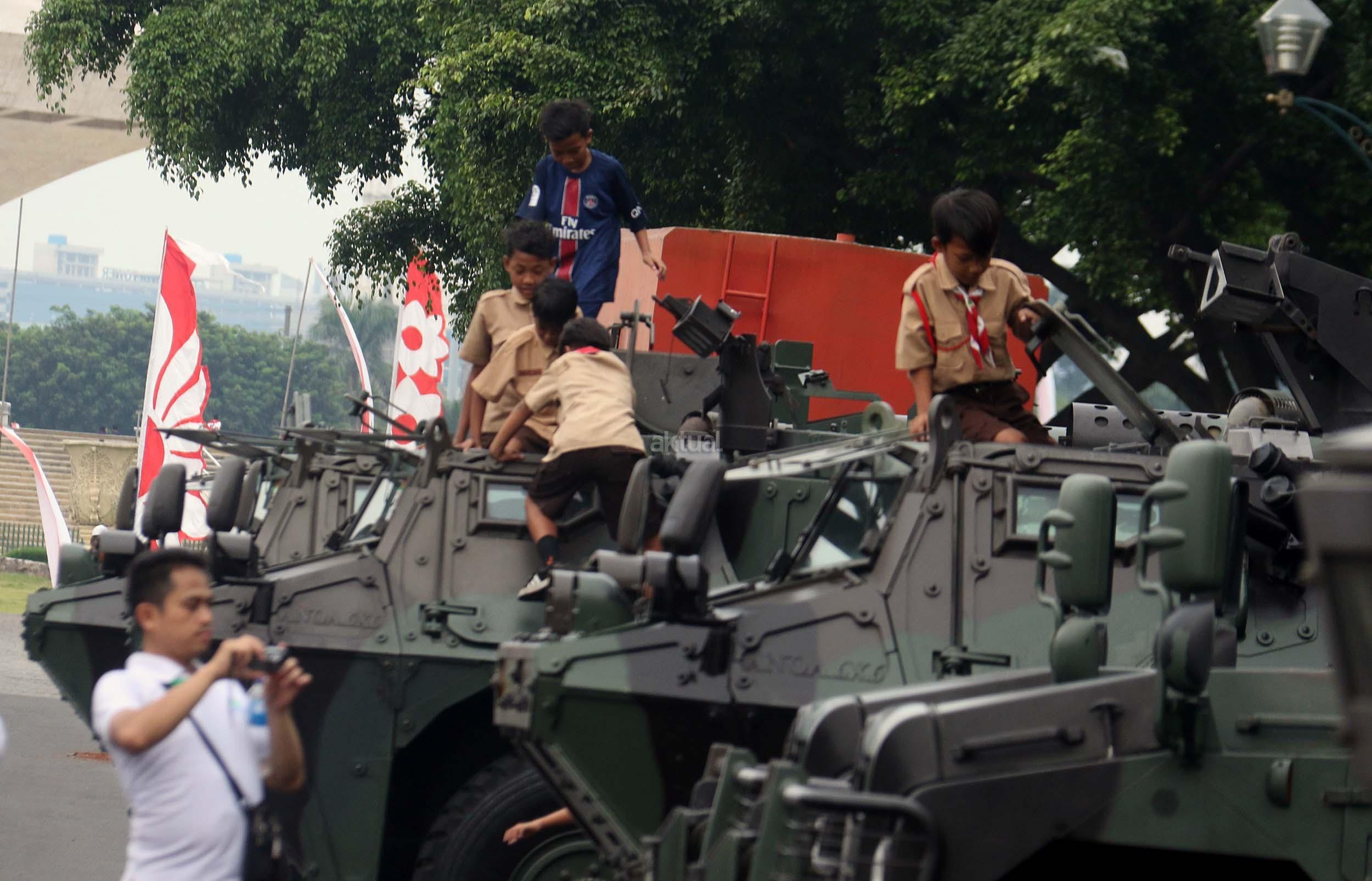 Para pelajar asyik bermain diatas kendaraan taktis milik TNI di silang Monas, Jakarta, Rabu (30/11/2016). Kendaraan taktis milik TNI disiagakan untuk pengamanan aksi 212 atau Aksi Bela Islam III yang rencananya akan menggelar sholat Jumat akbar di silang Monas pada 2 Desember 2016 nanti. AKTUAL/Munzir