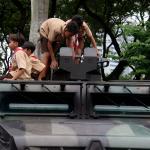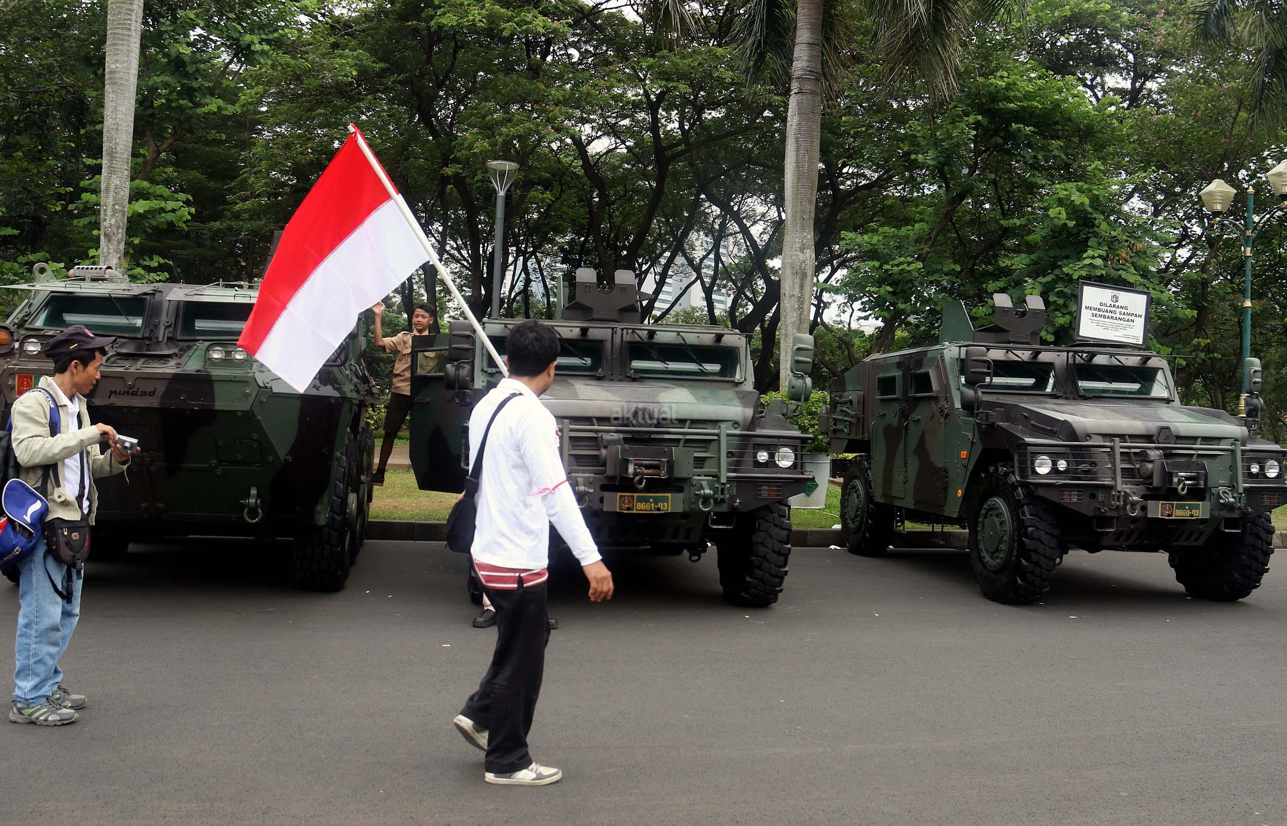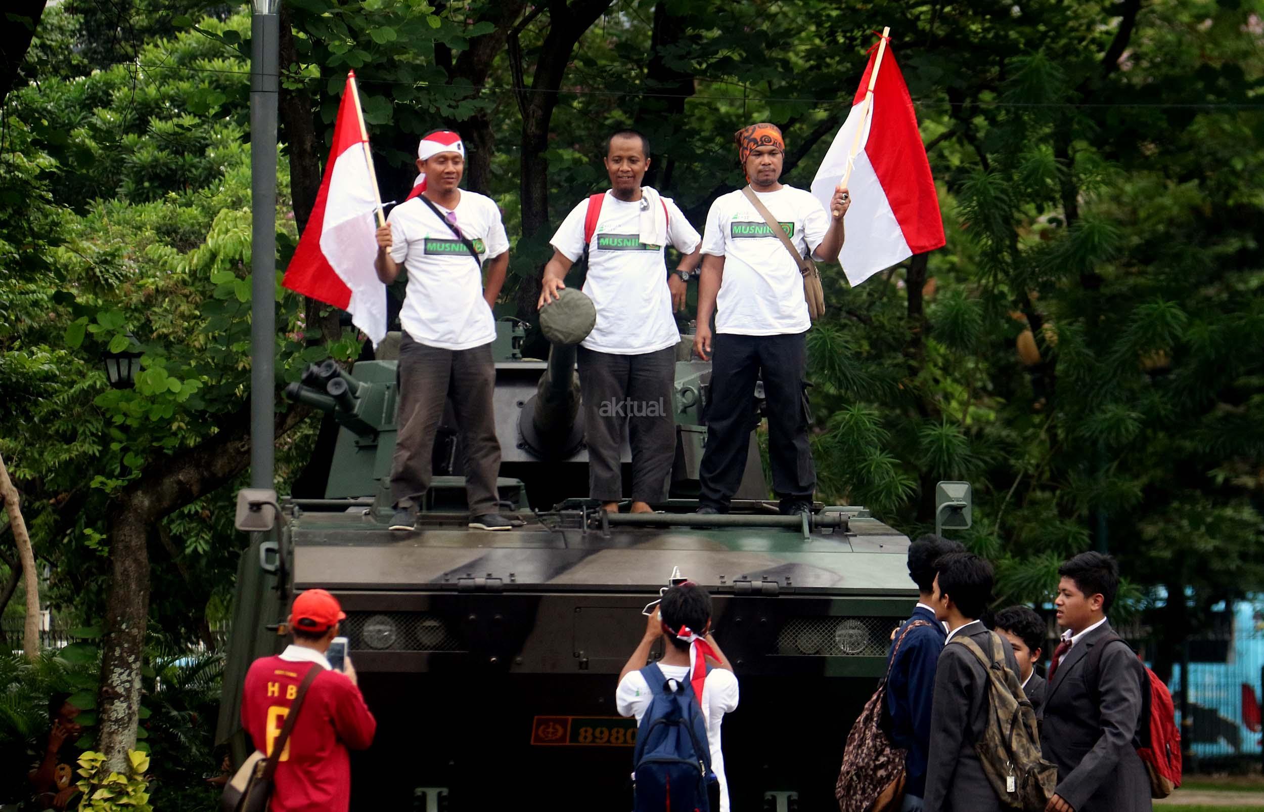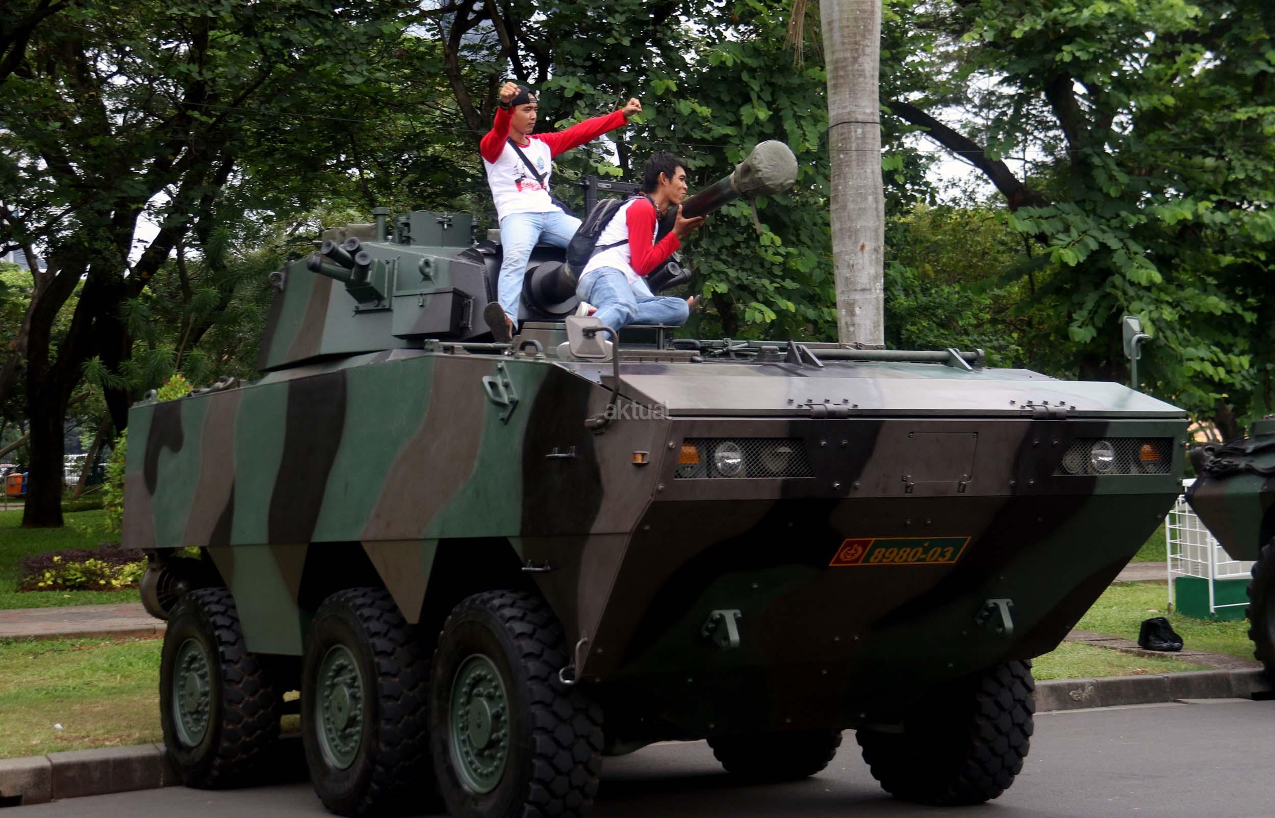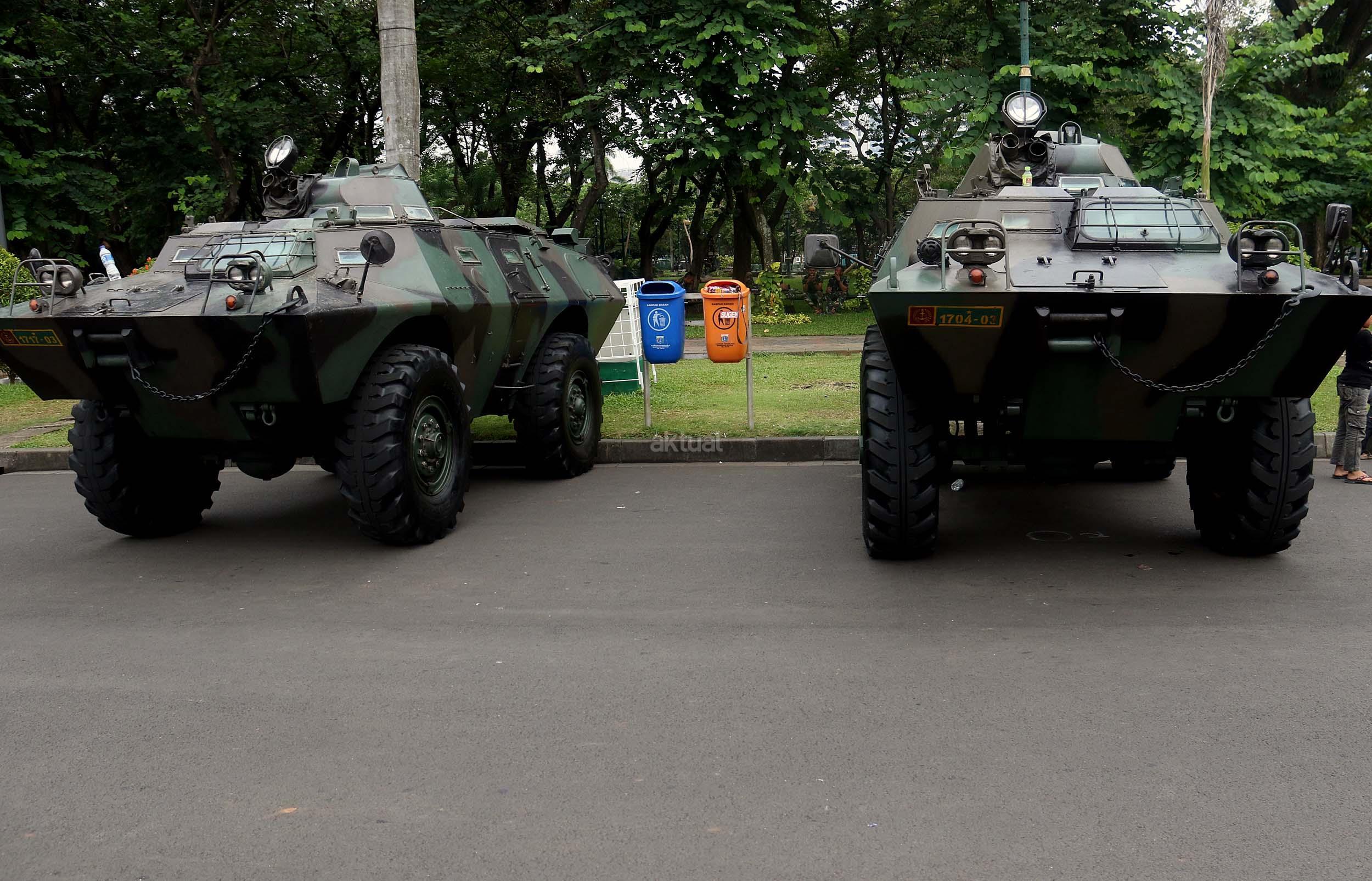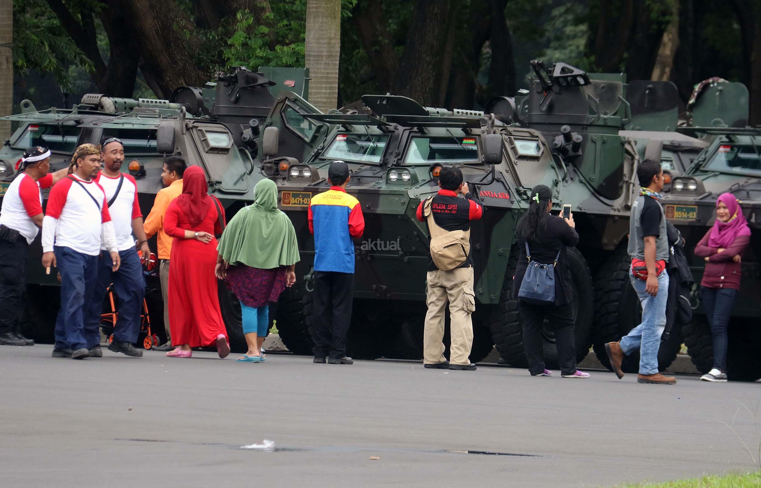 Para pelajar asyik bermain diatas kendaraan taktis milik TNI di silang Monas, Jakarta, Rabu (30/11/2016). Kendaraan taktis milik TNI disiagakan untuk pengamanan aksi 212 atau Aksi Bela Islam III yang rencananya akan menggelar sholat Jumat akbar di silang Monas pada 2 Desember 2016 nanti. AKTUAL/Munzir