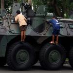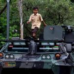 Seorang pelajar asyik bermain diatas kendaraan tempur milik TNI di silang Monas, Jakarta, Rabu (30/11/2016). Kendaraan tempur milik TNI disiagakan untuk pengamanan aksi 212 atau Aksi Bela Islam III yang rencananya akan menggelar sholat Jumat akbar di silang Monas pada 2 Desember 2016 nanti. AKTUAL/Munzir