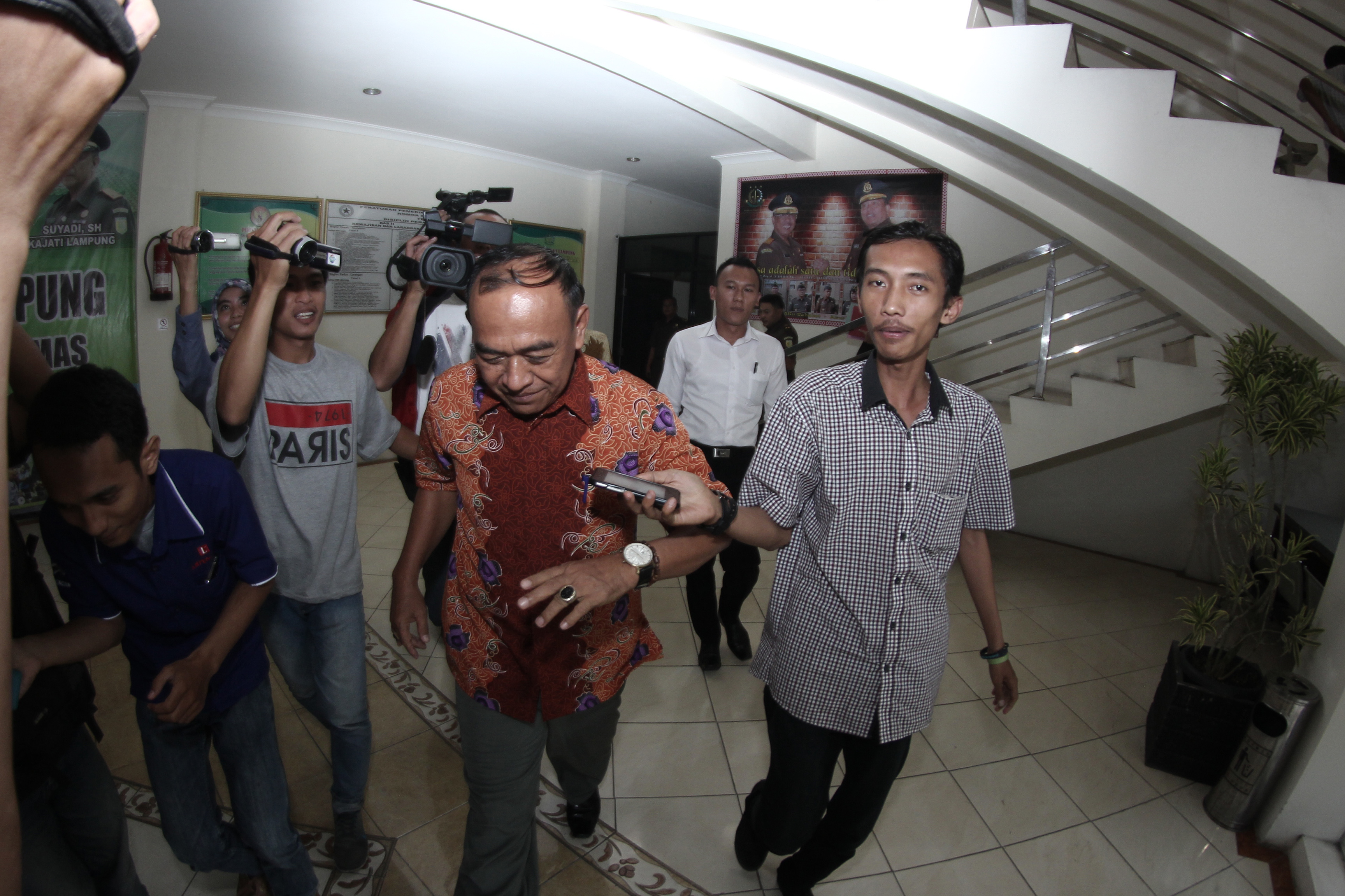 Kepala Satuan Badan Polisi Pamong Praja Cik Raden mencoba menghindari awak media untuk meminta keterangan seusai mengurus administrasi penahanan dirinya di Kantor Kejaksaan Tinggi (Kejati) Negeri Lampung, Senin (16/5). Selanjutnya Cik Raden akan ditahan oleh pihak Kejaksaan Negeri (Kejari) Bandar Lampung di Rumah Tahanan Way Hui selama 20 hari ke depan sebelum mengikuti proses persidangan terkait kasus pelecehan seksual di City Spa. ANTARA FOTO/Tommy Saputra/foc/16.