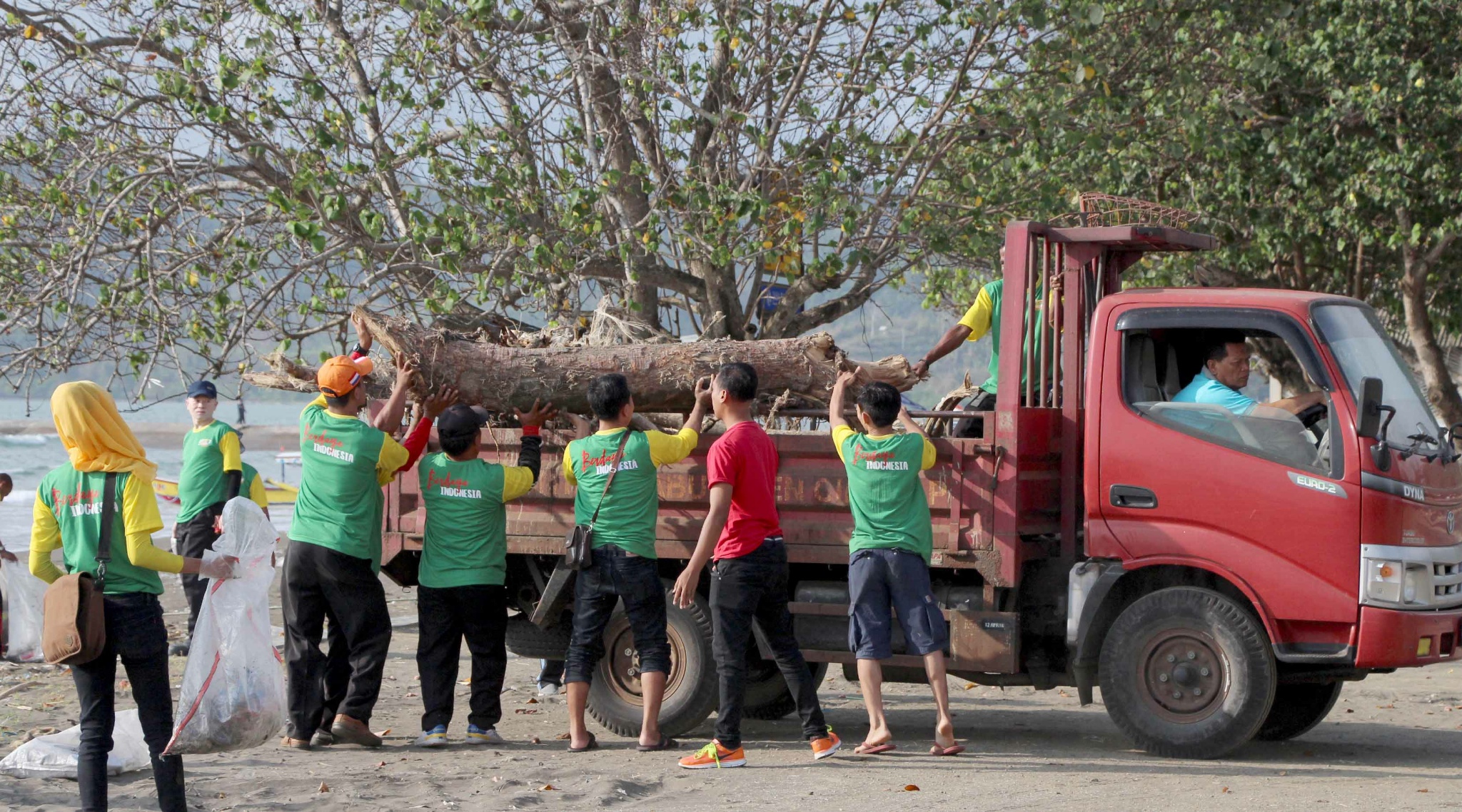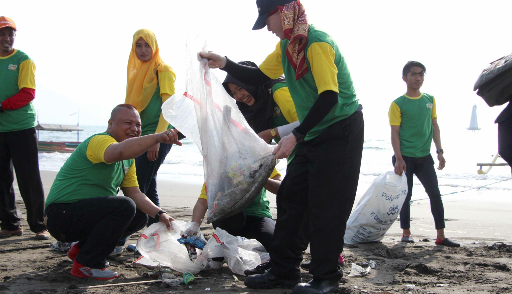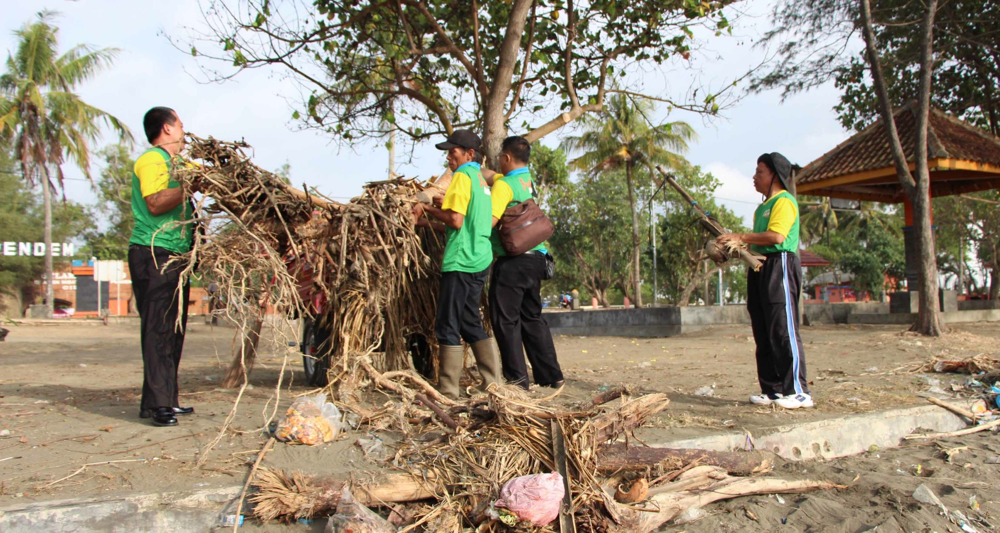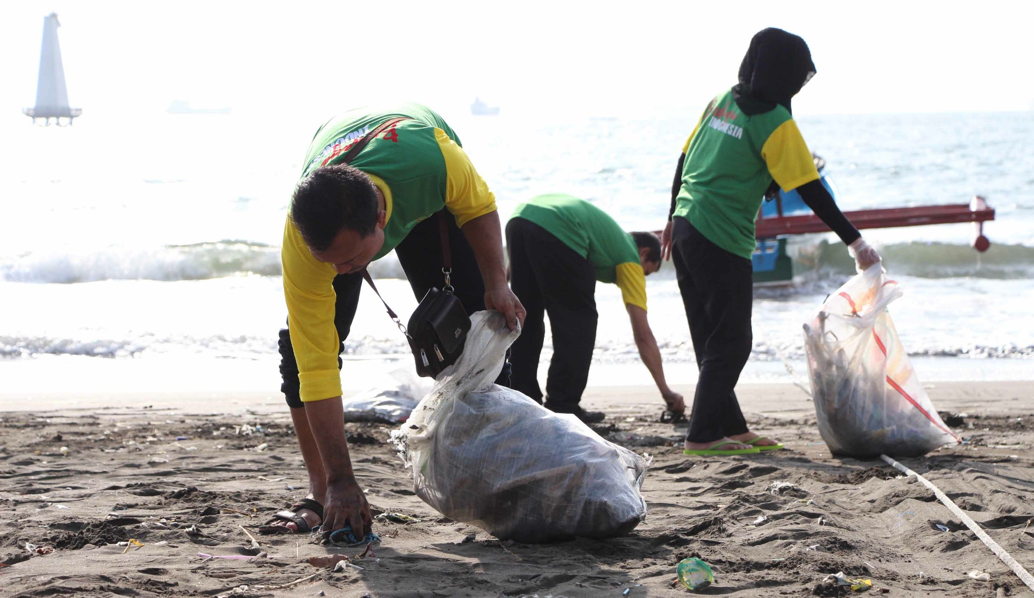 Karyawan Giant Ekspres Cilacap berkolaborasi dengan Dinas Pemuda, Olahraga dan Pariwisata, serta Polsek Cilacap membersihkan pesisir pantai Teluk Penyu, Cilacap, Jawa Tengah, Jumat (10/8). Menurut data yang dilansir dari Ocean Conservancy, tahun 2018 ini sebanyak 87% dari 3,8 juta ton sampah plastik yang dibuang setiap tahun mengambang di laut, yang berarti setiap penduduk pesisir Indonesia bertanggung jawab atas 17,2 kg sampah plastik yang mengapung dan meracuni satwa laut. AKTUAL/Pool