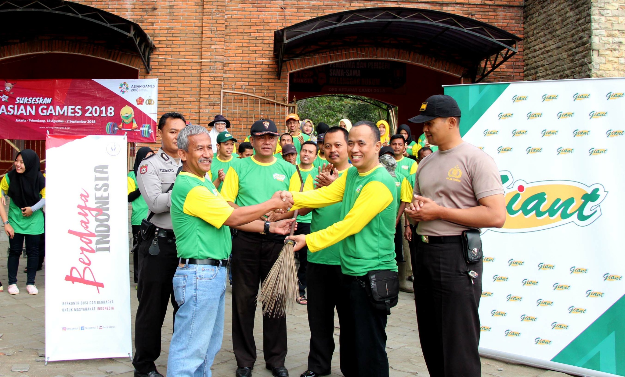 Store Manager Giant Ekspres Cilacap Achmad Suprihantoro memberikan sapu lidi secara simbolis sebelum melakukan membersihkan pesisir pantai Teluk Penyu, Cilacap, Jawa Tengah, Jumat (10/8). Menurut data yang dilansir dari Ocean Conservancy, tahun 2018 ini sebanyak 87% dari 3,8 juta ton sampah plastik yang dibuang setiap tahun mengambang di laut, yang berarti setiap penduduk pesisir Indonesia bertanggung jawab atas 17,2 kg sampah plastik yang mengapung dan meracuni satwa laut. AKTUAL/Pool