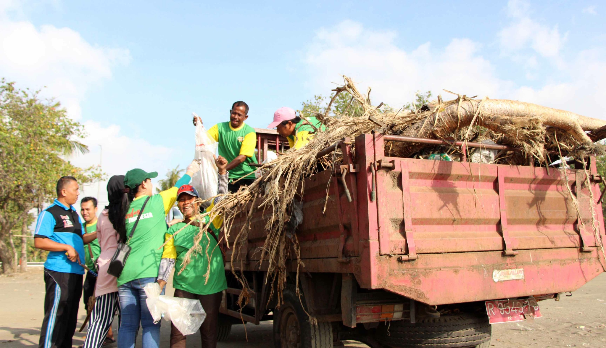 Karyawan Giant Ekspres Cilacap berkolaborasi dengan Dinas Pemuda, Olahraga dan Pariwisata, serta Polsek Cilacap membersihkan pesisir pantai Teluk Penyu, Cilacap, Jawa Tengah, Jumat (10/8). Lebih dari 100 relawan bahu membahu membersihkan pesisir pantai Teluk Penyu, dimana kegiatan ini merupakan aksi sosial peduli lingkungan yang diinisiasi oleh Giant Ekspres Cilacap sebagai salah satu bentuk dukungan Giant terhadap penanganan sampah plastik khususnya yang ada di laut. AKTUAL/Pool