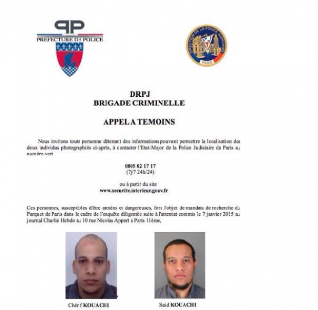 Jakarta, Aktual.co — Pihak kepolisian Prancis merilis foto dua tersangka penembakan kantor majalah Satir Charlie Hebdo di Paris yang menewaskan 12 orang tersebut. Surat perintah penangkapan tersebut diperuntukkan kepada Cherif Kauachi (32) dan saudaranya Said (34). Dalam surat penangkapan yang dikeluarkan (8/1), demikian dikutip Aktual.co dari BBC keduanya disebut “bersenjata” dan “berbahaya”.