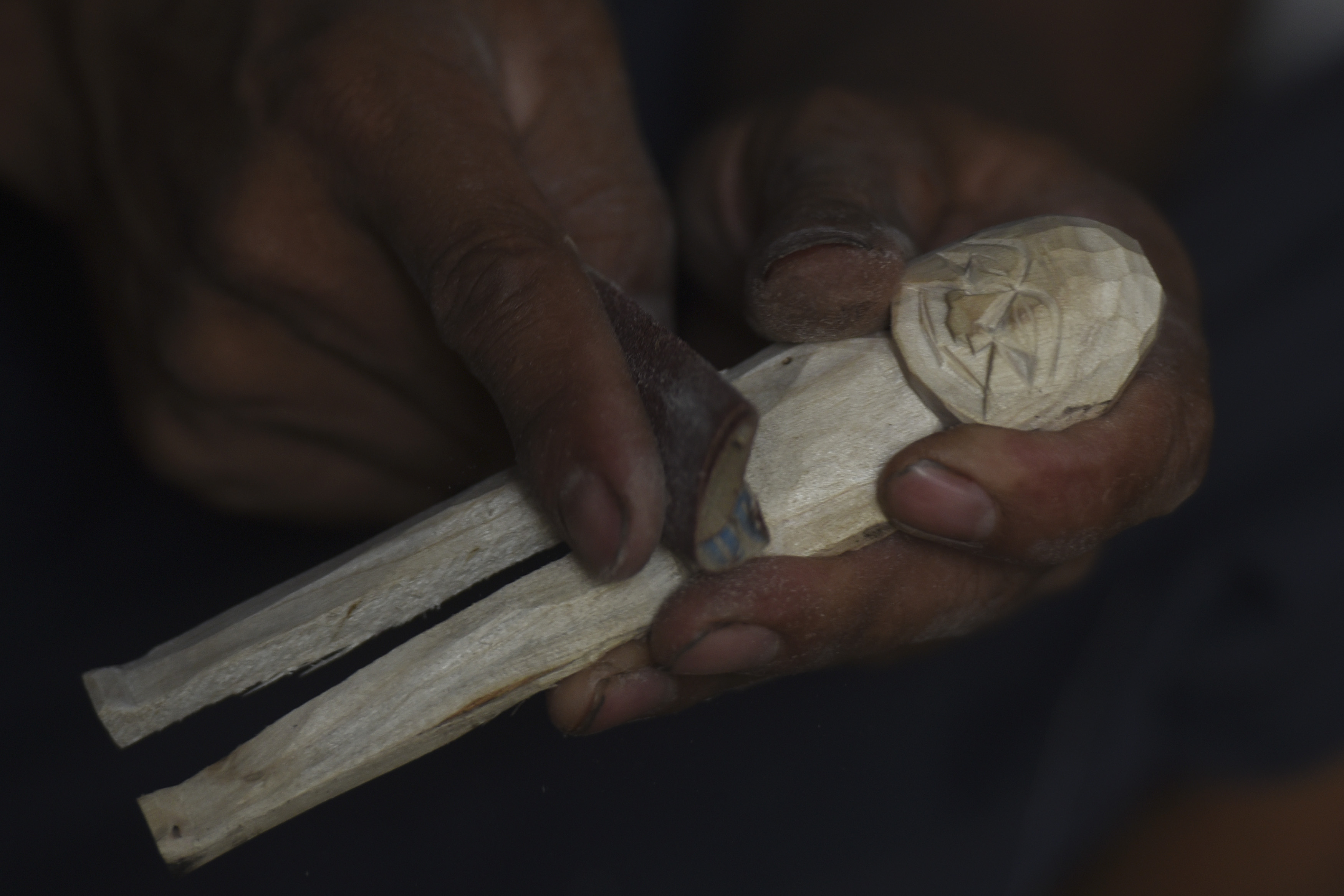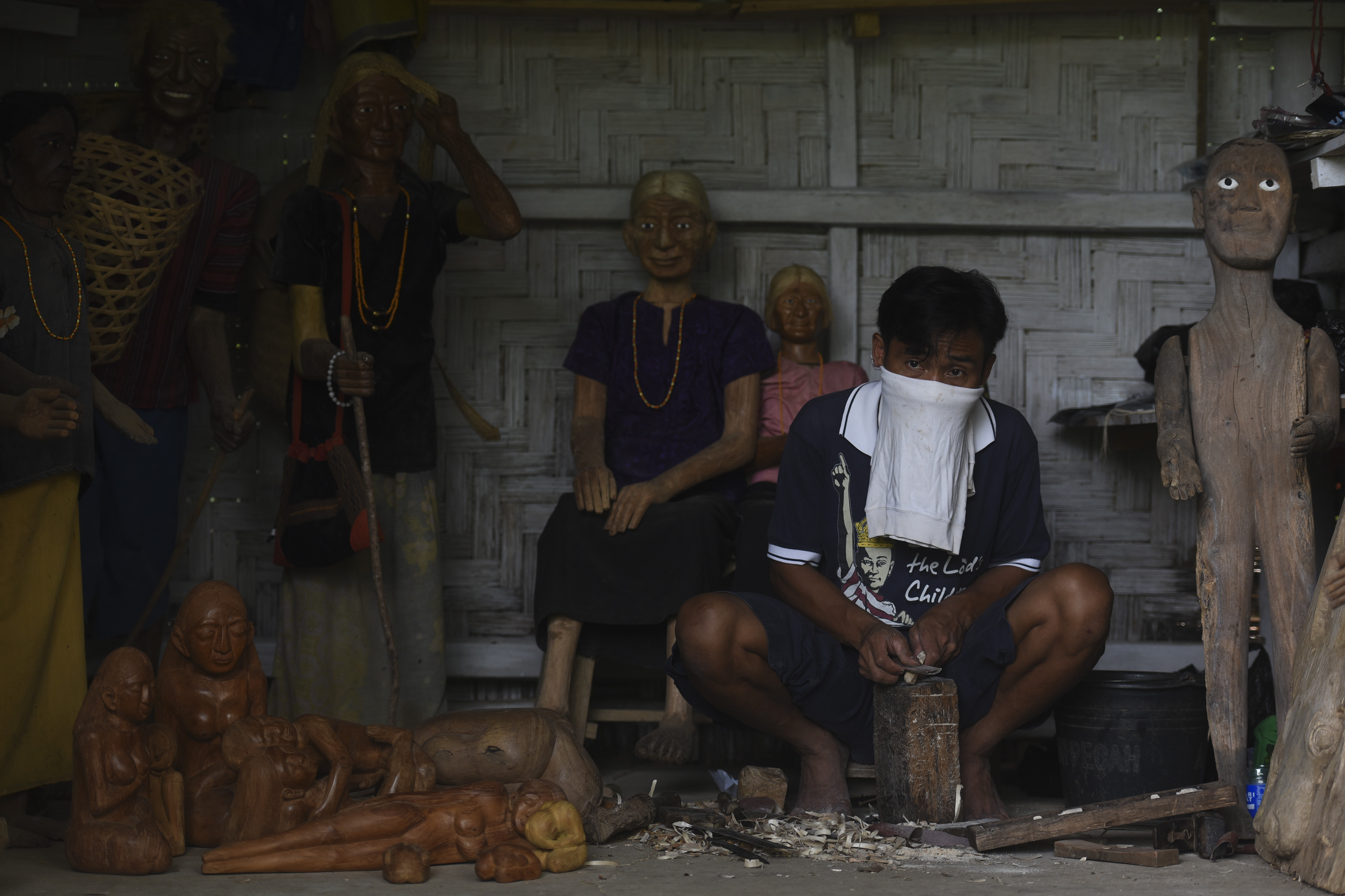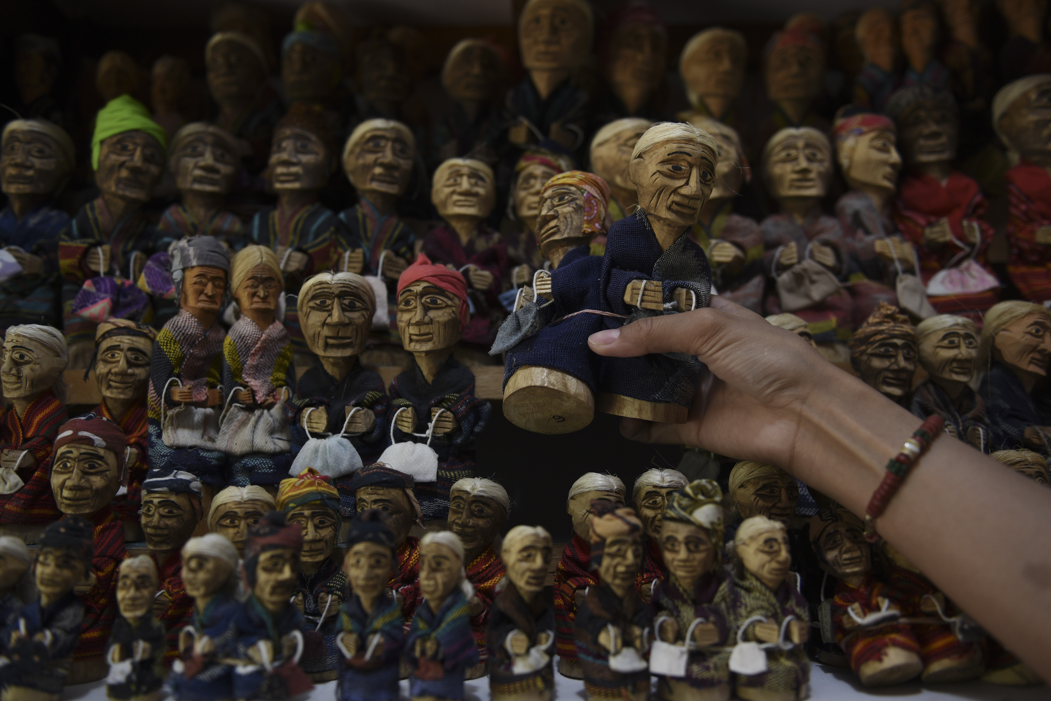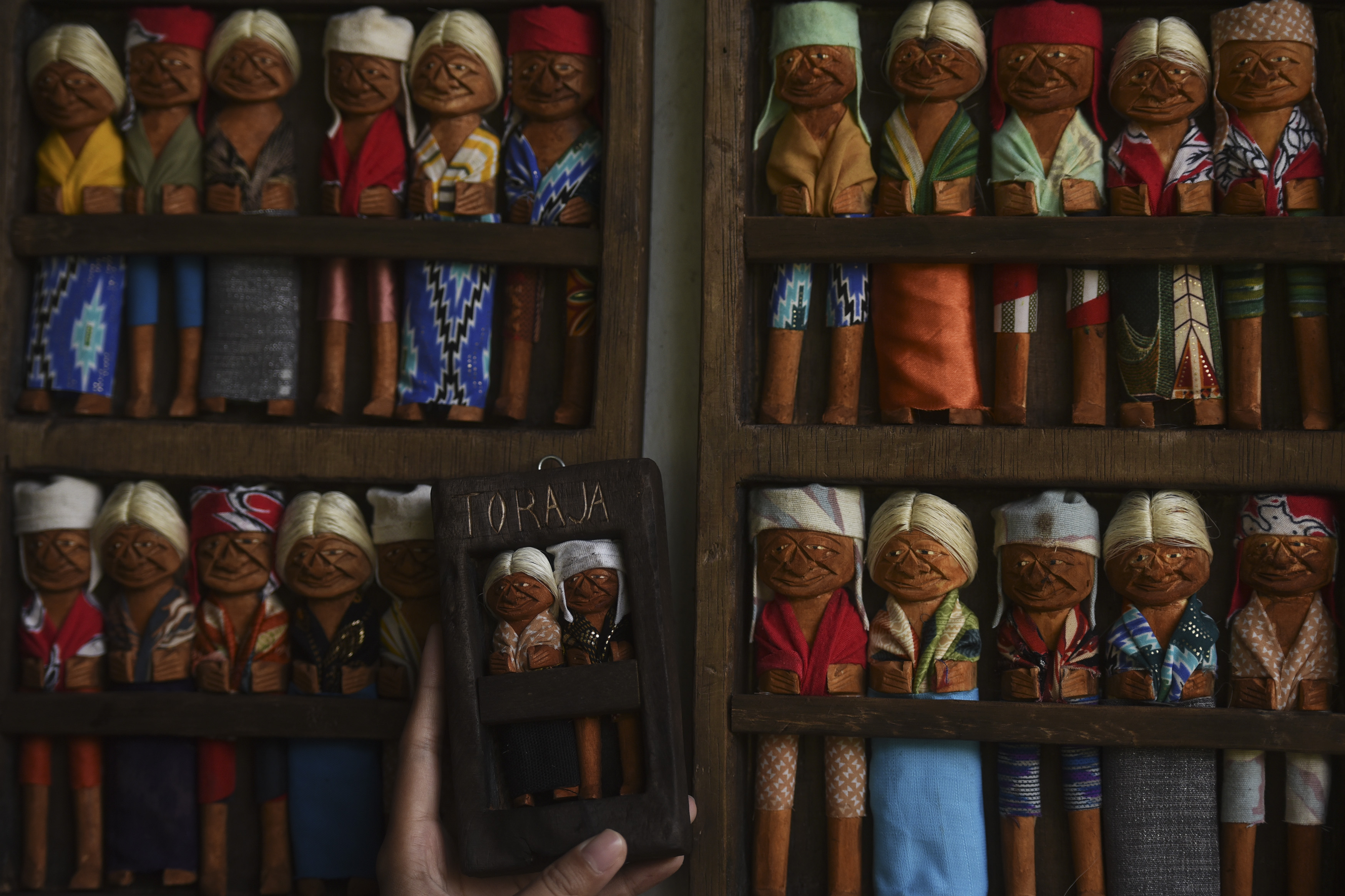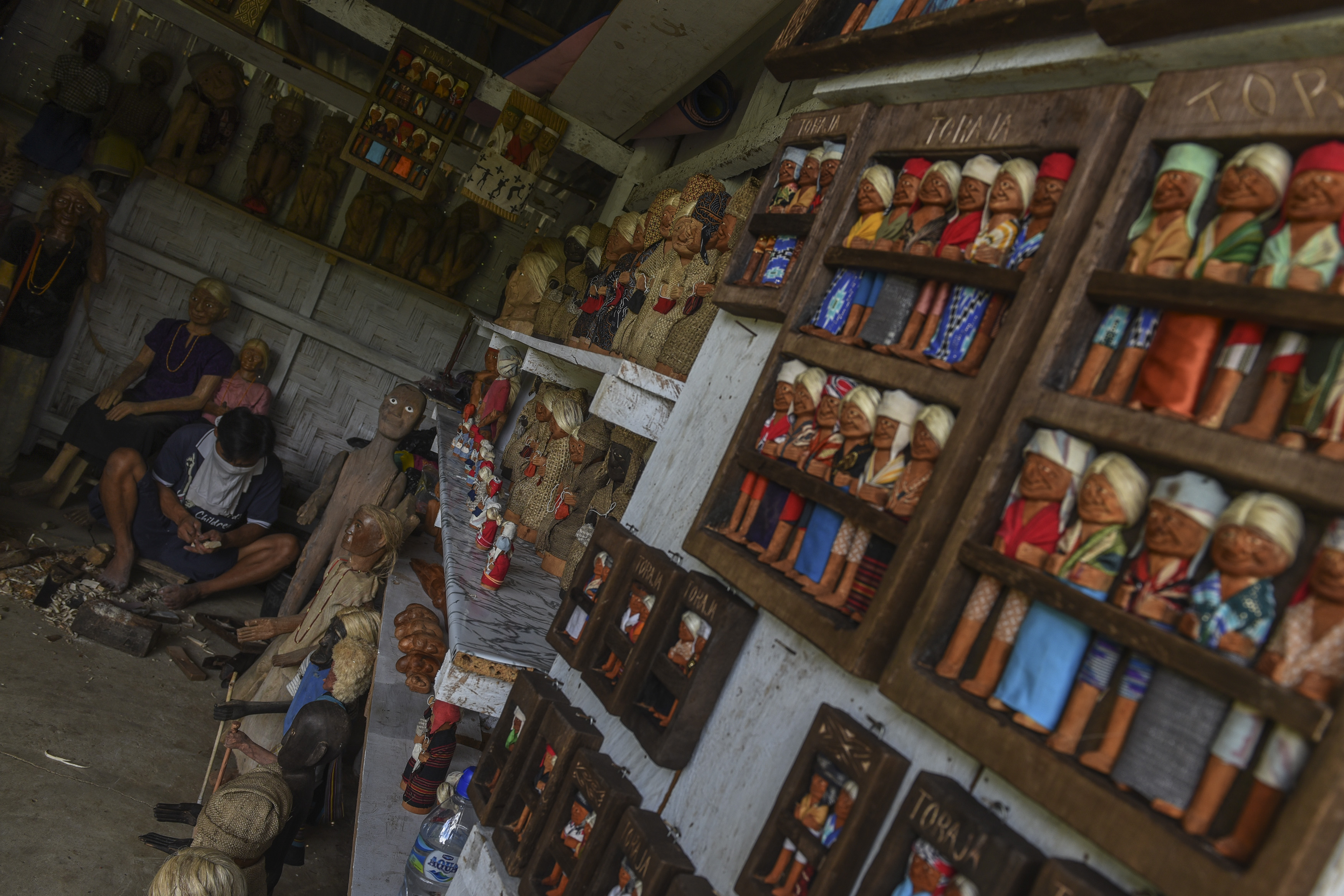 Pengunjung mengamati cenderamata tau-tau (orang-orangan) yang terbuat dari kayu di Lemo, Tana Toraja, Sulawesi Selatan, Sabtu (9/7). Kerajinan khas Toraja tersebut dijual Rp60 ribu-Rp1 juta per pasang tergantung ukuran patung. ANTARA FOTO/Zabur Karuru/aww/16.