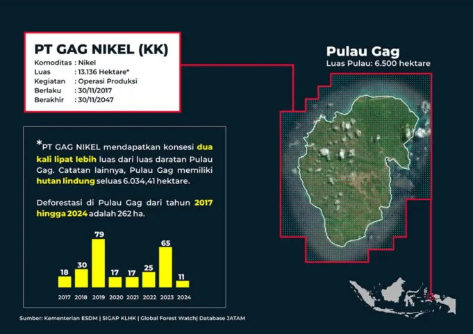 Dalam siaran pers resminya, Jatam mengungkap bahwa PT Gag Nikel mendapatkan izin usaha pertambangan (IUP) seluas 13.136 hektare, padahal luas Pulau Gag sendiri hanya 6.500 hektare, dengan 6.034,42 hektare di antaranya berstatus hutan lindung. Hal ini berarti bahwa izin yang diberikan melampaui luas daratan pulau, bahkan mencakup wilayah perairan di sekitarnya.