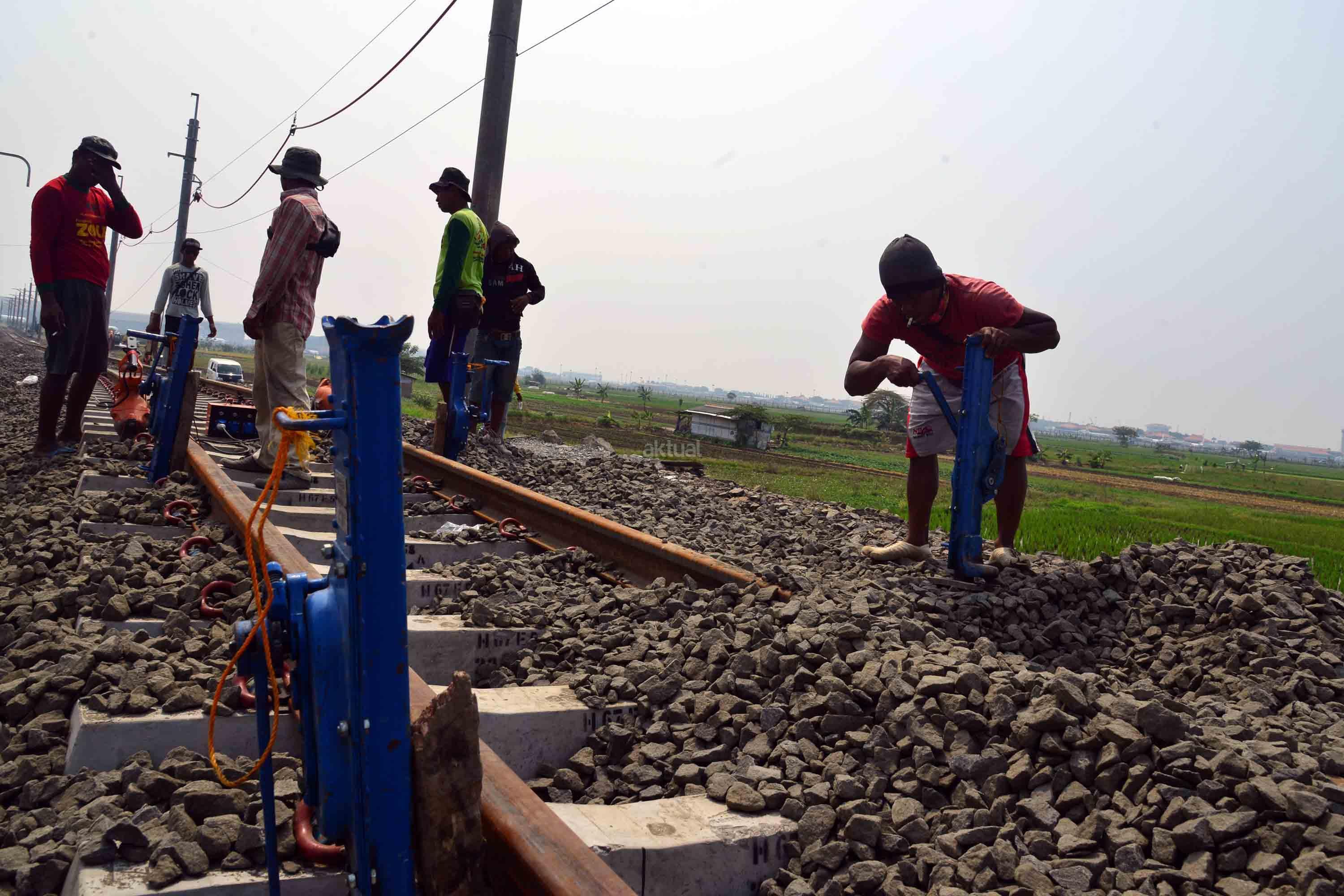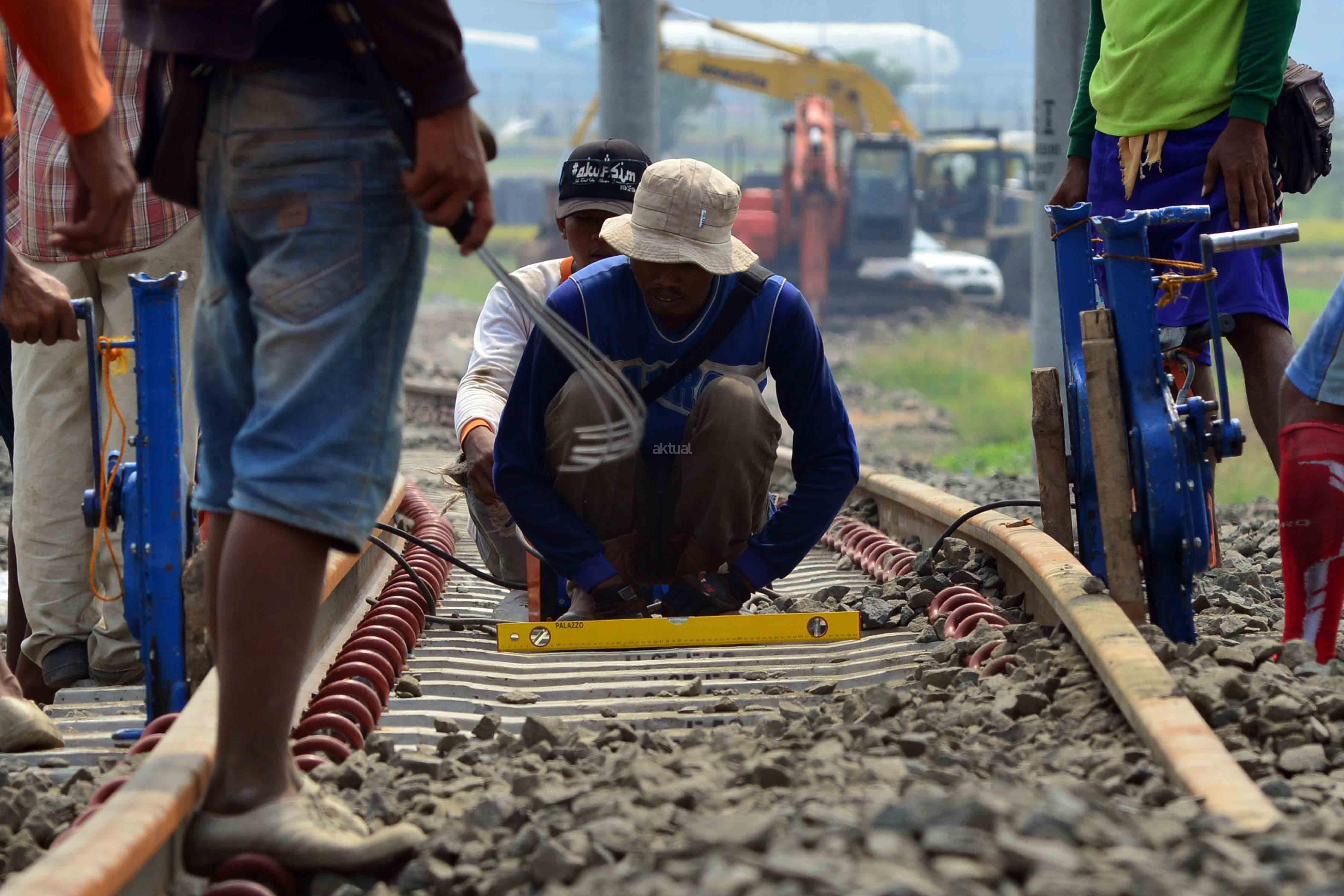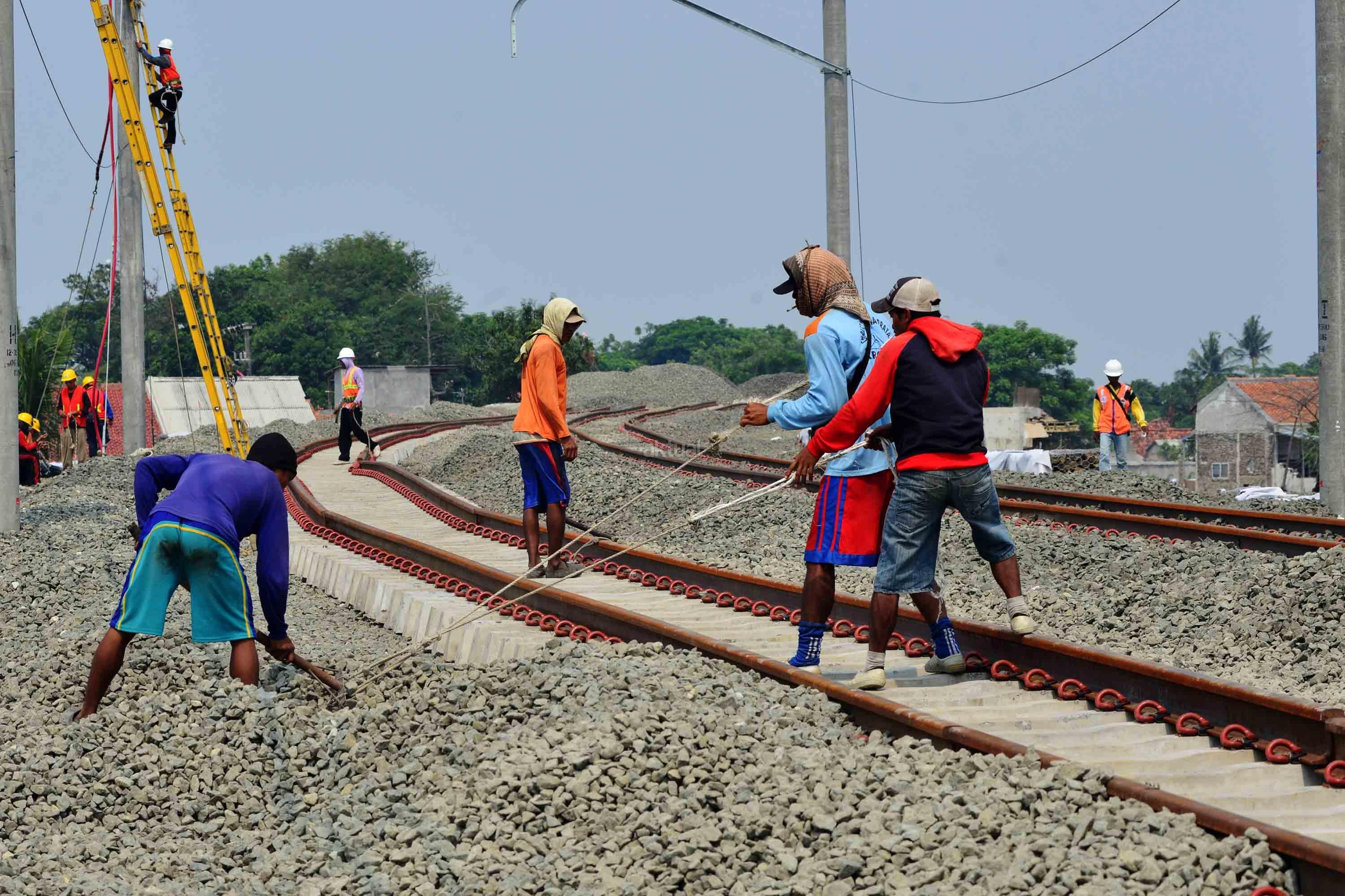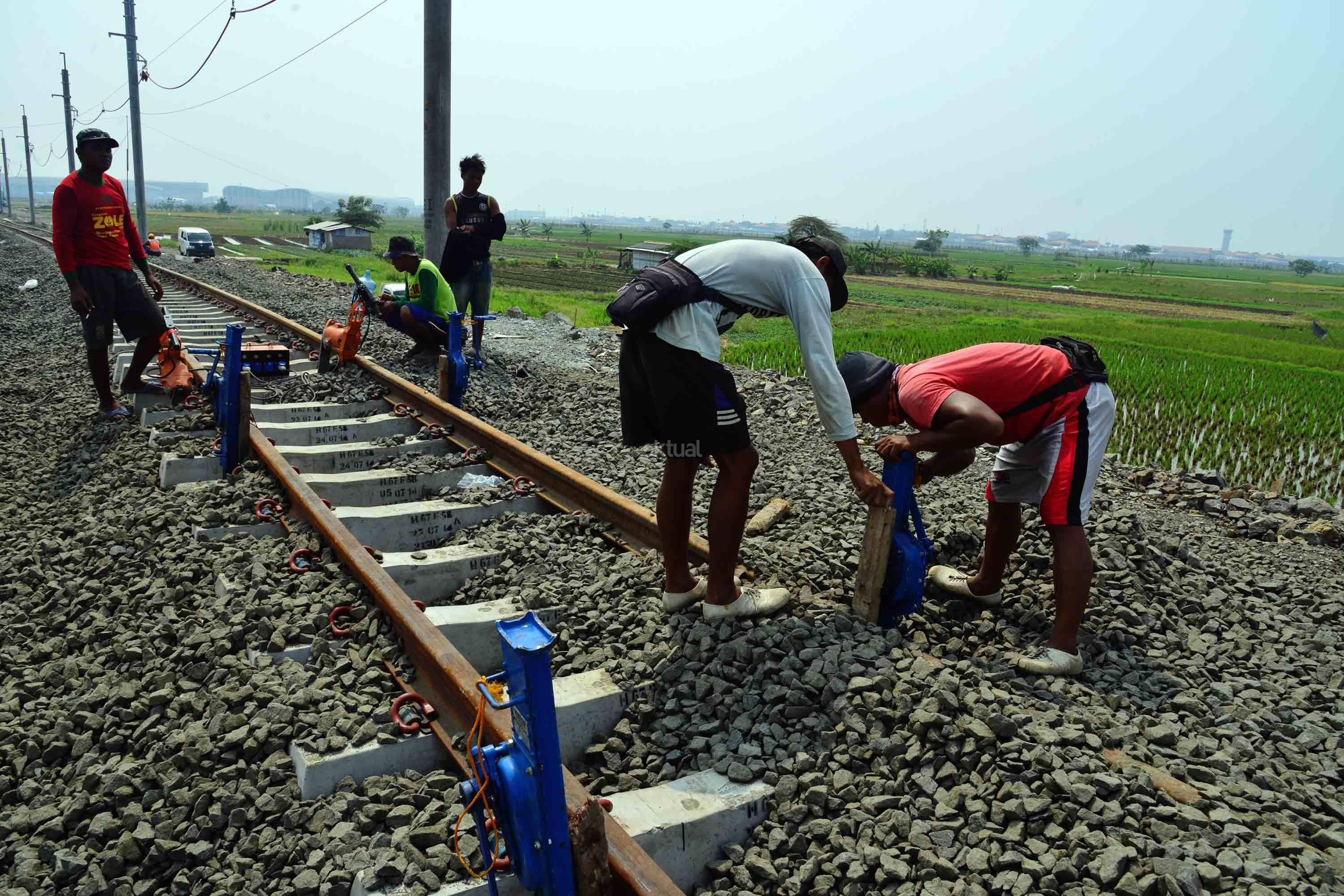 Pekerja sedang menyelesaikan proyek pembengunan kereta api Bandara di kawasan Pondok Benda, Tangerang, Sabtu (12/8). PT KAI Daerah Operasional 1 Jakarta Suprapto mengatakan, rute yang akan digunakan kereta api Bandara Soekarno-Hatta adalah Stasiusn Manggarai – Sudirman Baru- Duri – Batu Ceper – Bandara Soekarno-Hatta. AKTUAL/Tino Oktaviano