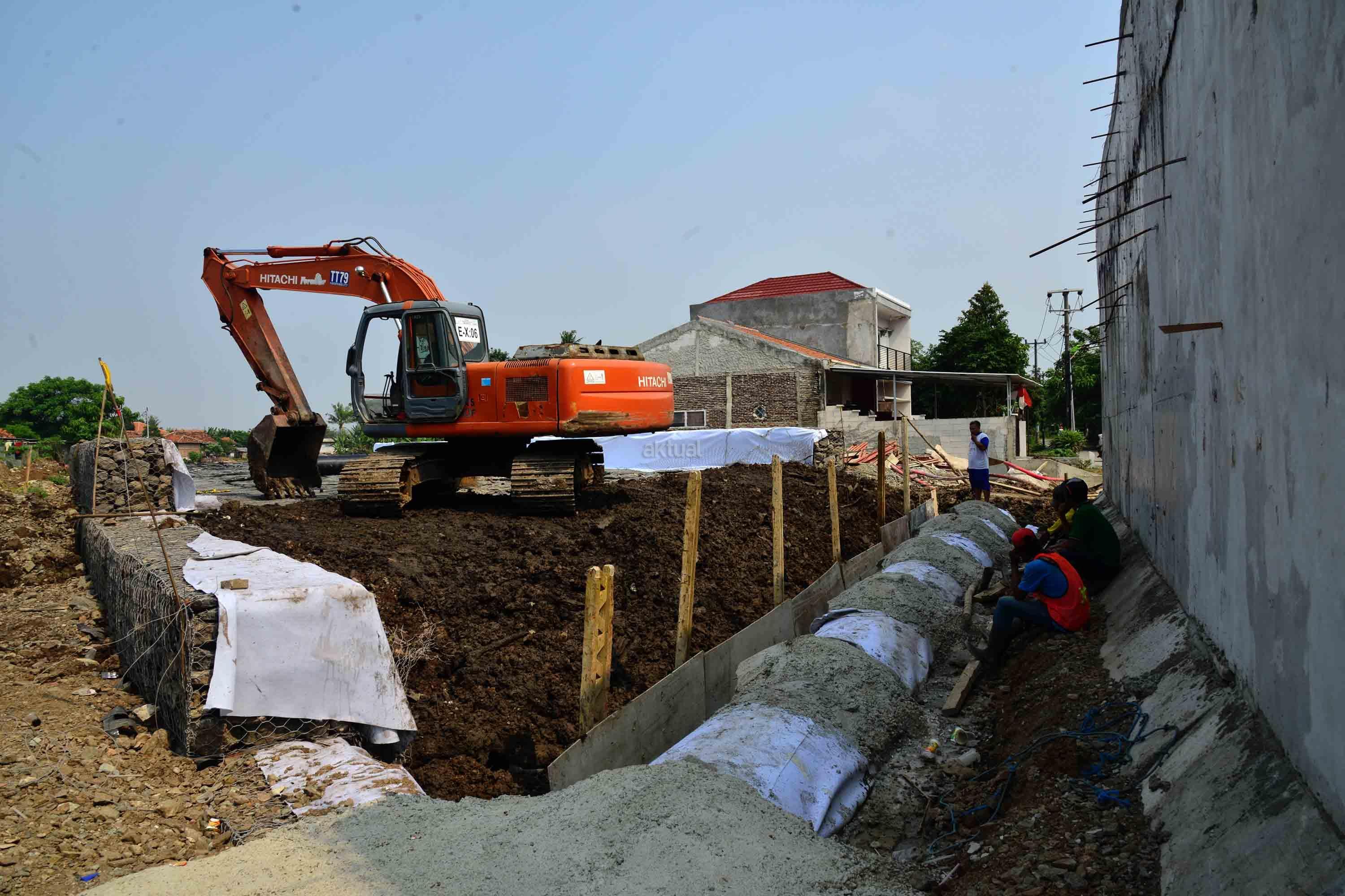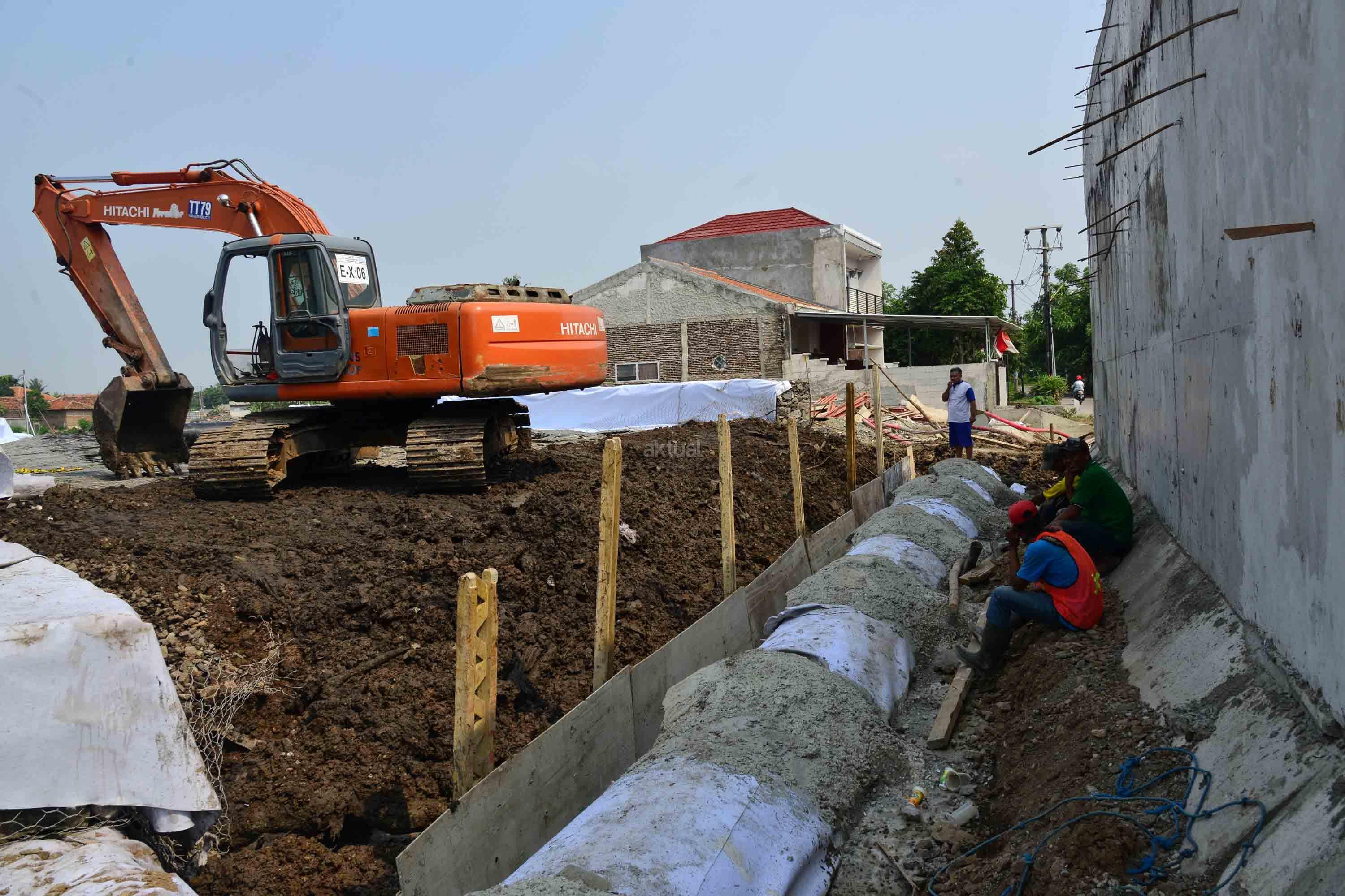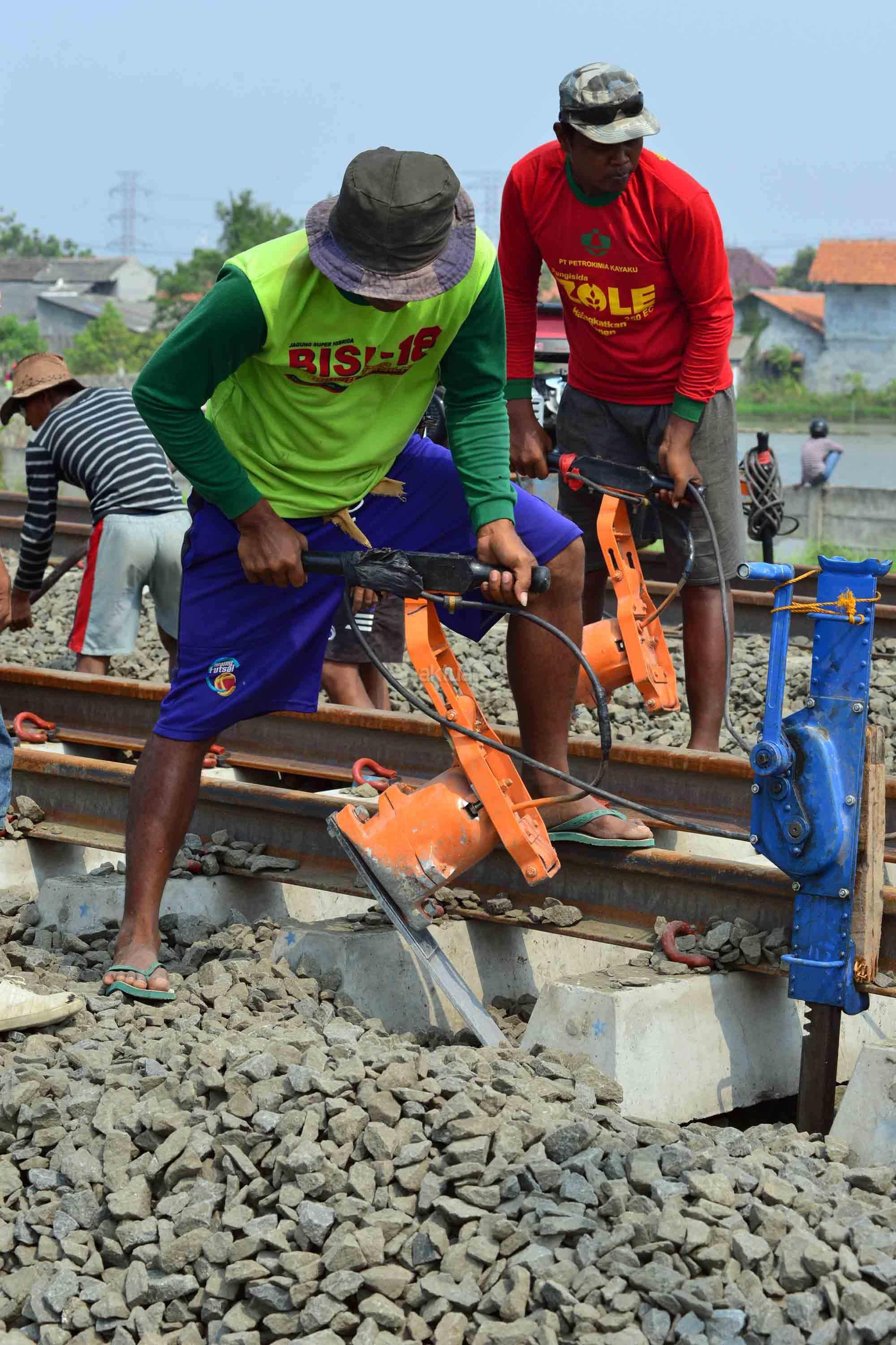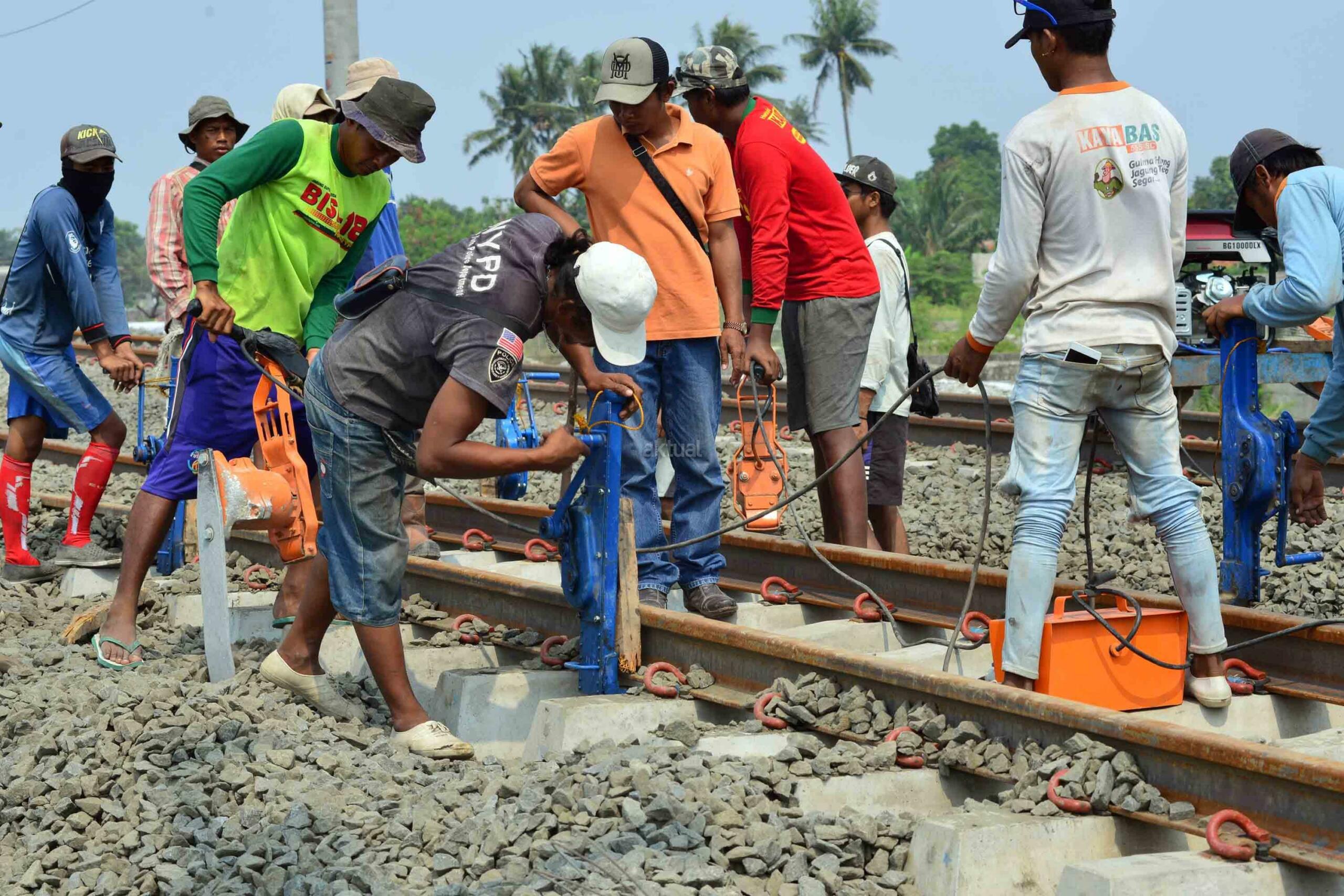 Pekerja sedang menyelesaikan proyek pembengunan kereta api Bandara di kawasan Pondok Benda, Tangerang, Sabtu (12/8). PT KAI Daerah Operasional 1 Jakarta Suprapto mengatakan, rute yang akan digunakan kereta api Bandara Soekarno-Hatta adalah Stasiusn Manggarai – Sudirman Baru- Duri – Batu Ceper – Bandara Soekarno-Hatta. AKTUAL/Tino Oktaviano