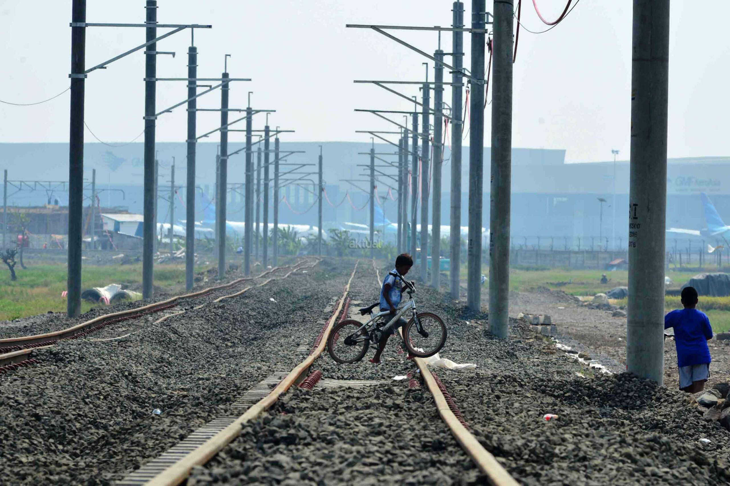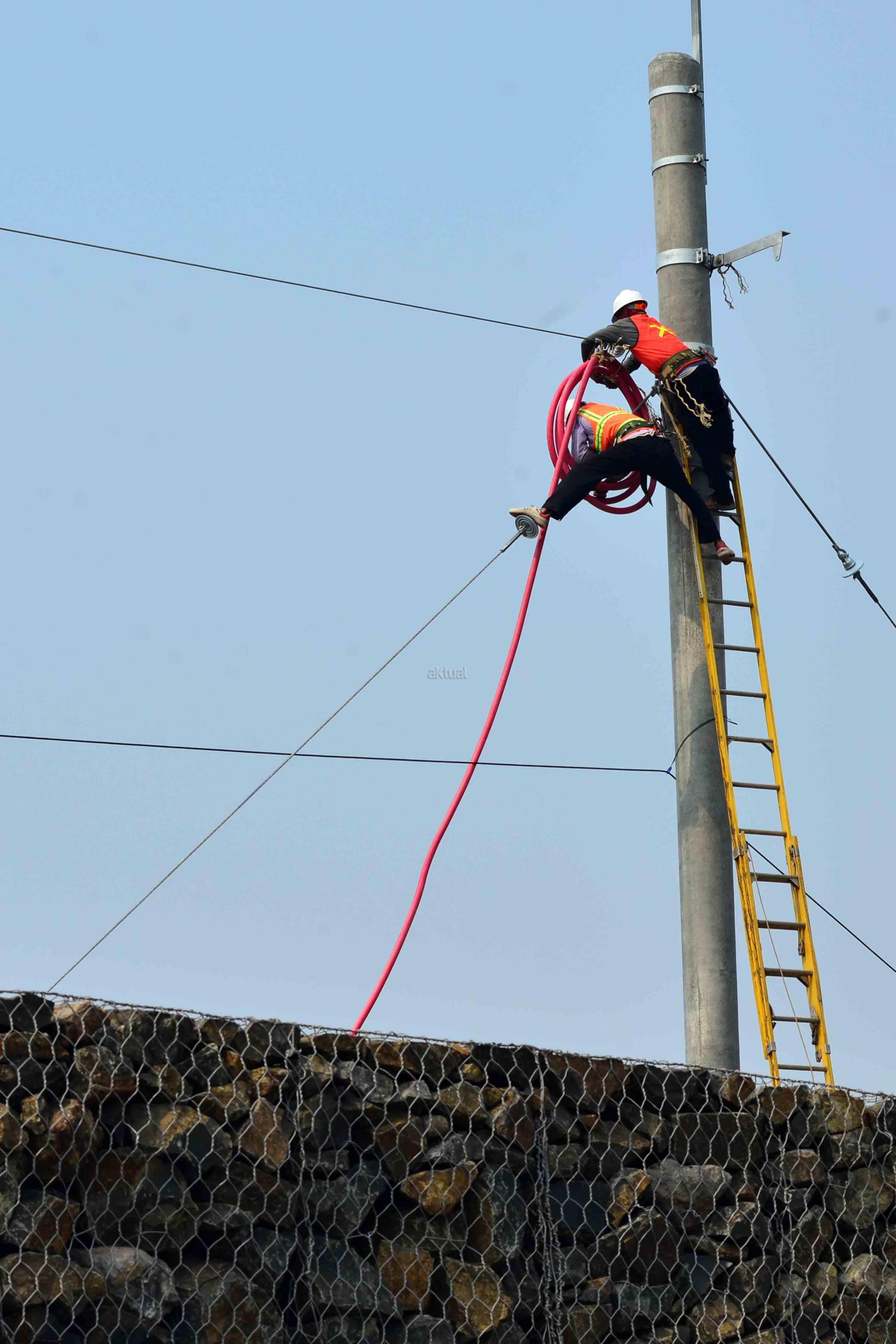 Pekerja sedang kabel aliran listrik proyek pembengunan kereta api Bandara di kawasan Pondok Benda, Tangerang, Sabtu (12/8). Target operasional kereta bandara akan disamakan dengan operasional kereta tanpa awak. Dengan demikian, calon penumpang dari luar bandara kelak bisa memanfaatkan layanan kereta bandara dan menggunakan kereta tanpa awak untuk ke terminal tujuannya. AKTUAL/Tino Oktaviano