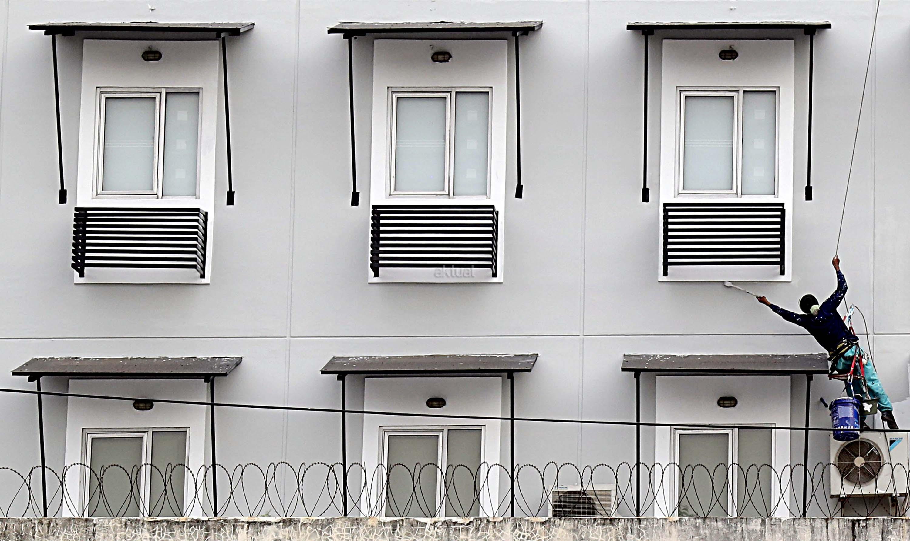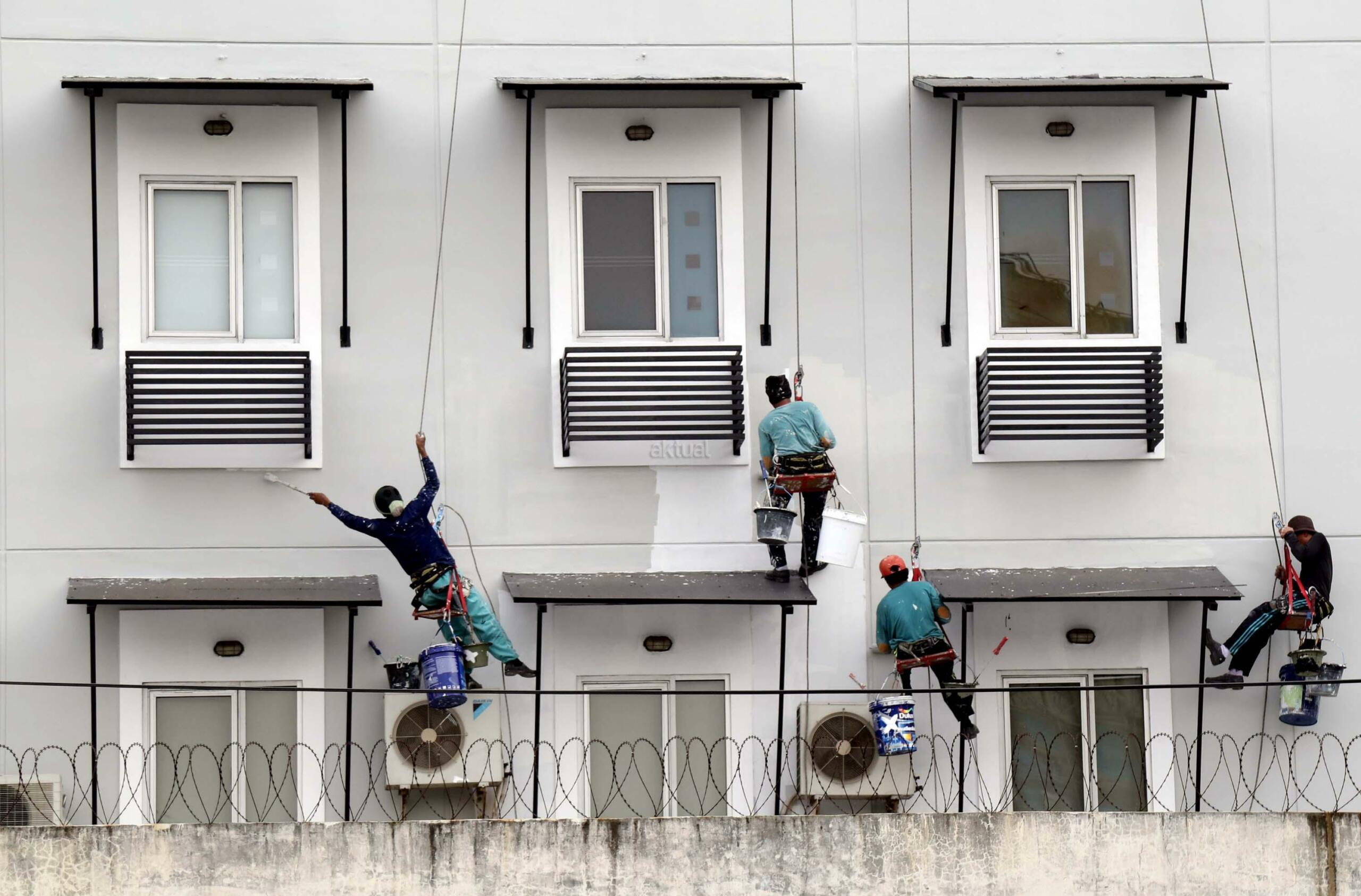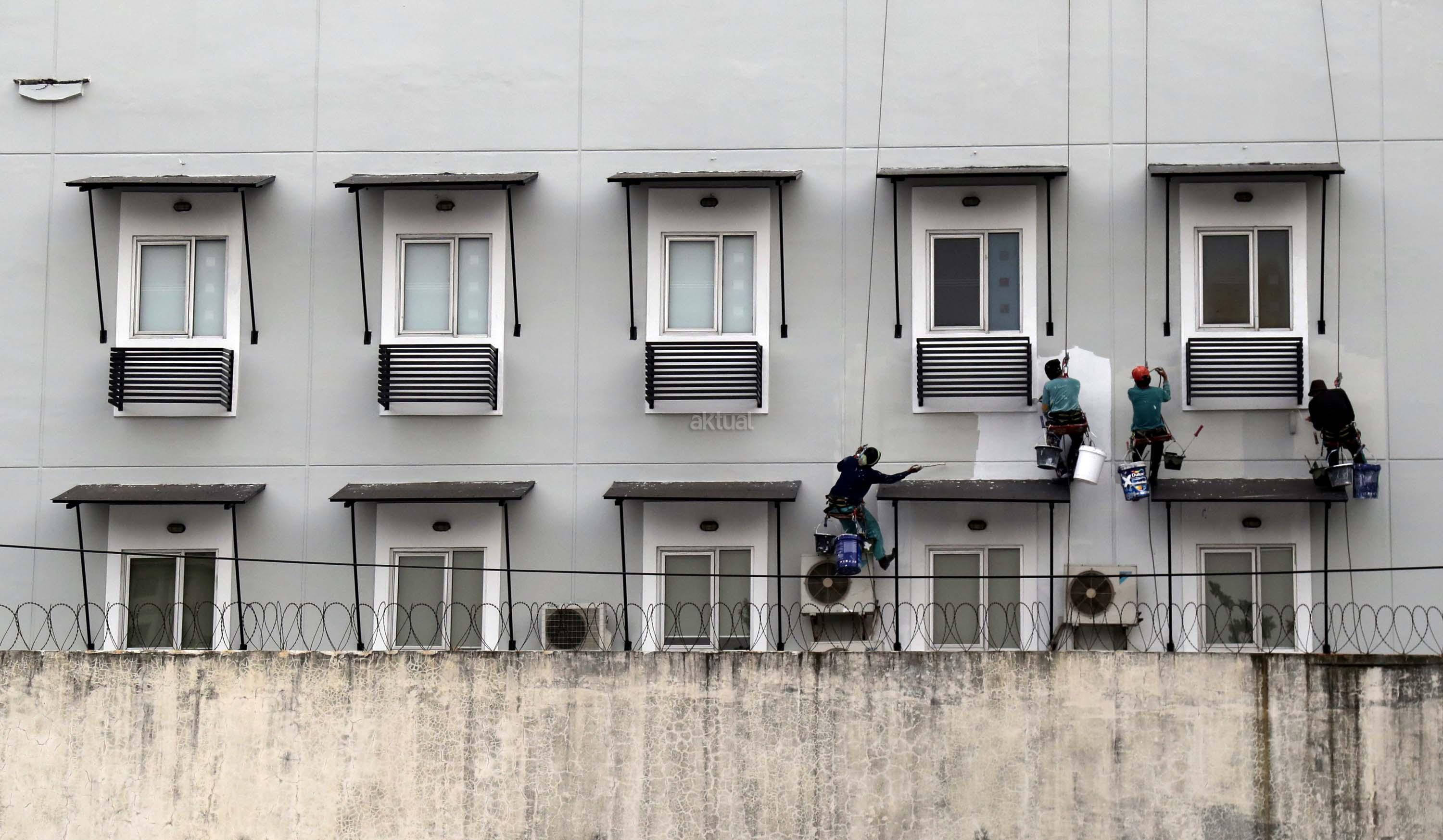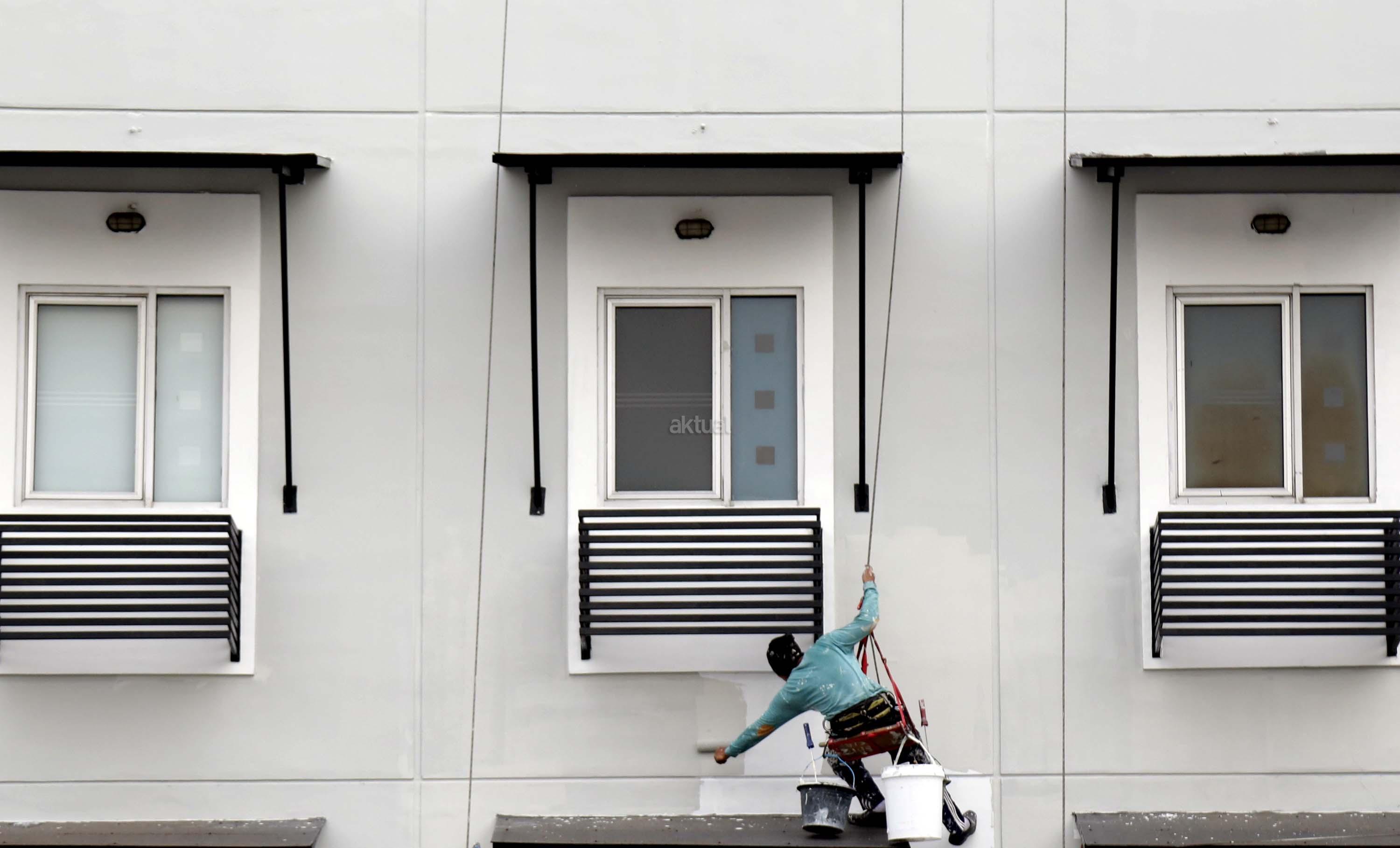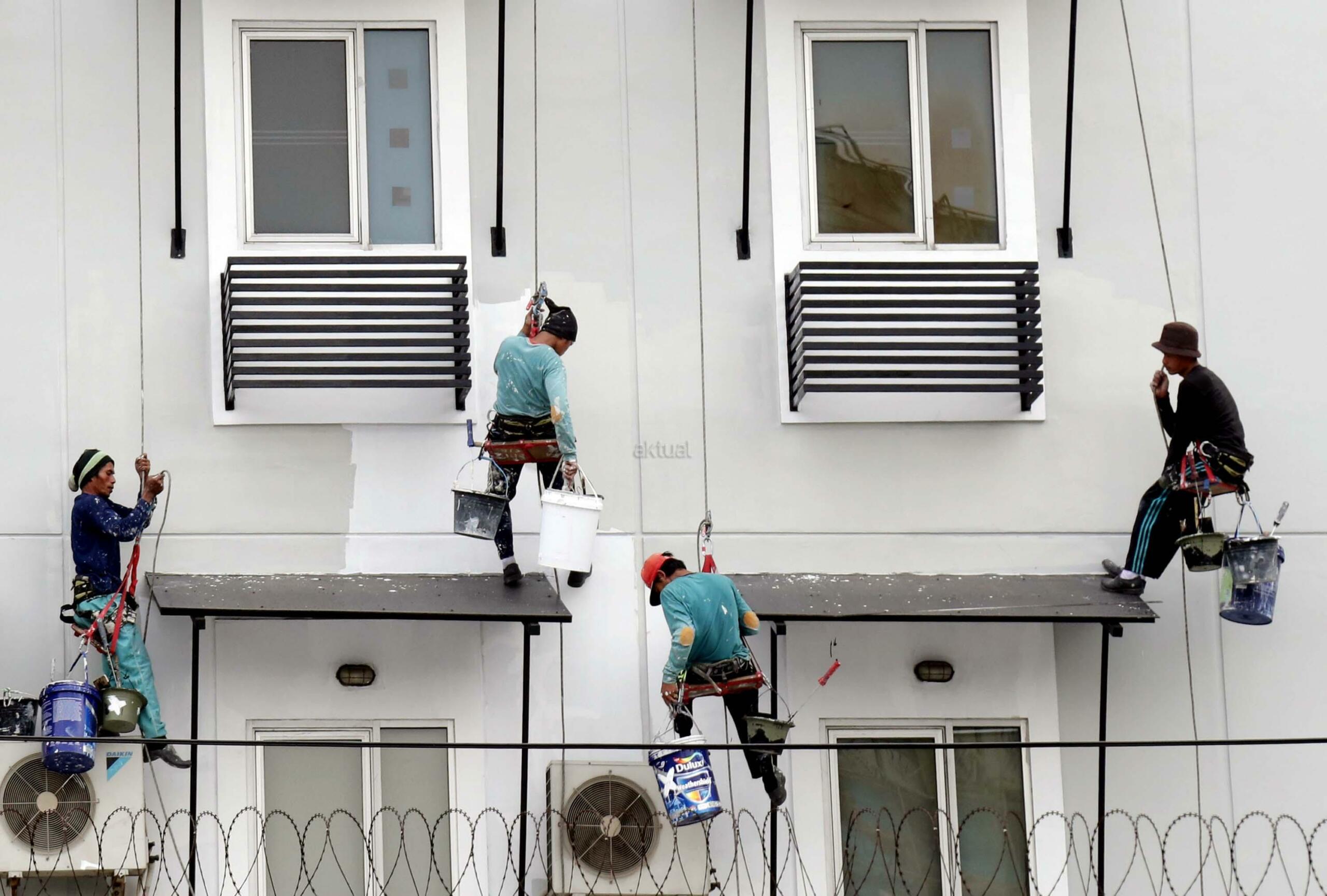 Seorang pekerja melakukan pengecatan hunian sewa di kawasan Jalan HR Rasuna Said, Jakarta, Gotong royong adalah akar dari kebudayaan Indonesia yang merupakan wujud harmoni kebersamaan. Gotong royong juga sudah menjadi perekat sosial paling efektif tanpa memandang ras, suku dan agama untuk mencapai tujuan yang luhur. AKTUAL/Tino Oktaviano