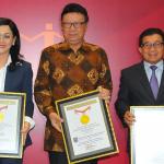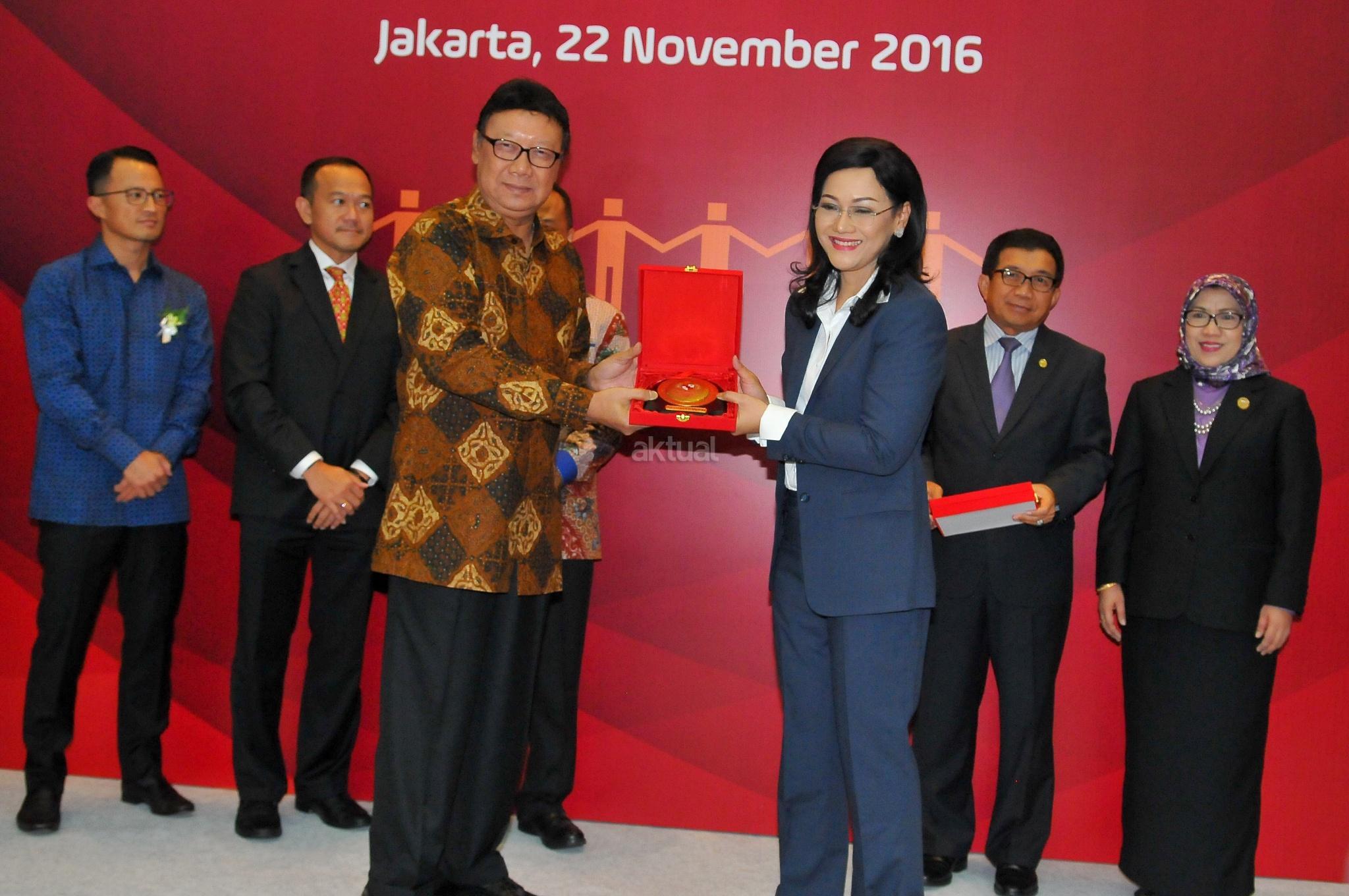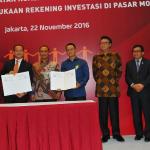 Menteri Dalam Negeri Tjahjo Kumolo, Kepala Otoritas Jasa Keuangan (OJK) Muliaman Hadad, Direktur Utama Kustodian Sentral Efek Indonesia (KSEI) Friderica Widyasari Dewi dan Kepala Eksekutif Pengawas Pasar modal OJK Nurhaida dalam acara ‘Pemanfaatan Data E-KTP untuk Percepatan Pembukaan Rekening Investasi di Pasar Modal serta Peningkatan Kualitas Data Investor’ di Gedung Bursa Efek Indnesia (BEI), SCBD Sudirman, Jakarta, Selasa (22/11/2016). KSEI melakukan Penandatanganan Kerja Sama (PKS) dengan Direktorat Jenderal Kependudukan dan Pencatatan Sipil (Ditjen Dukcapil), Kementerian Dalam Negeri (Kemendagri), terkait pemanfaatan Nomor Induk Kependudukan (NIK), data kependudukan dan Kartu Tanda Penduduk Elektronik (e-KTP) dalam pelayanan jasa pasar modal, yang akhirnya mempercepat dan mempermudah proses pembukaan rekening investasi di pasar modal. AKTUAL/Tino Oktaviano